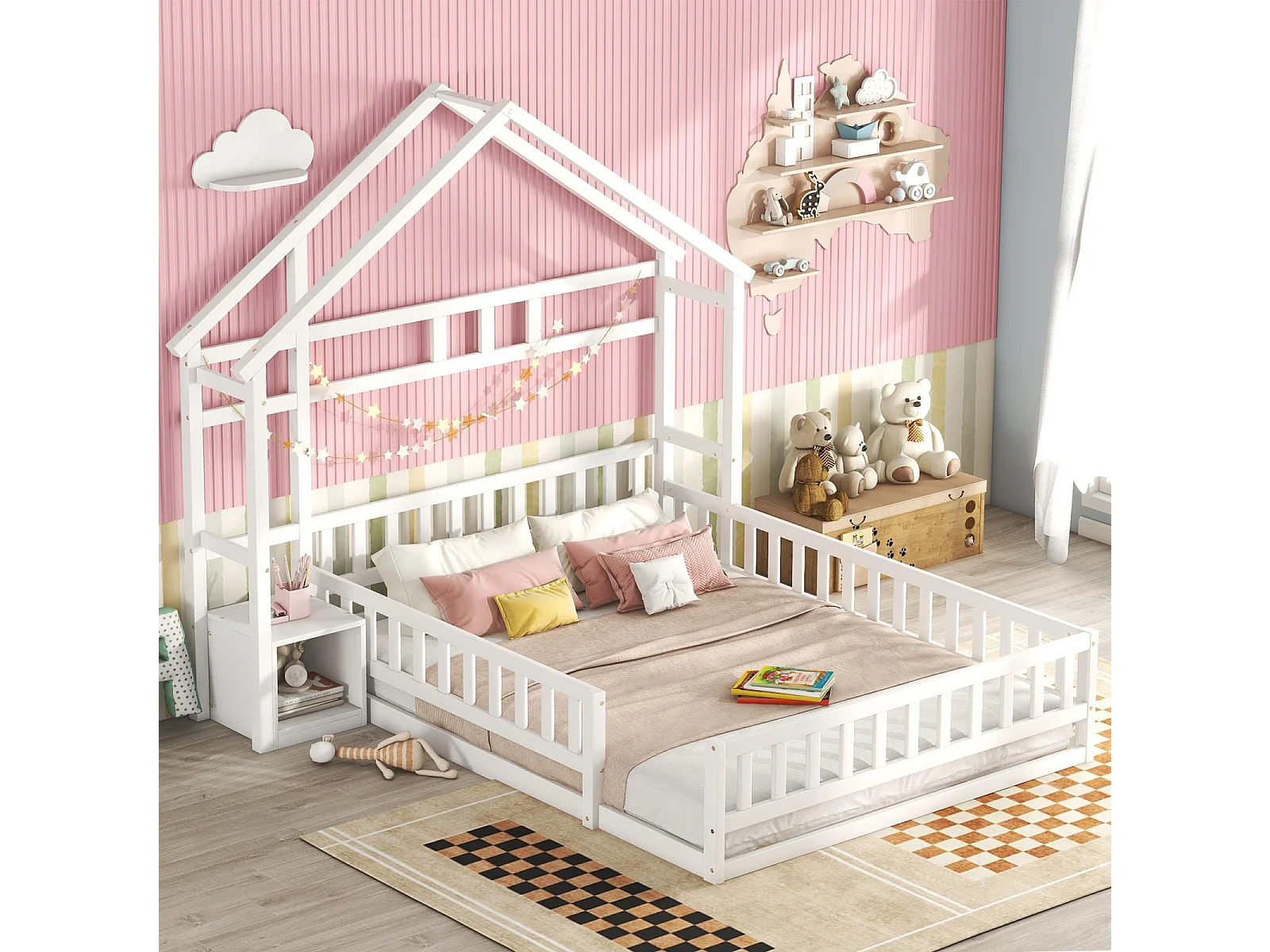 Camas infantis 140 x 200 cm, Camas de casa com grade, Camas infantis com mesas de cabeceira, Branco, Madeira maciça