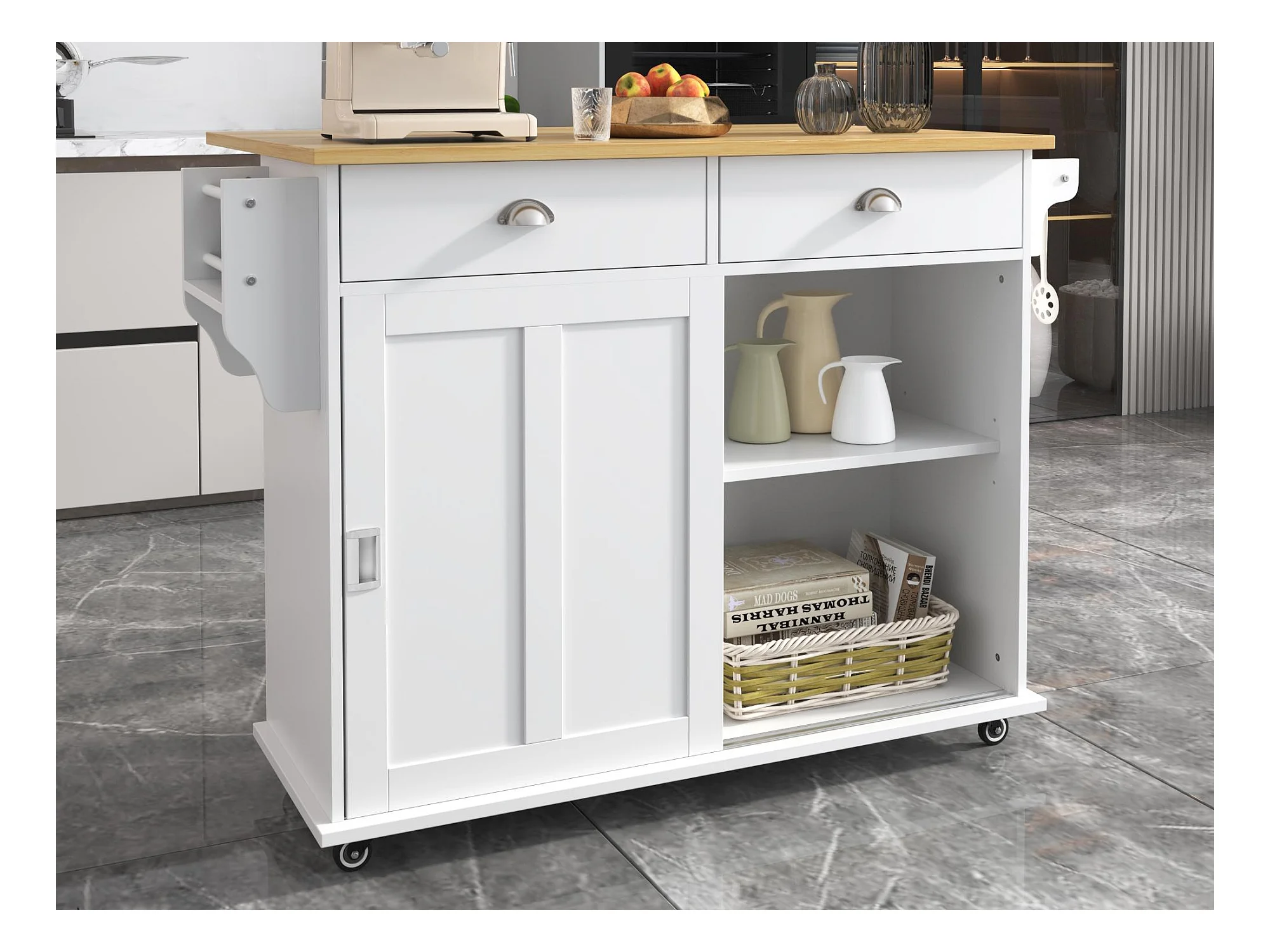 Ilha de cozinha móvel - tampo extensível - 2 gavetas e 2 portas - com prateleiras abertas - MDF - branco + natural
