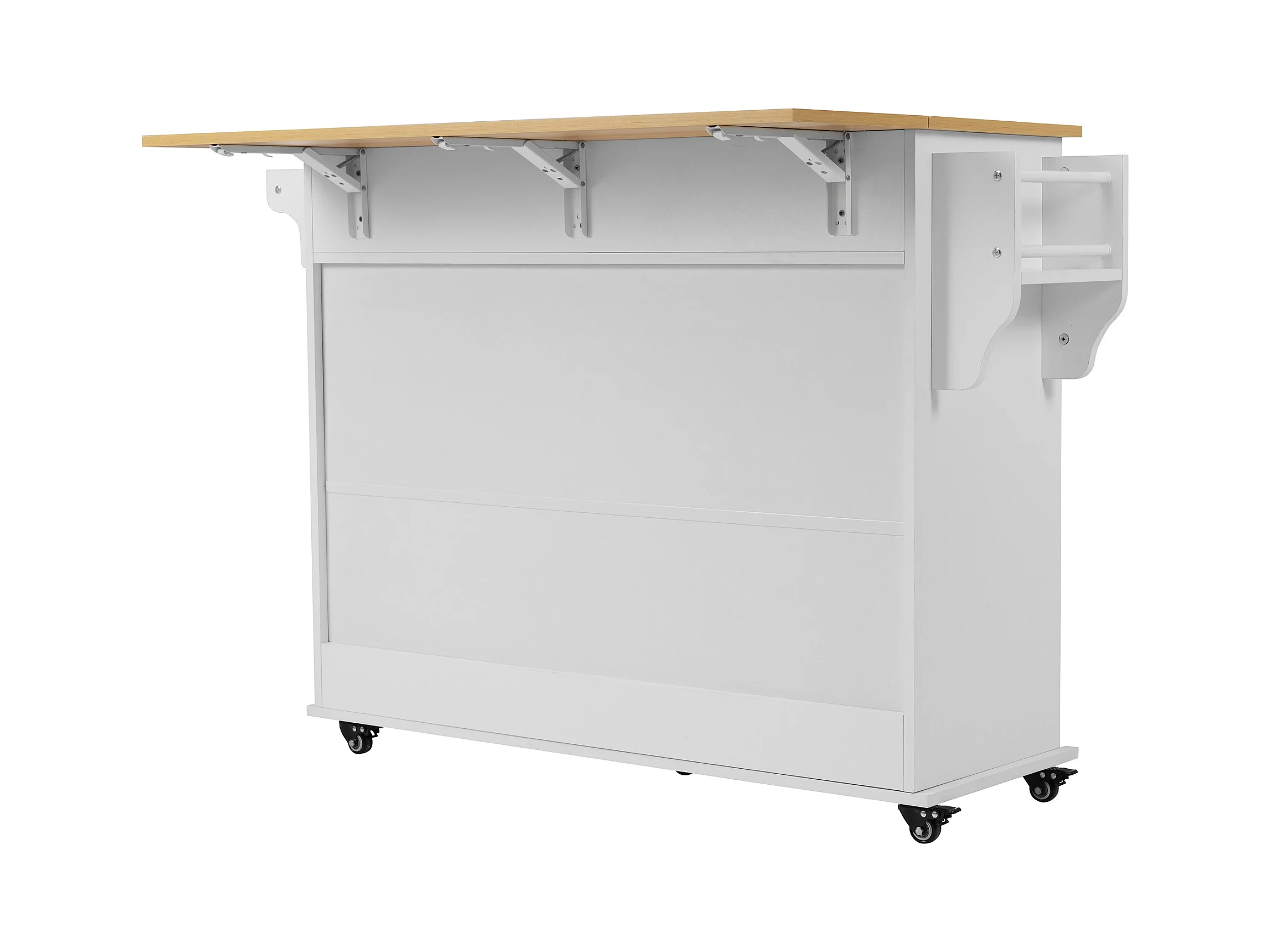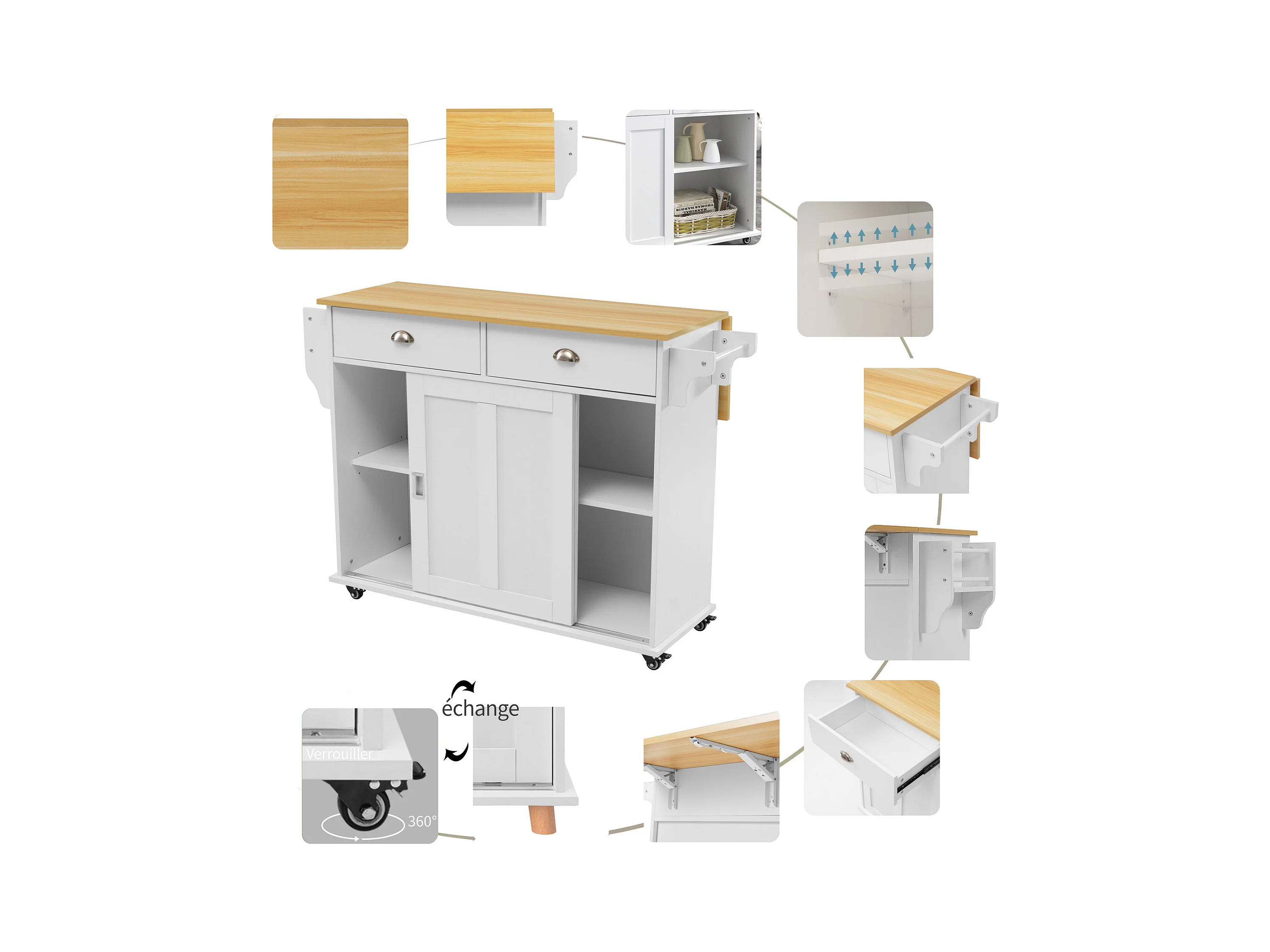 Ilha central de cozinha - carrinho com rodas e plano extensível - 2 gavetas e 4 portas - Branco