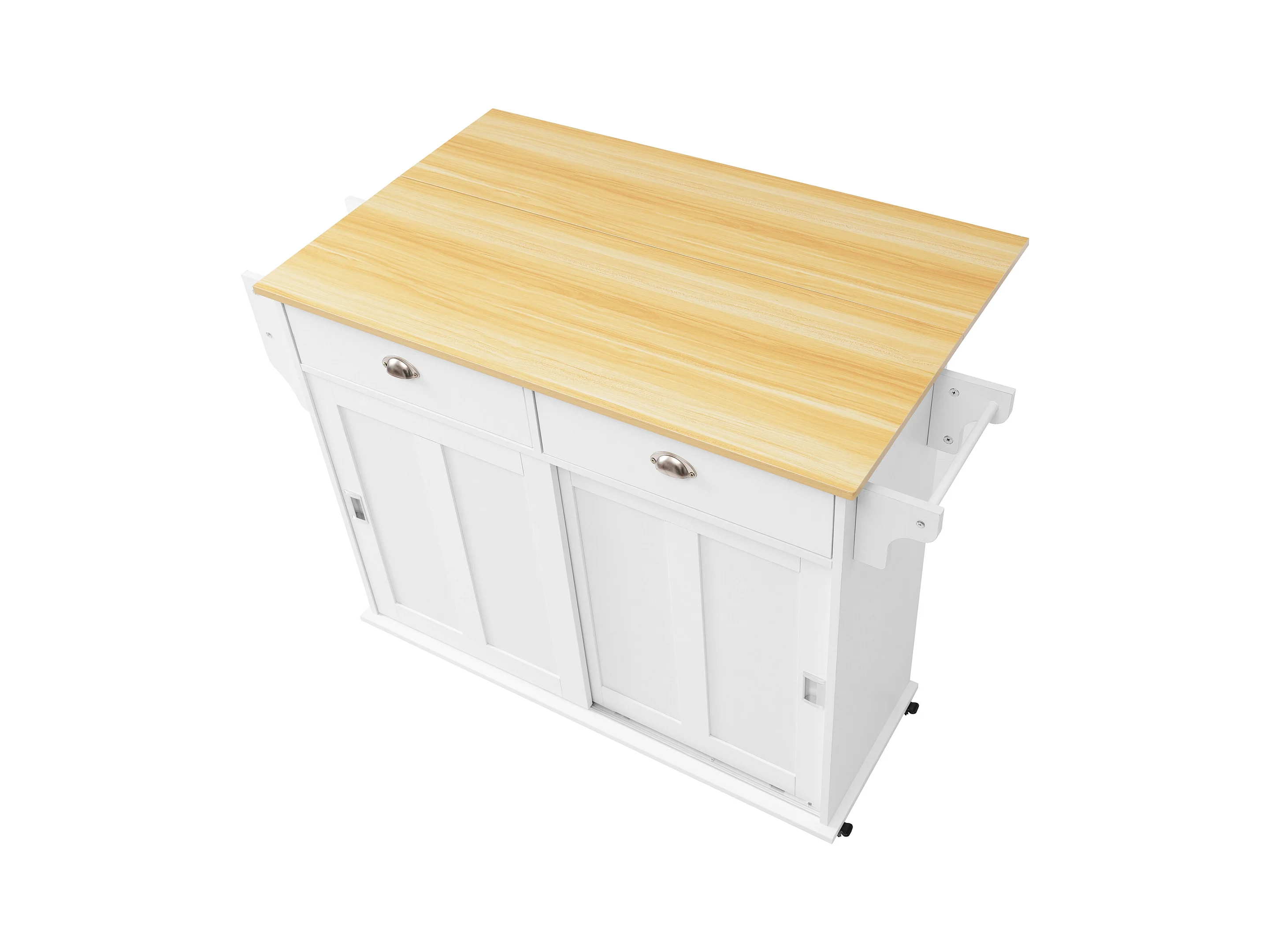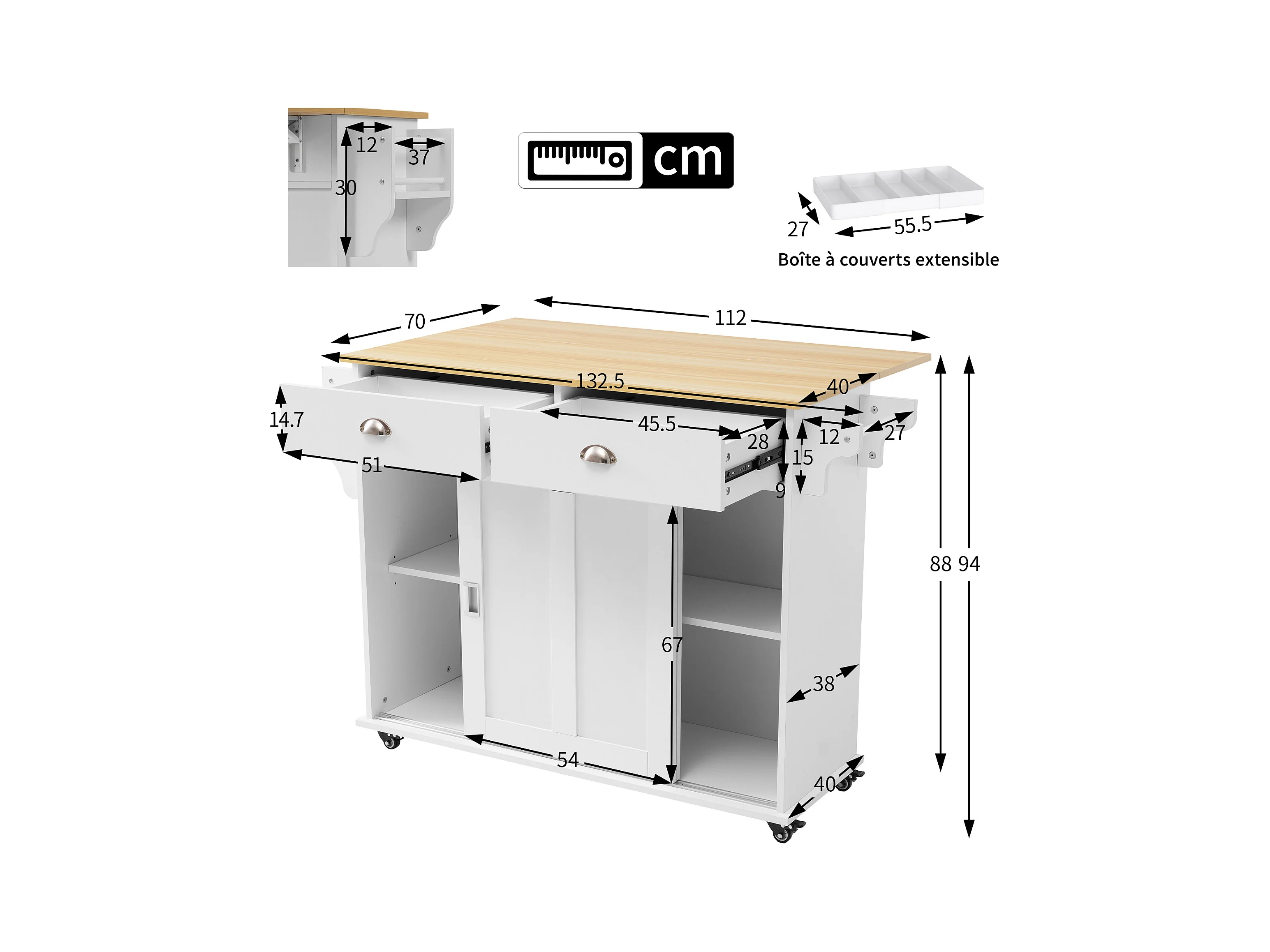 Ilha central de cozinha - carrinho com rodas e plano extensível - 2 gavetas e 2 portas - Branco