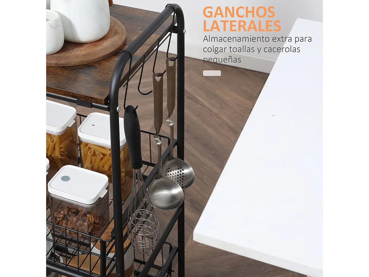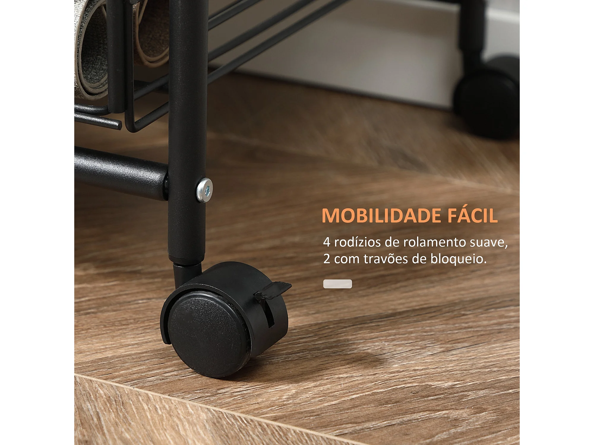 Carrinho de Cozinha Rústico com Rodas e Ganchos - 3 Níveis e 2 Cestas Práticas 60x38x85,5 cm