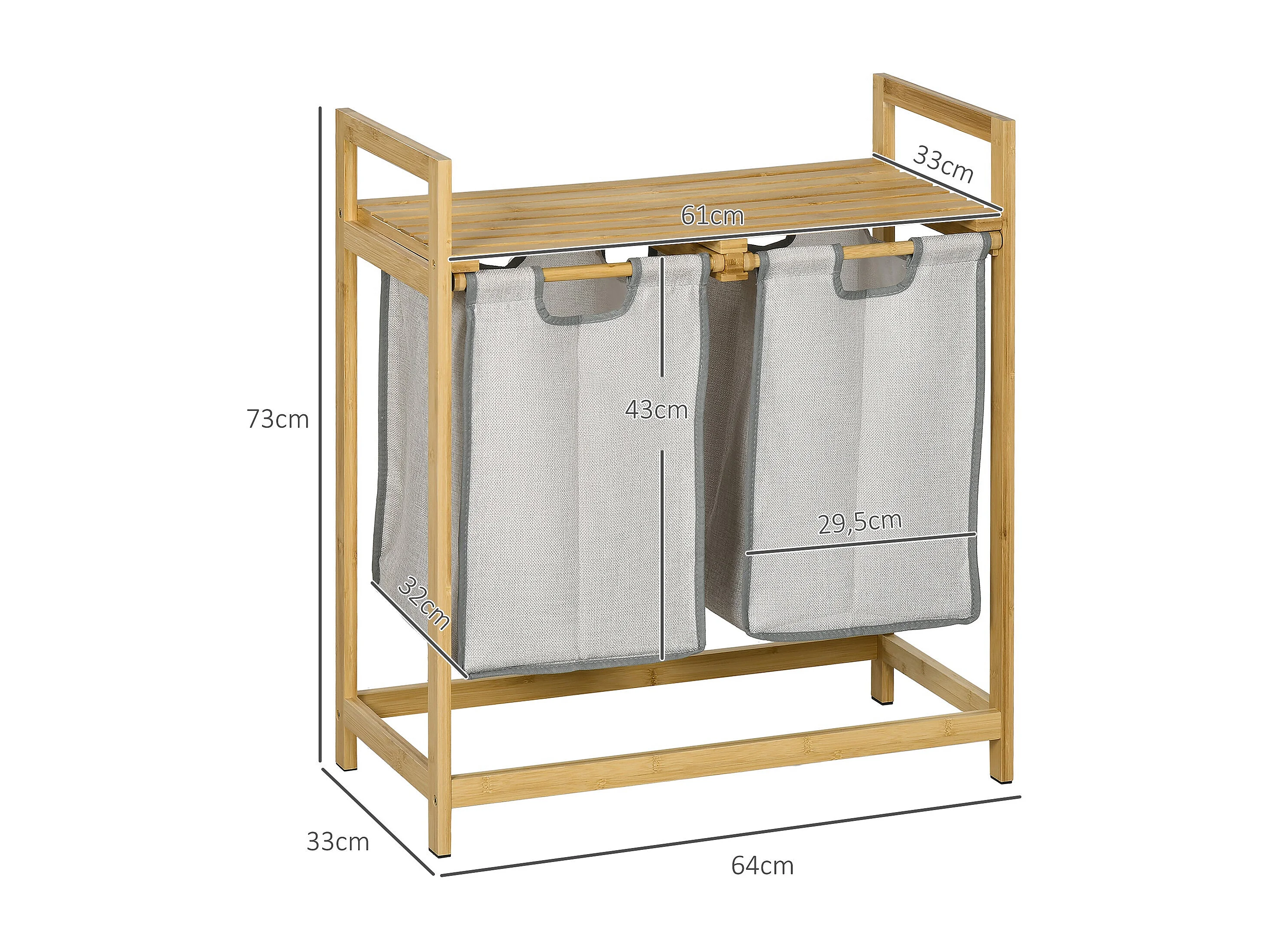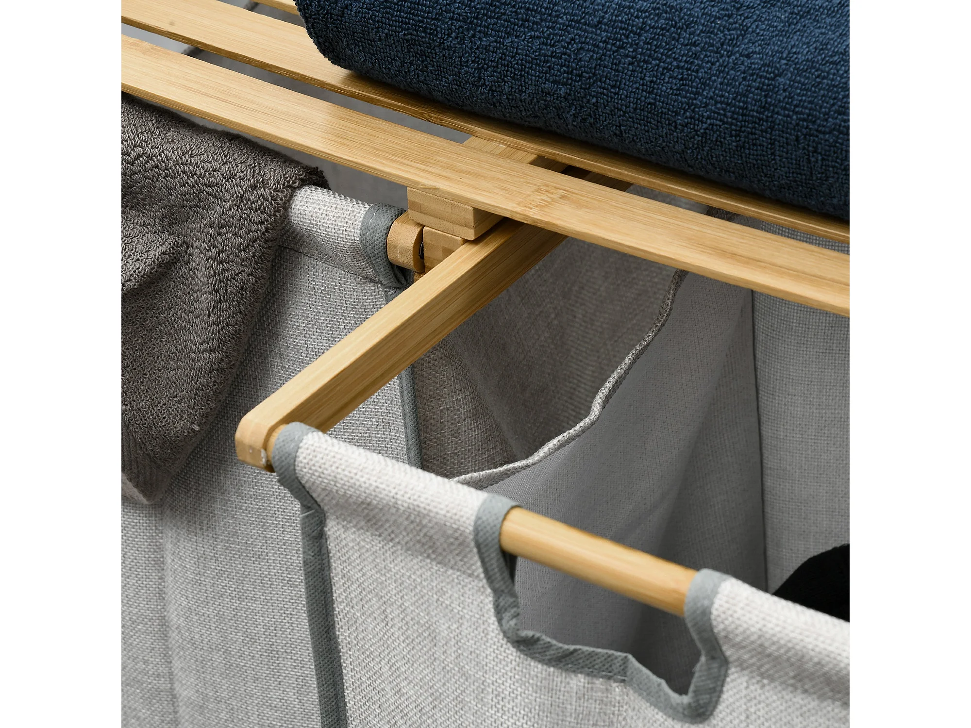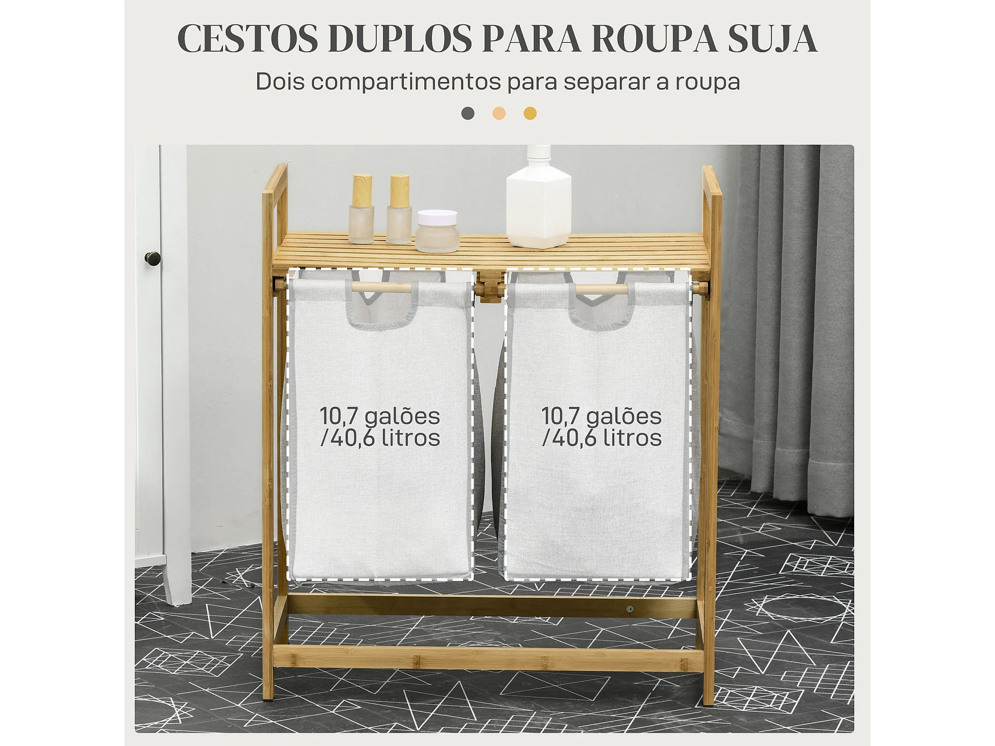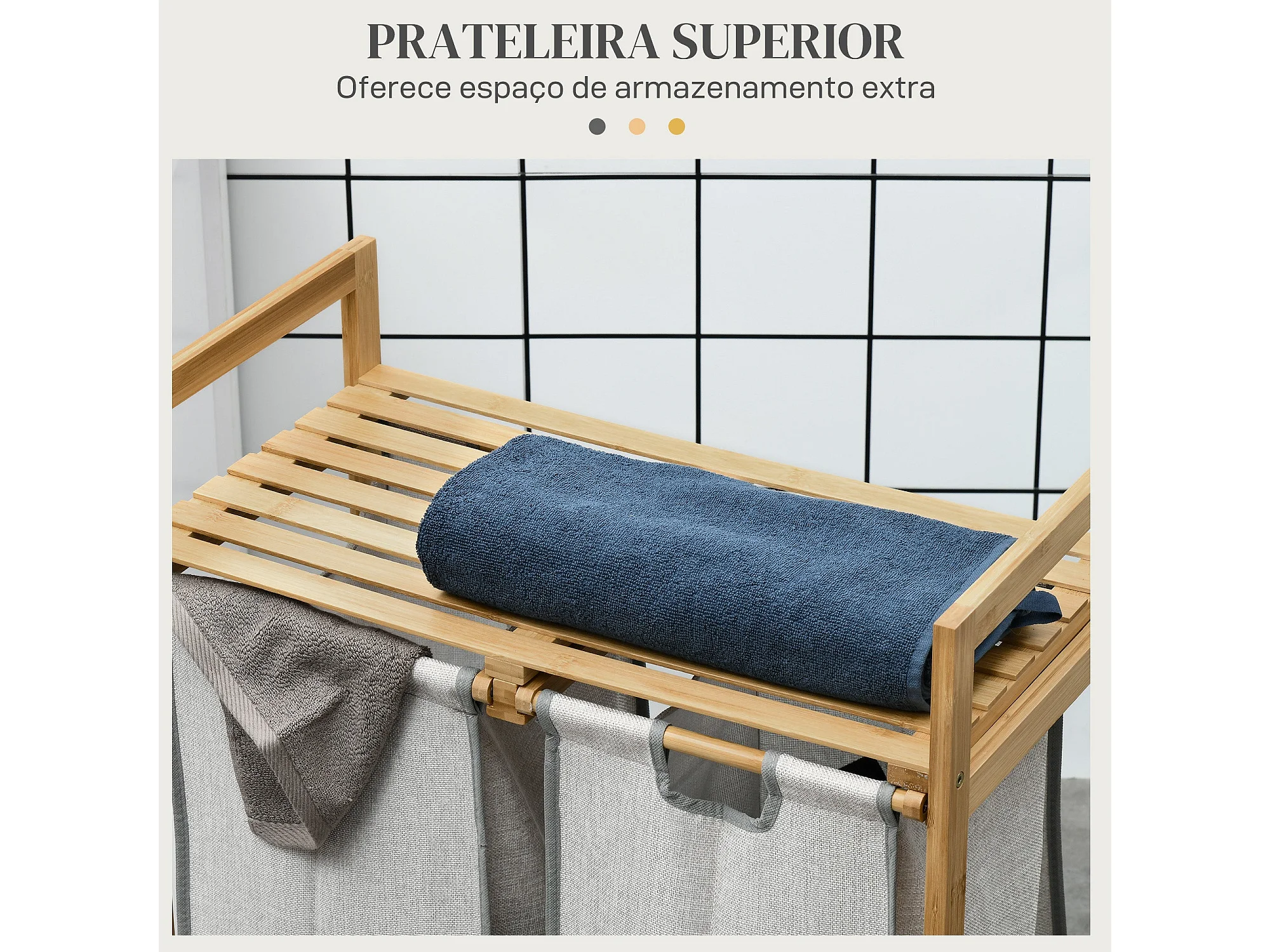 Cesto de Roupa de Bambu com 2 Bolsas Removíveis e Prateleira Superior para Armazenamento Prático