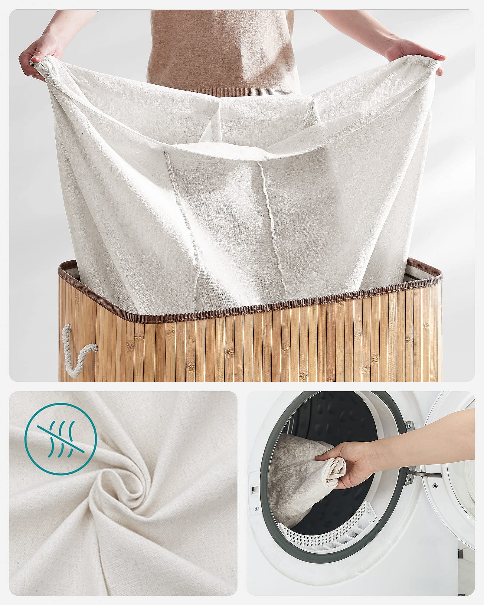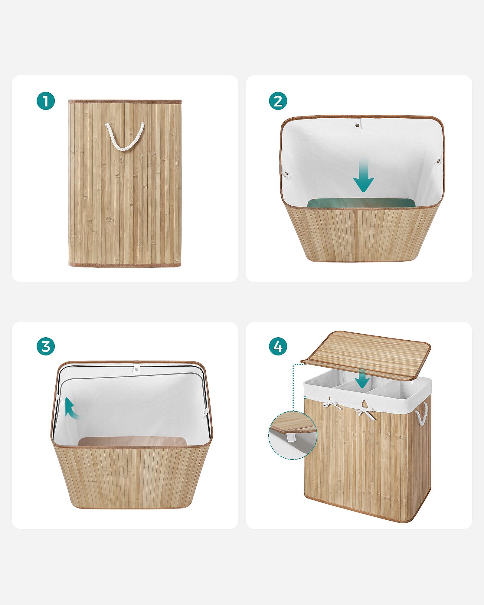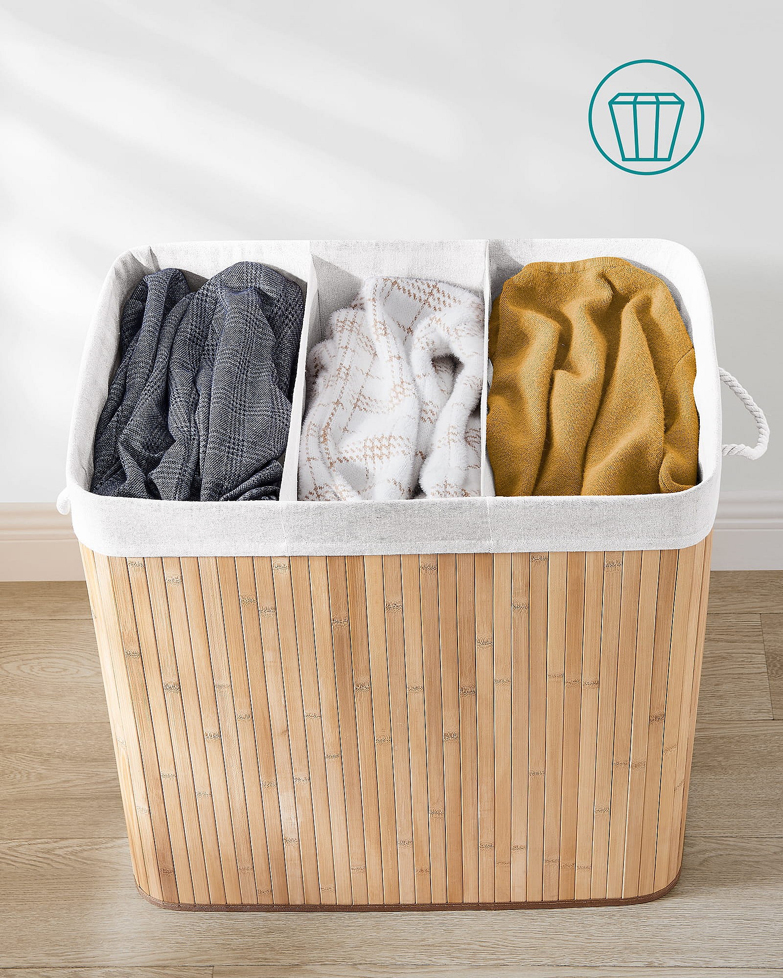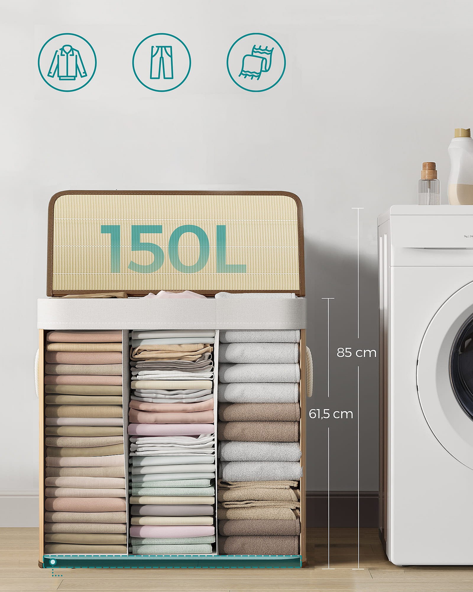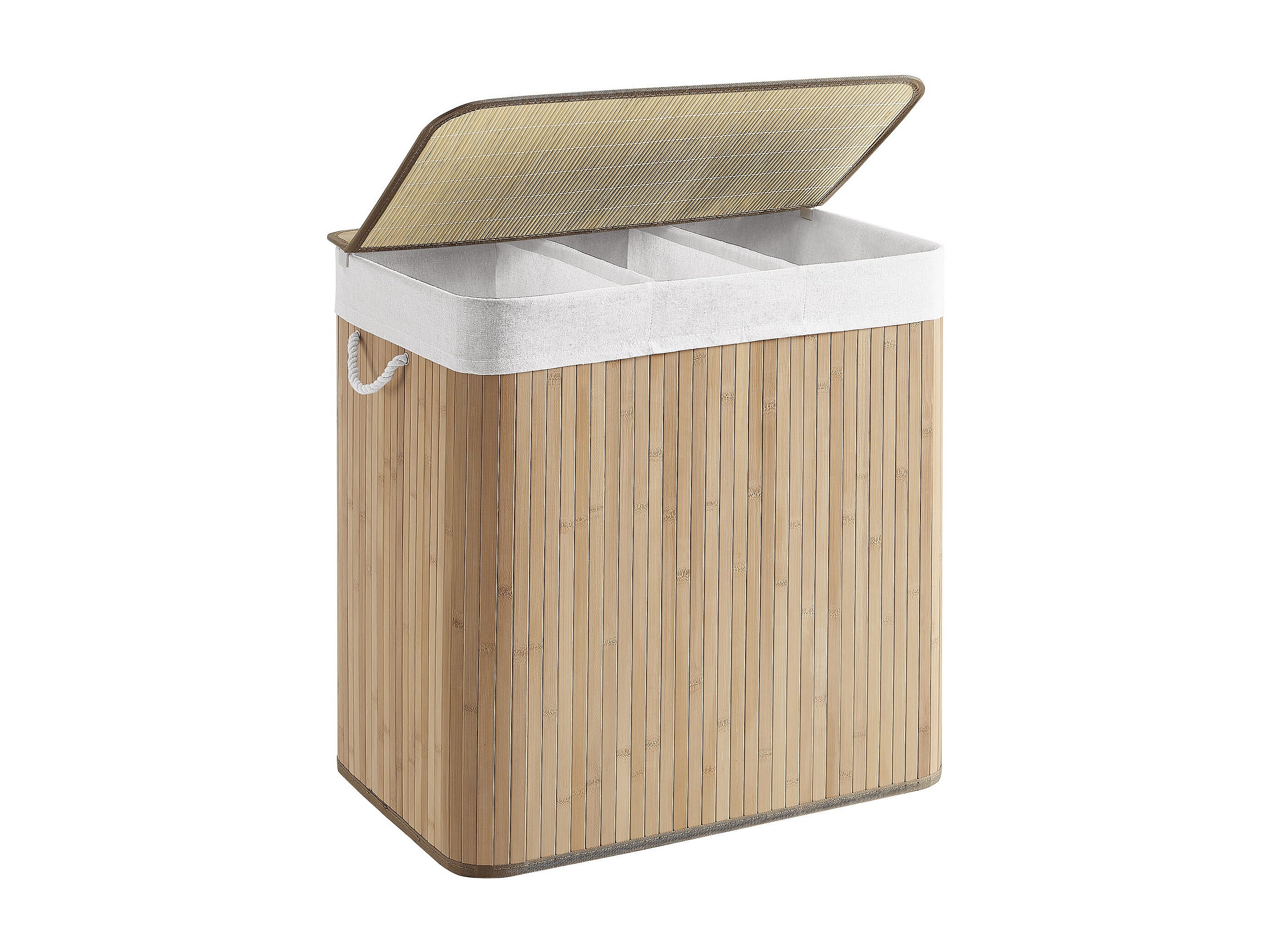 Cesto de roupa de bambu natural Valora com 3 compartimentos, 150 L e tampa