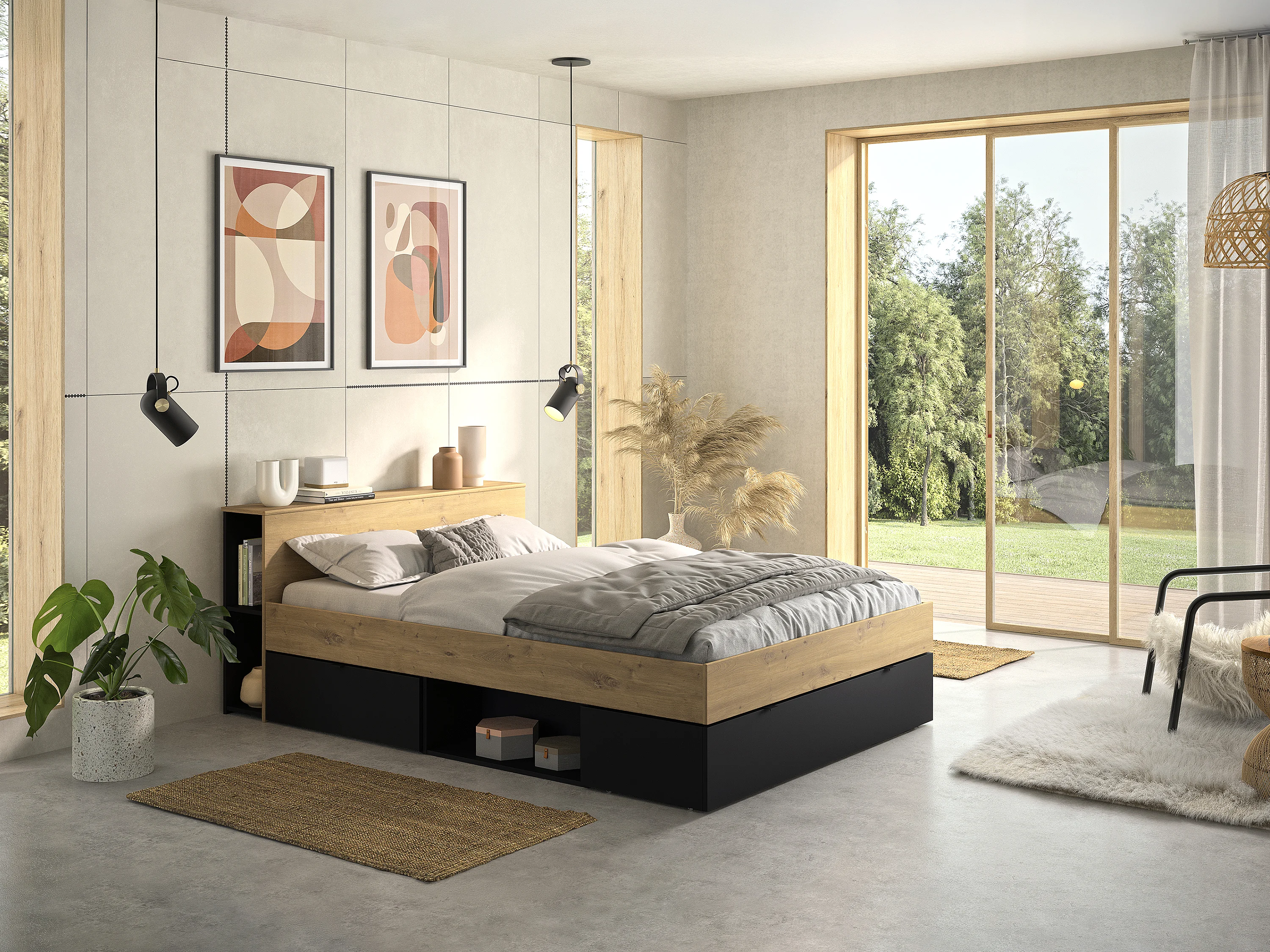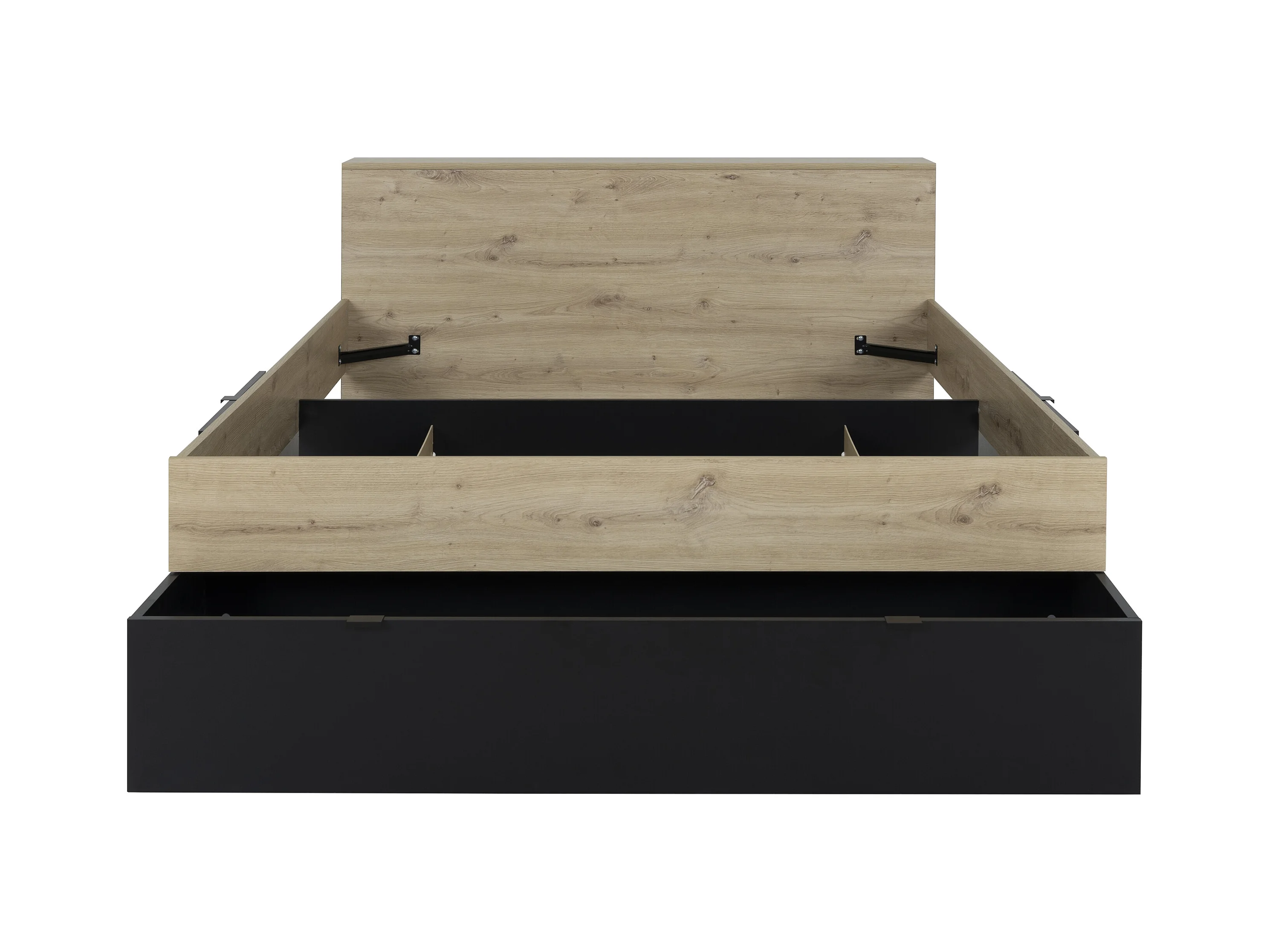 Cama 140x190 cm, 3 gavetas e 6 nichos natural e preto + estrado + colchão - CIKETO