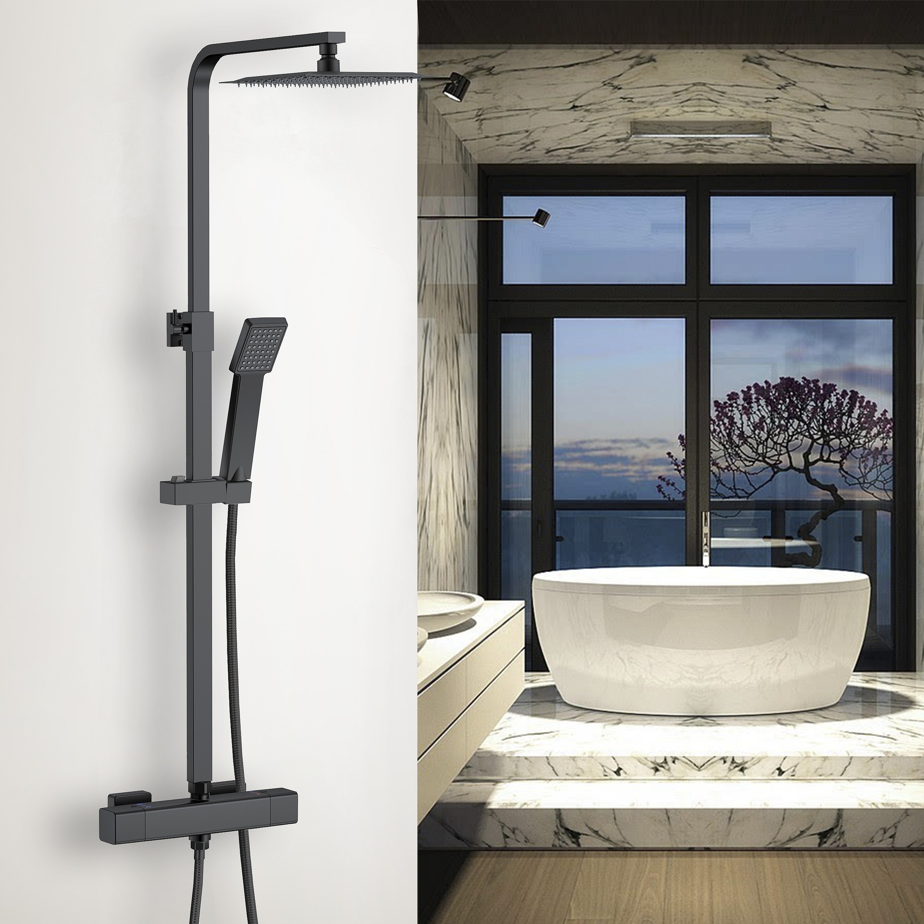 Coluna de chuveiro termostático Aica com termostato preto fosco com barra quadrada 764-1184mm chuveiro de banho