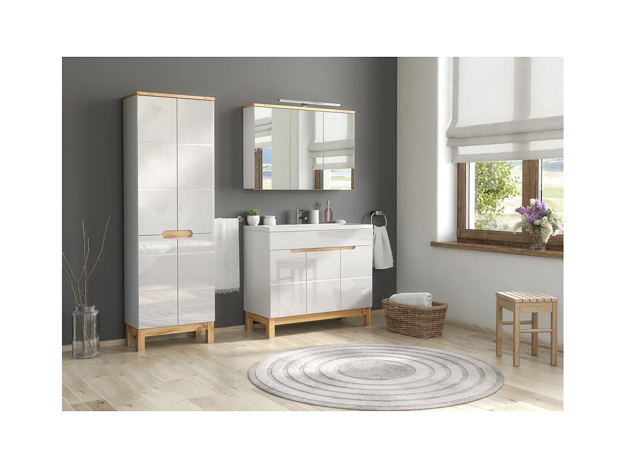 Coluna para banheiro NALYA 170 cm – Branco brilhante e carvalho claro – Móvel suspenso