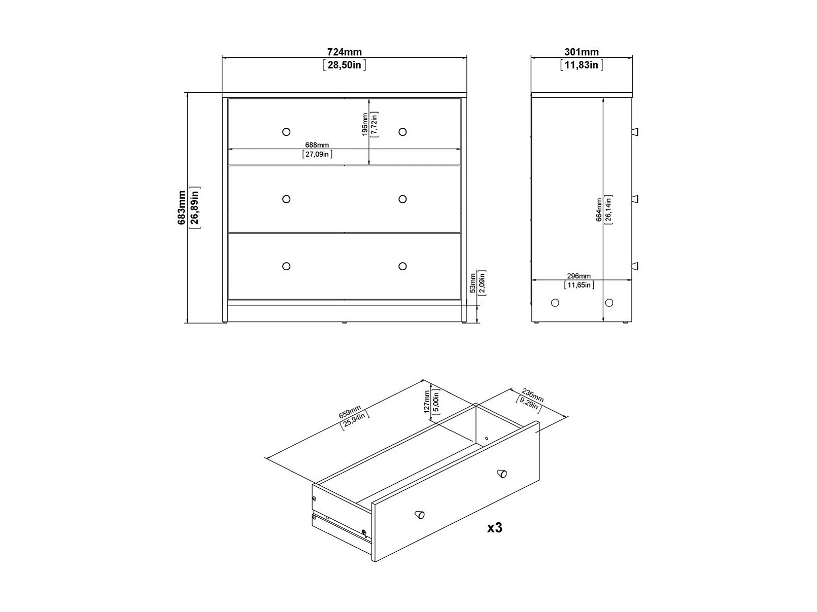 Como 3 gavetas L72,4 cm - LISE