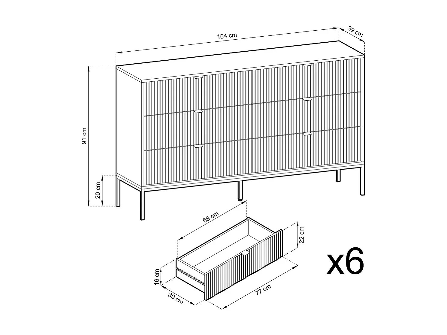 Cômoda: 6 gavetas, preto, pernas pretas, 154 x 39 x 83 cm, puxadores dourados