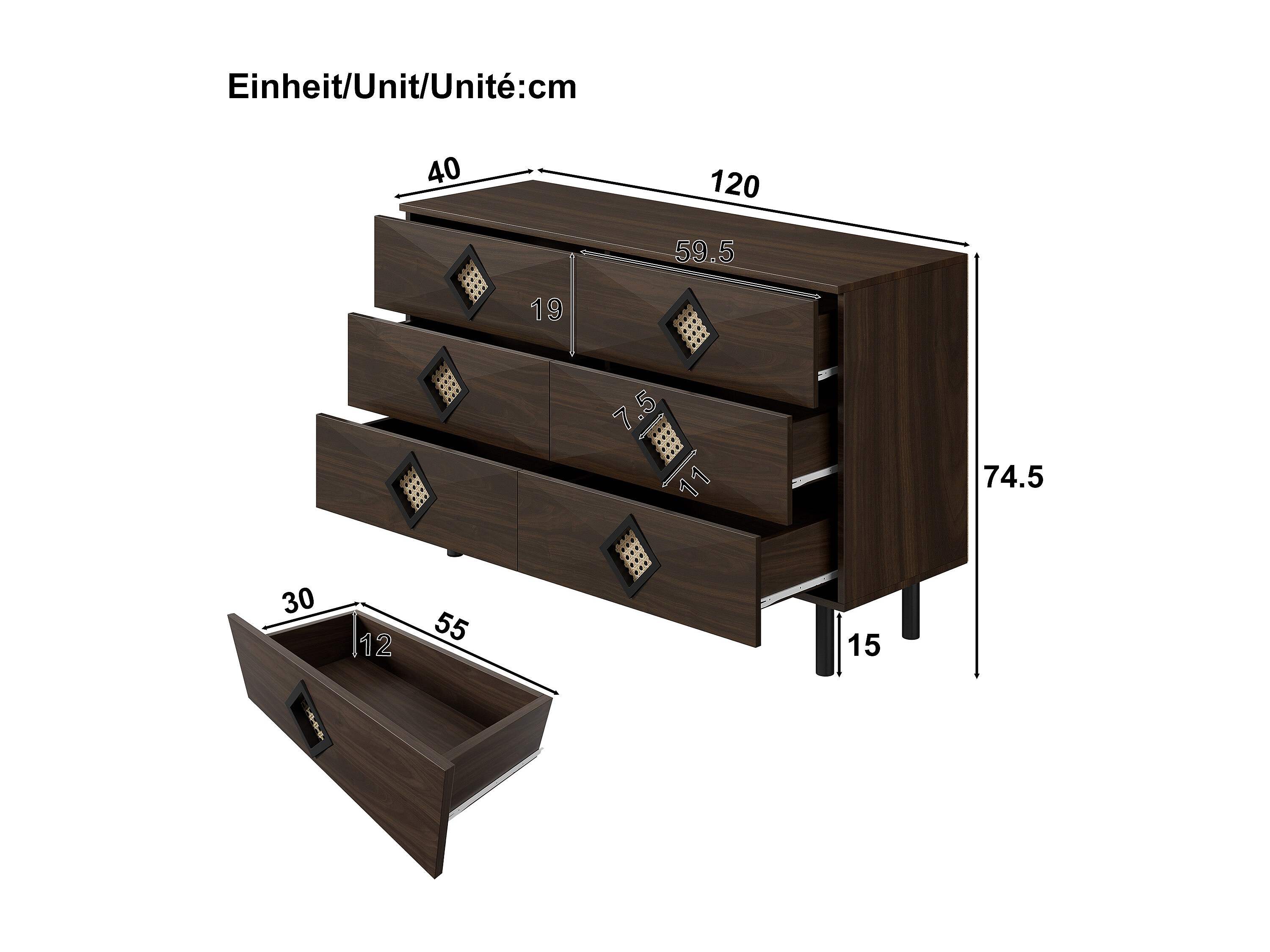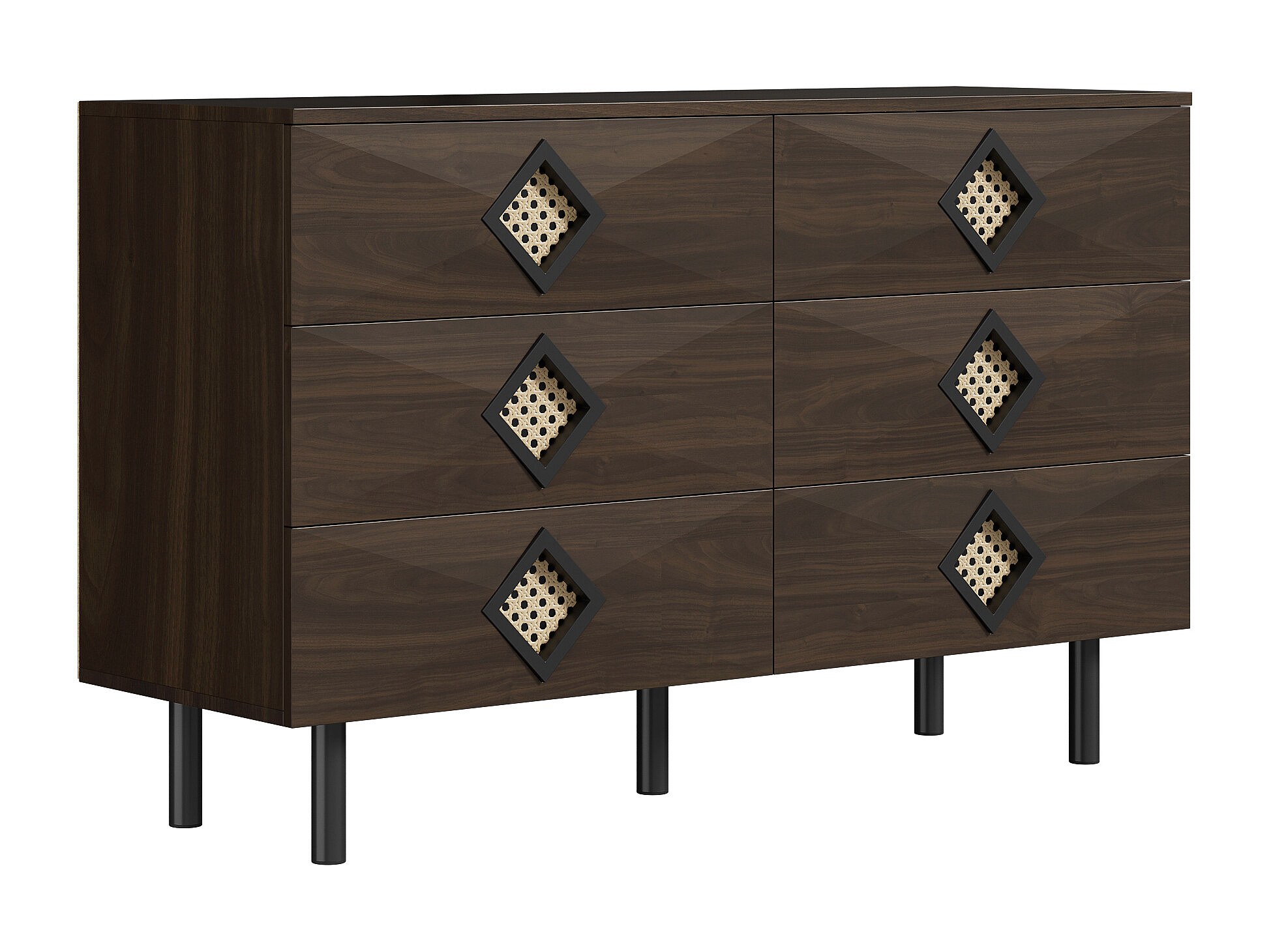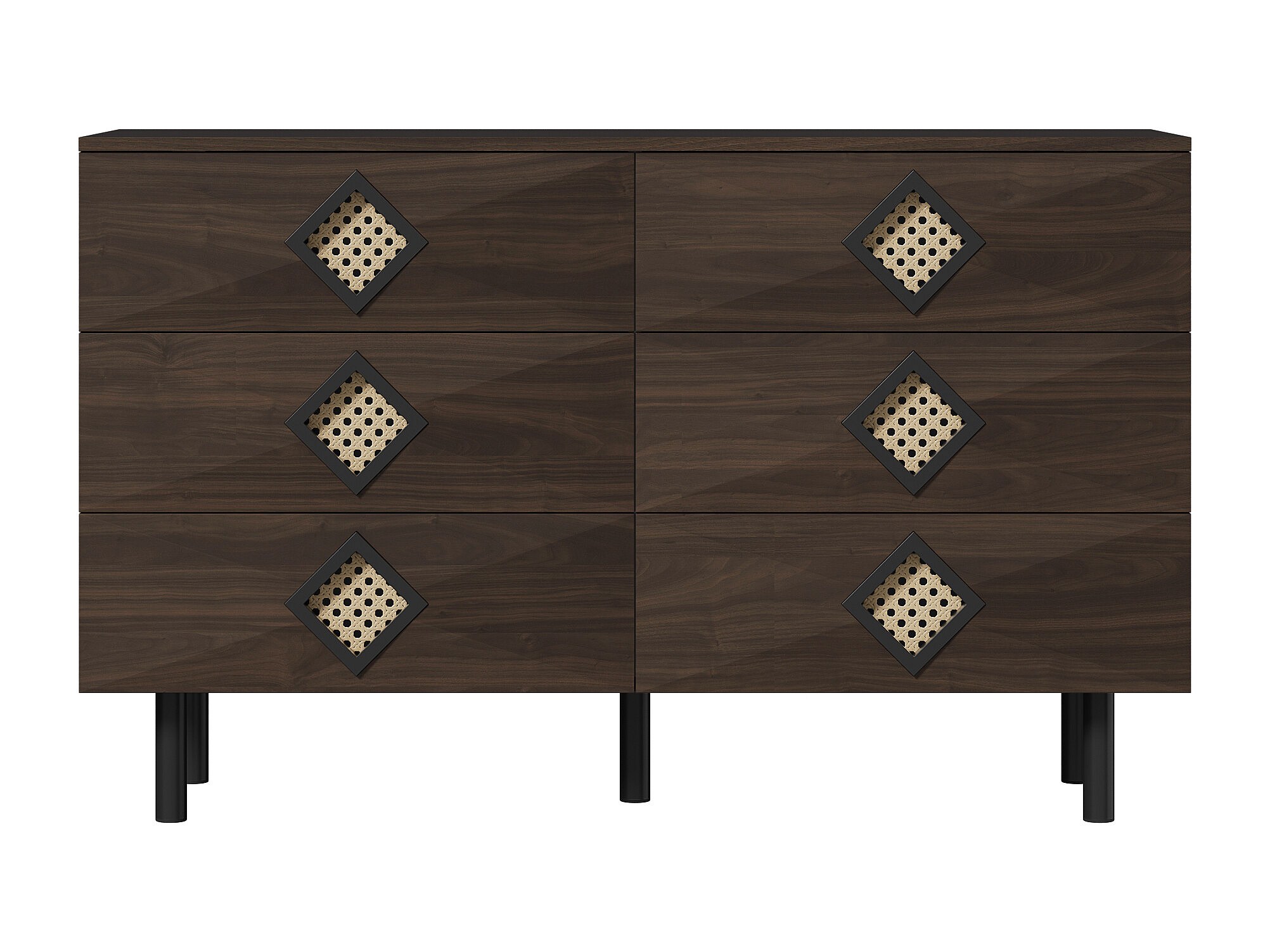 Cómoda baixa em nogueira com 6 gavetas, puxadores em rattan em forma de losango 120x40x74,5cm