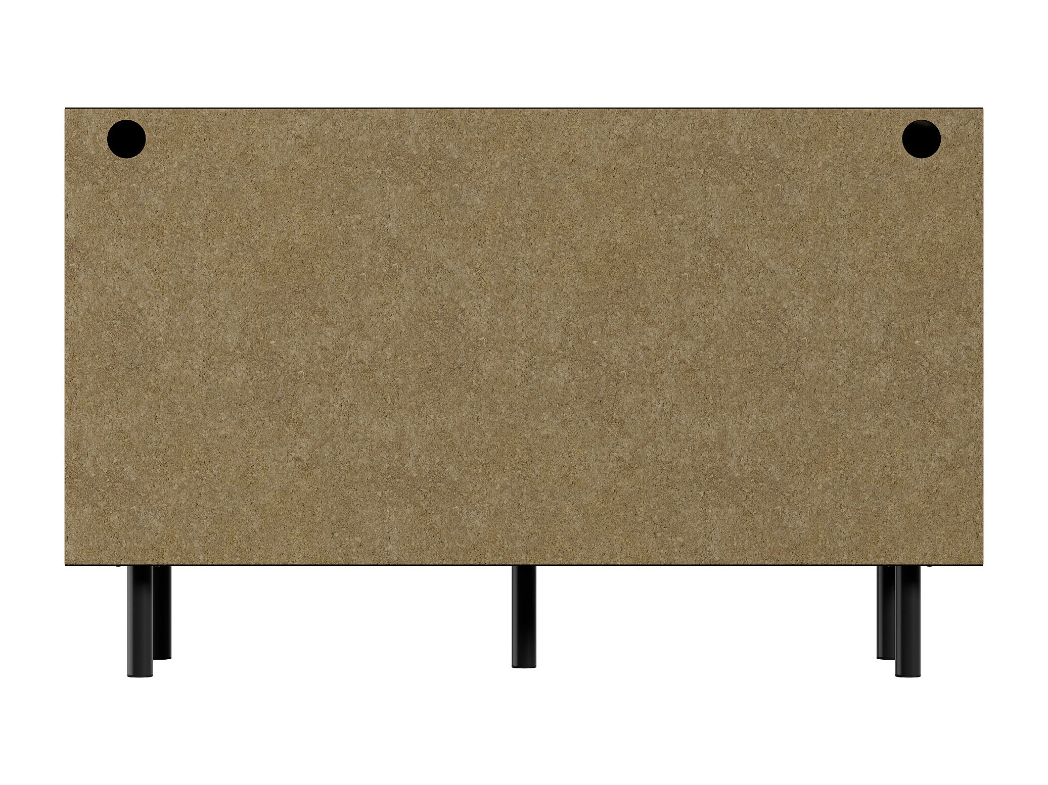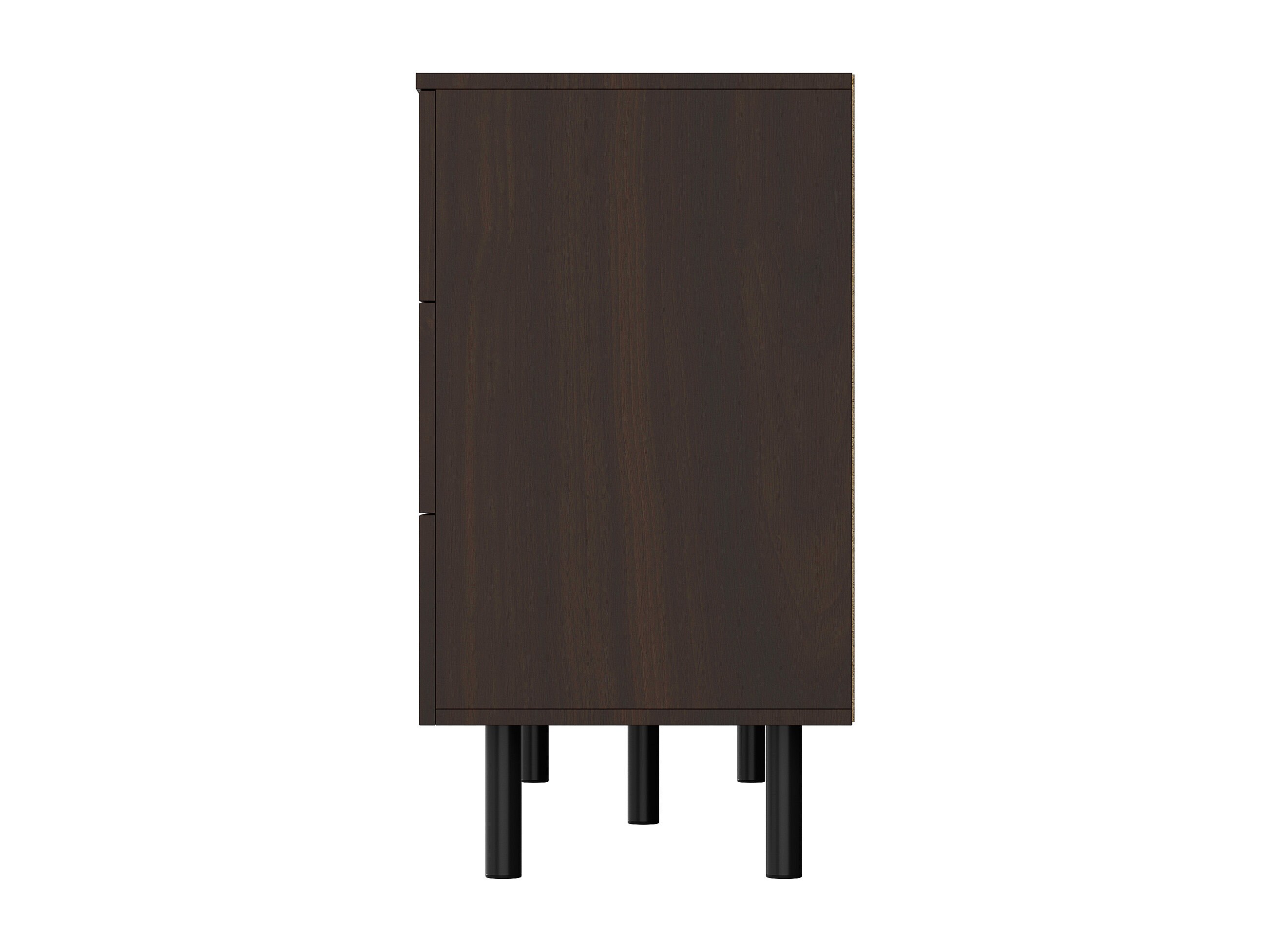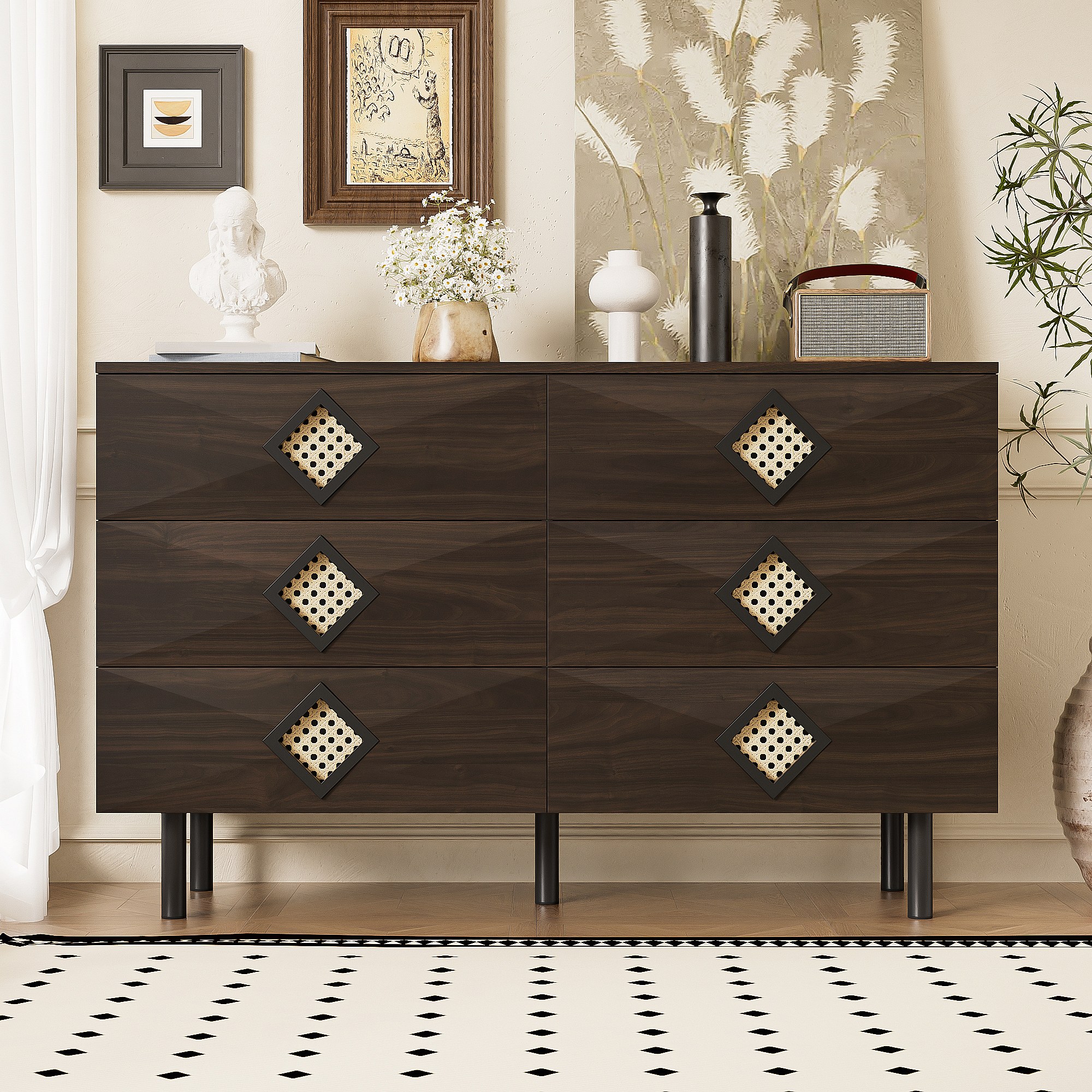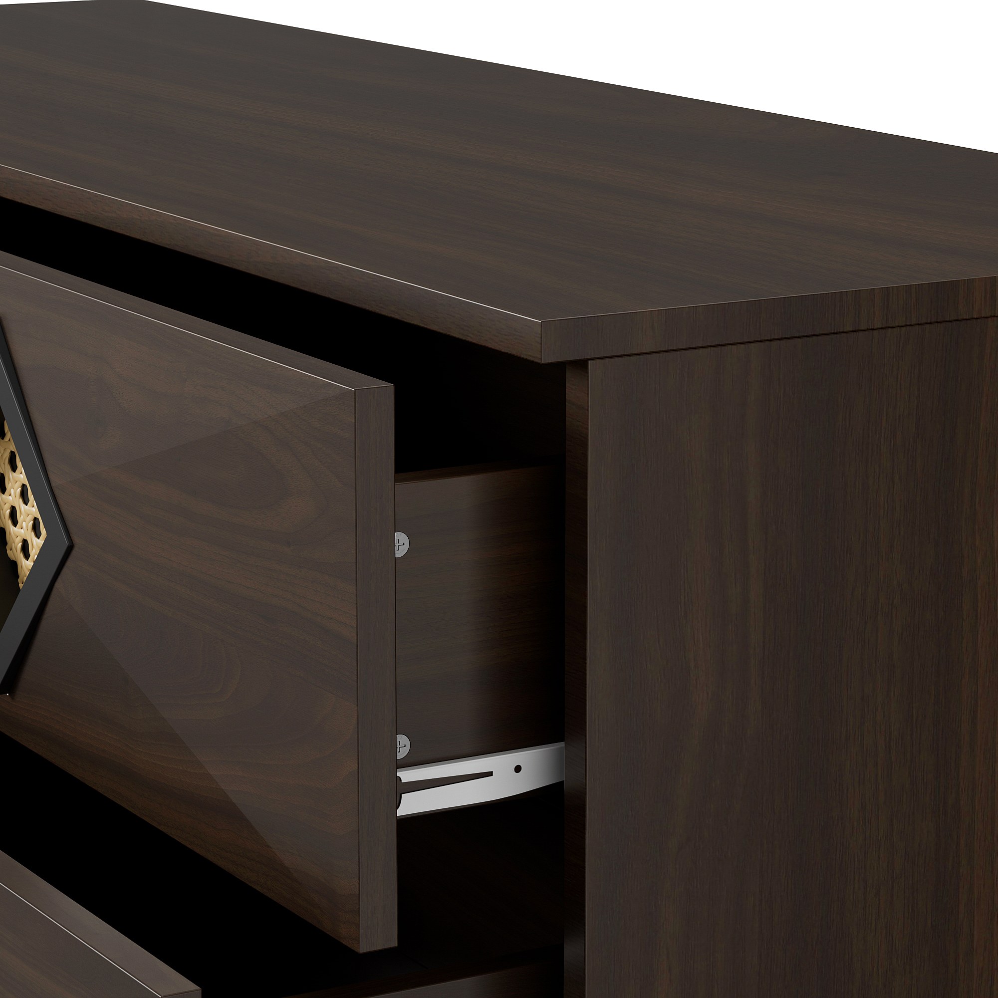Cómoda baixa em nogueira com 6 gavetas, puxadores em rattan em forma de losango 120x40x74,5cm