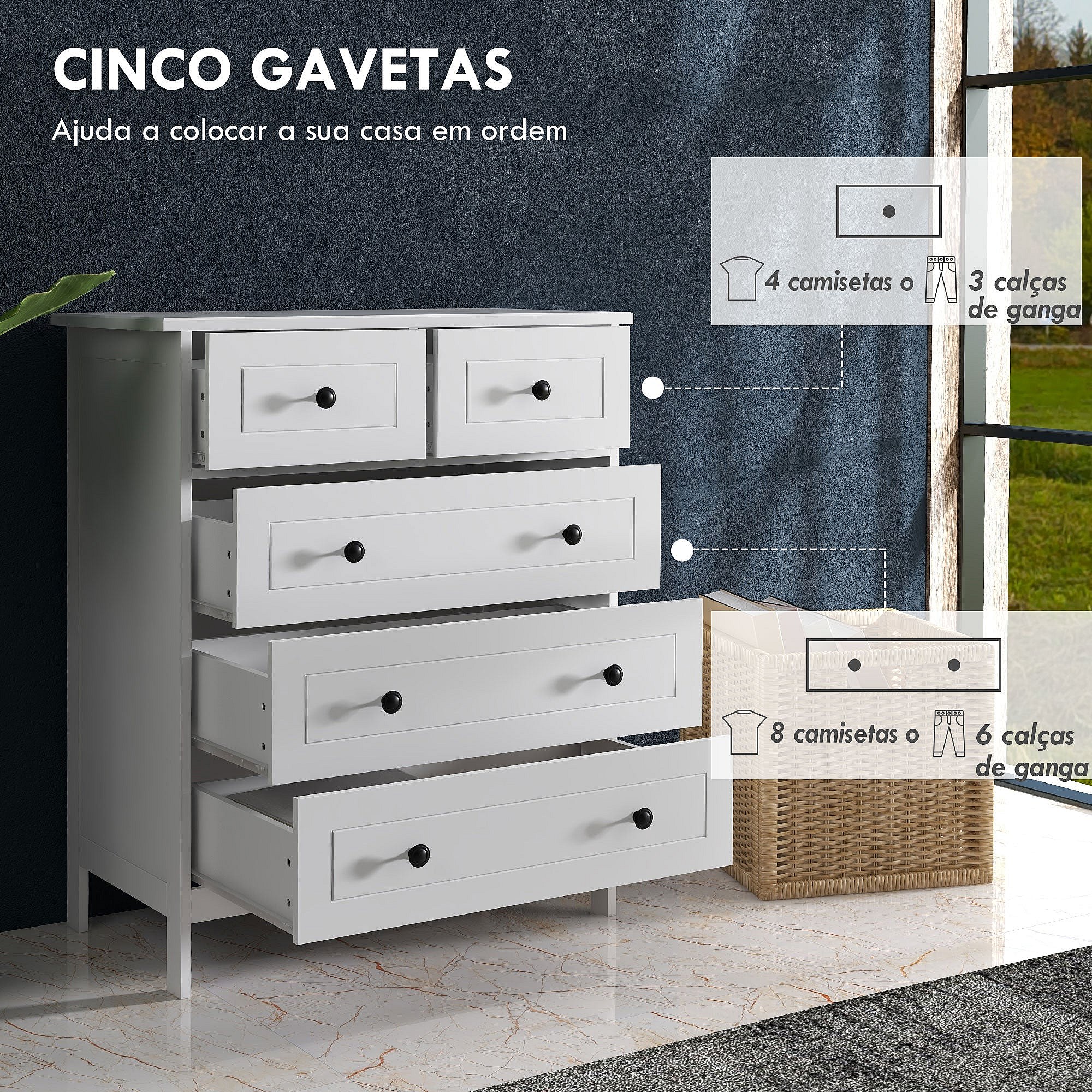 Cómoda Branca Moderna com 5 Gavetas para Quarto e Sala de Estar 74x40x91 cm