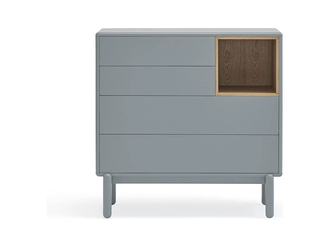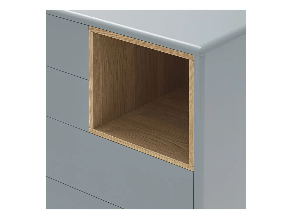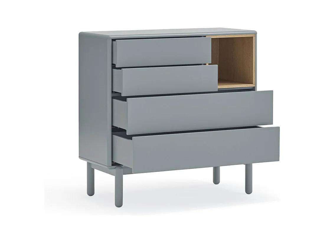 Cômoda de 4 gavetas na cor carvalho e cinza, coleção NEMO. Acabamentos em ripas cinzas.