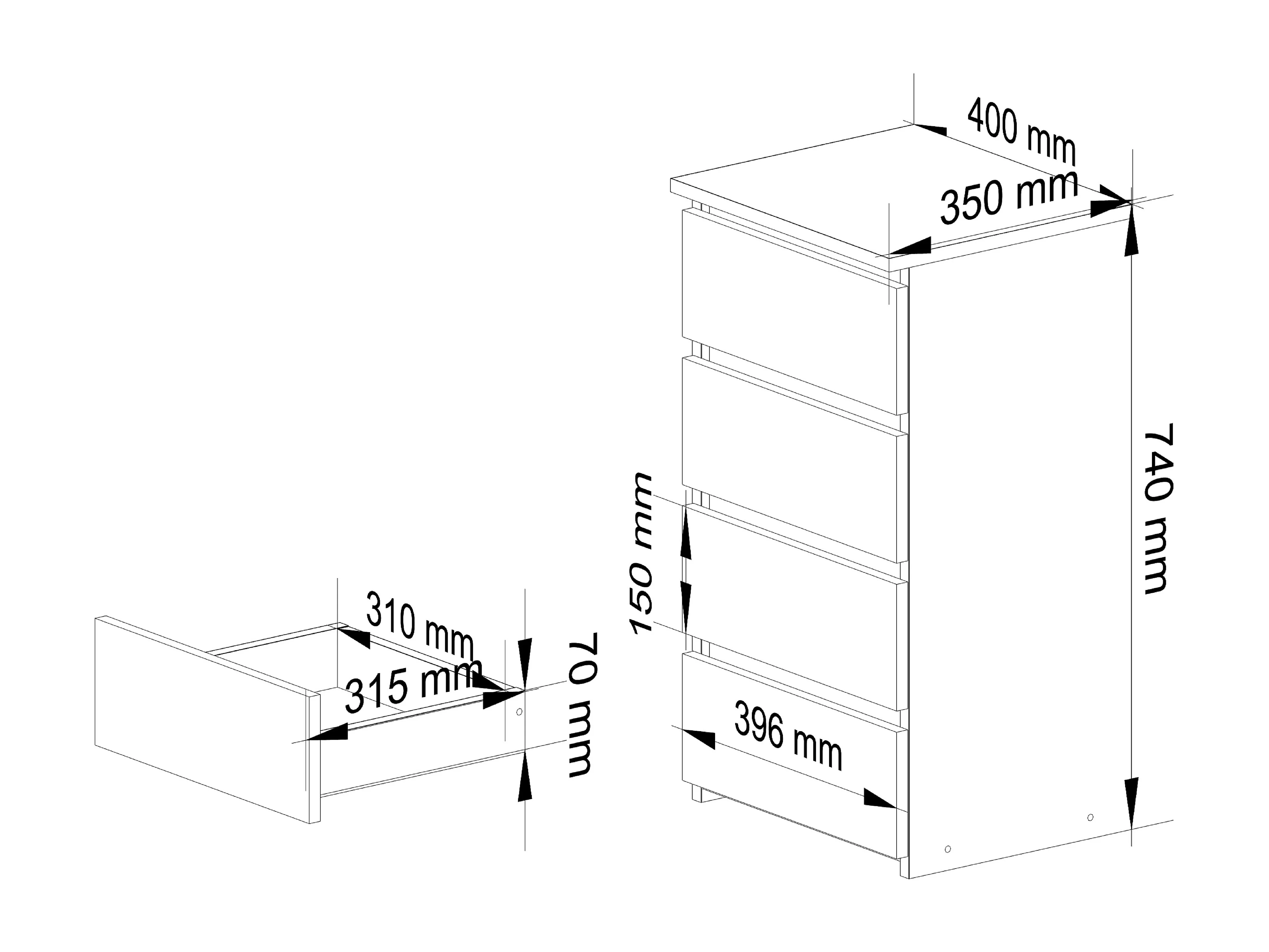 Cômoda Moderna MOBI K-04, Branco e Preto, 4 Gavetas, 60x73x37 cm