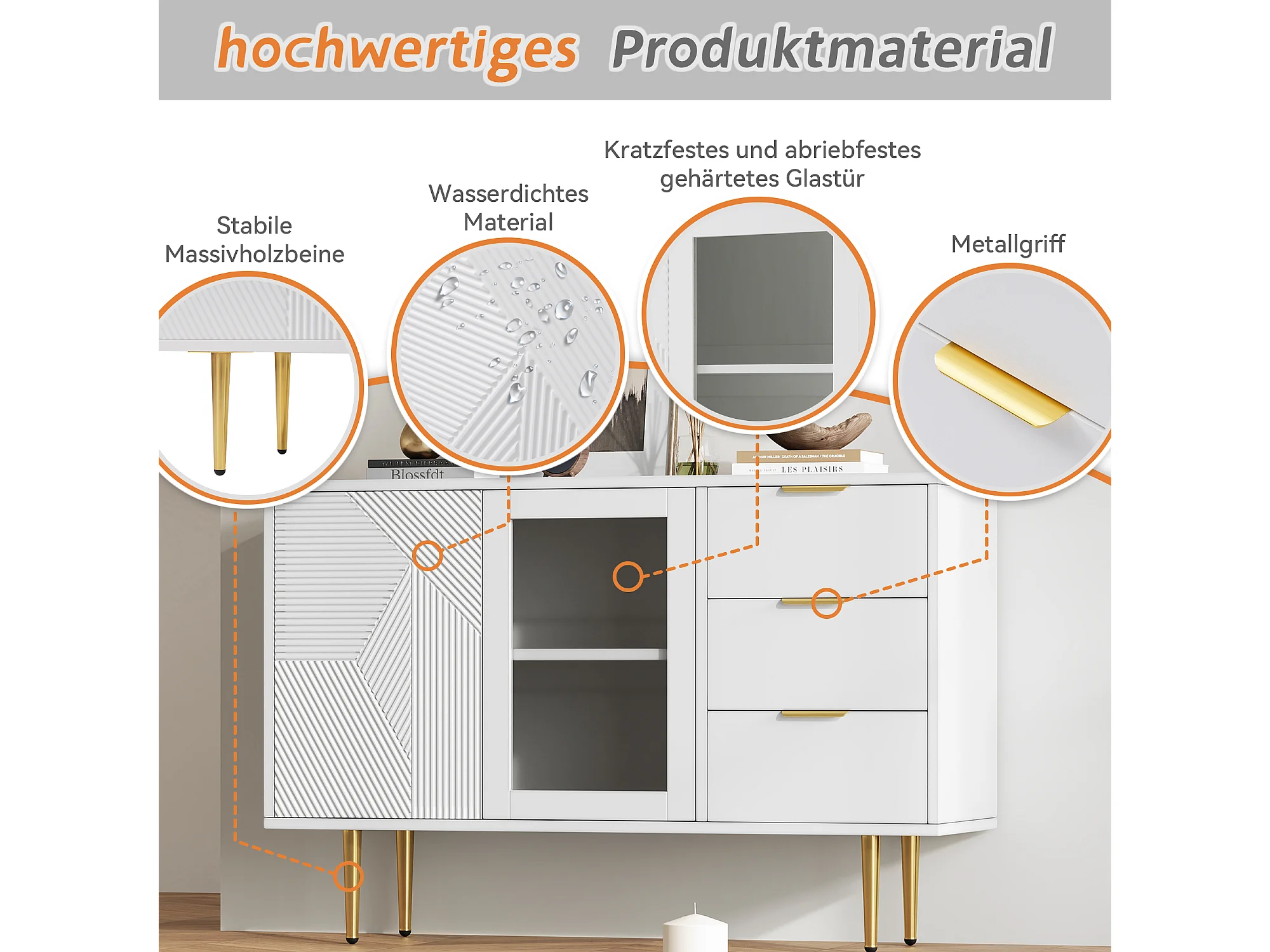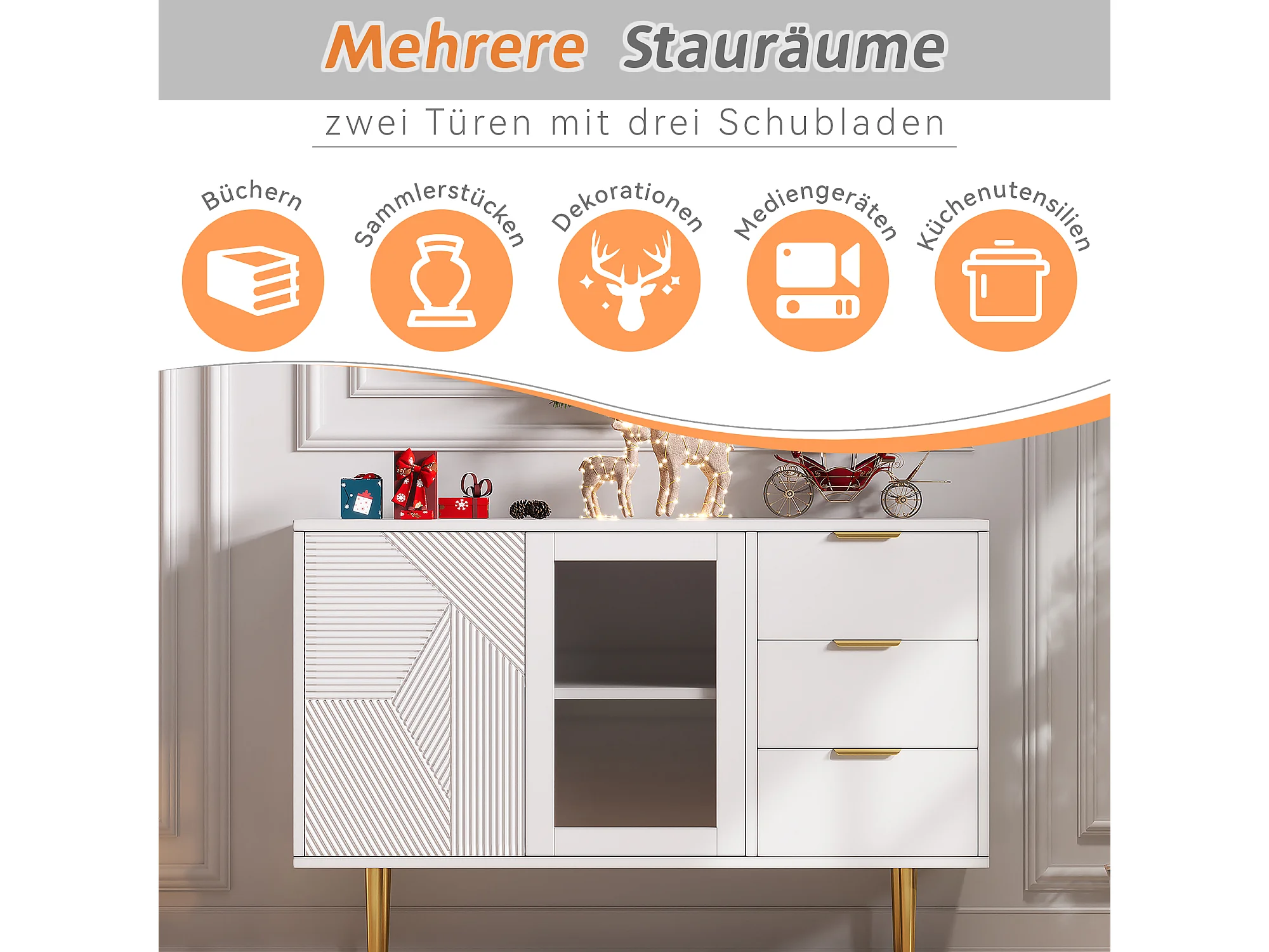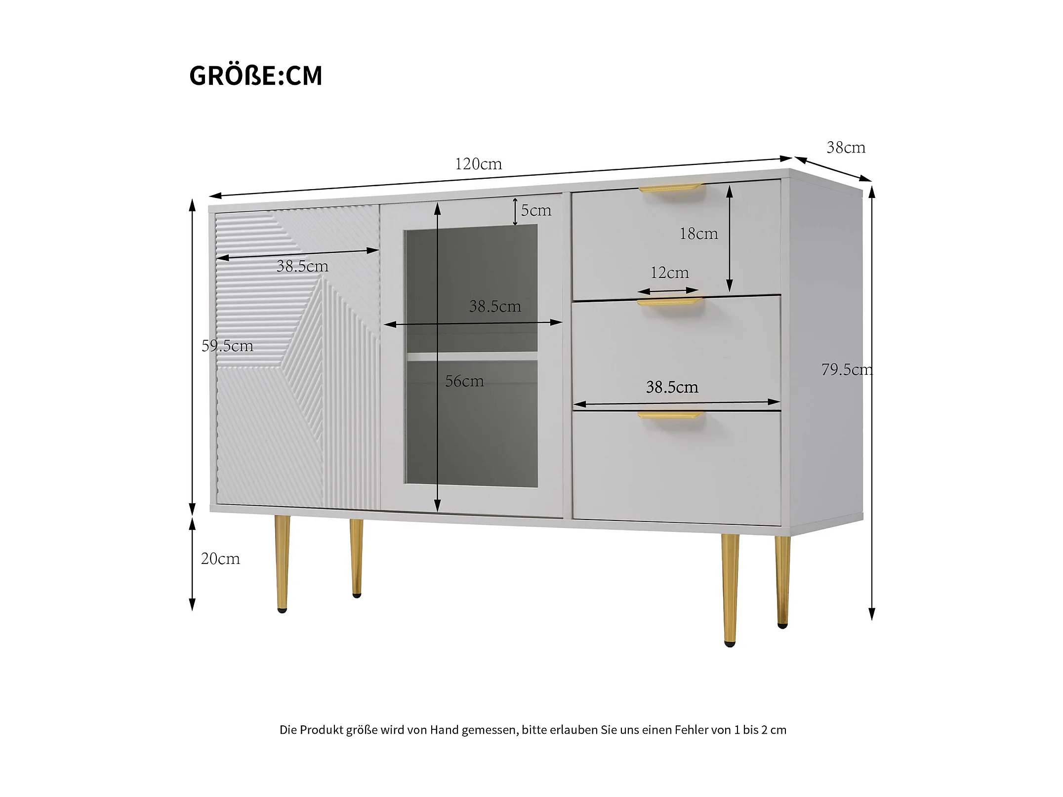 Cômoda com 3 gavetas e 2 portas, com pés de madeira e portas de vidro, aglomerado, branco, 120 x 38 x 79,5 cm