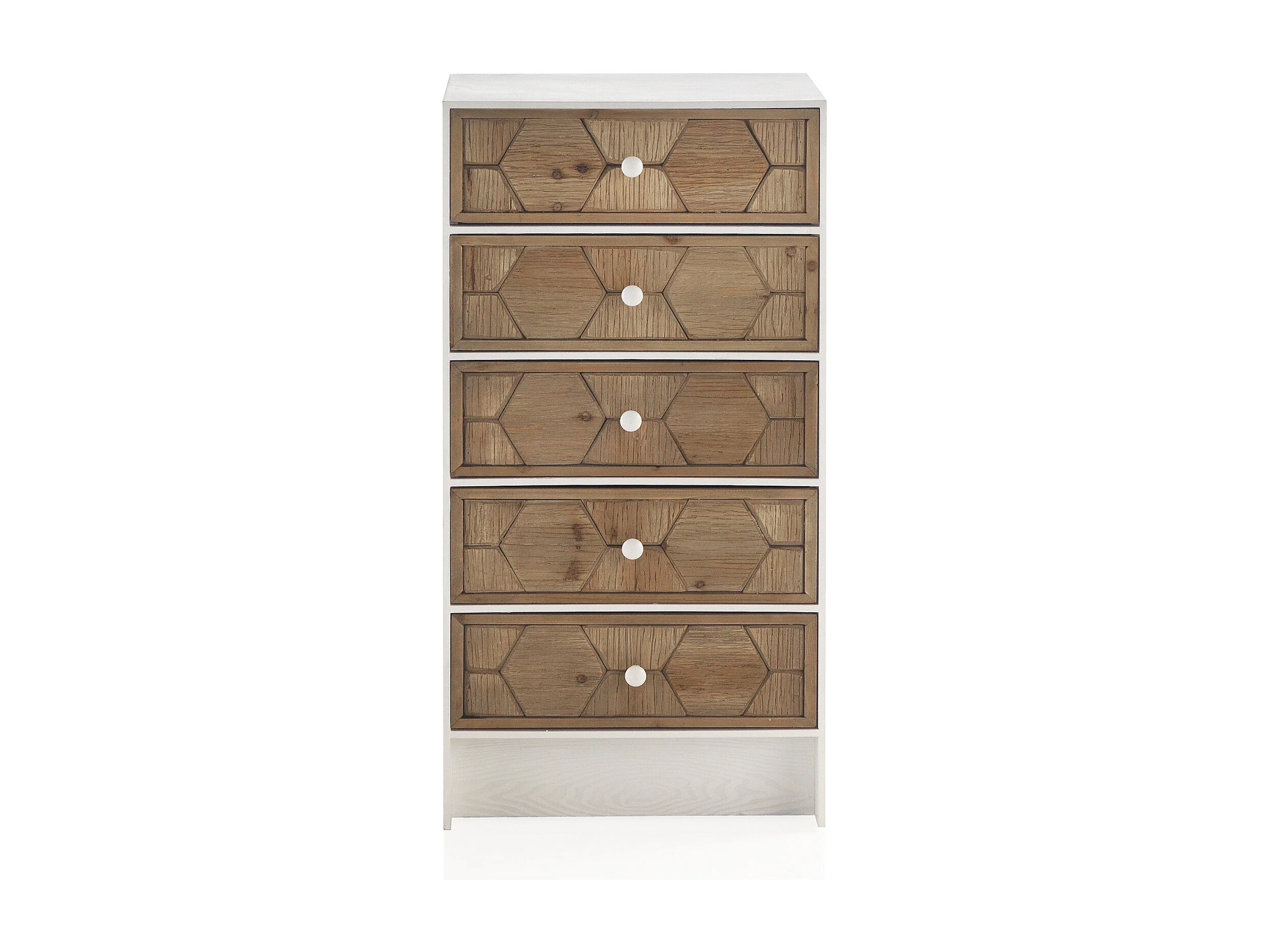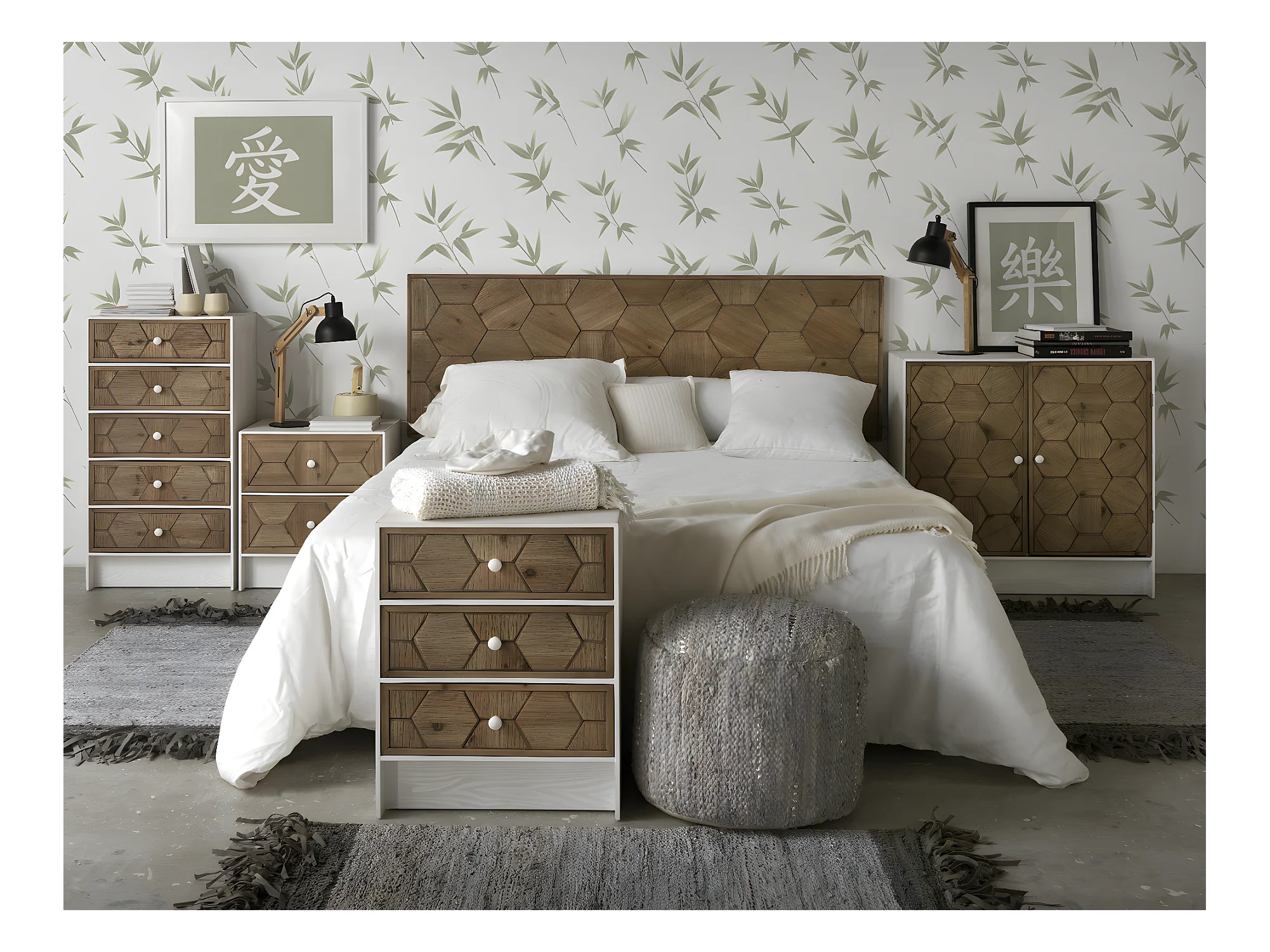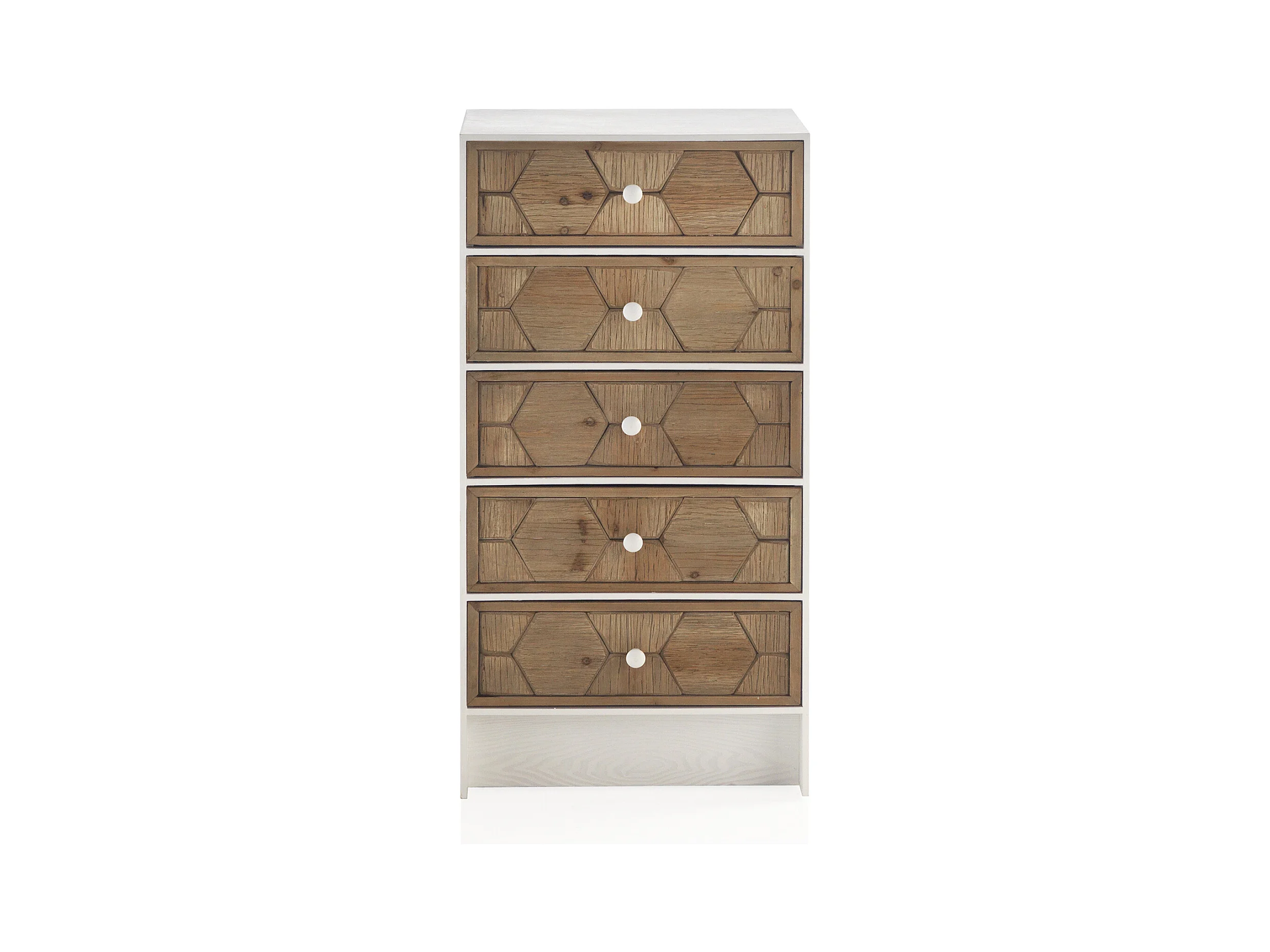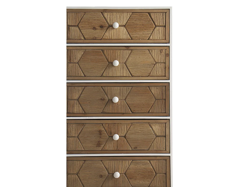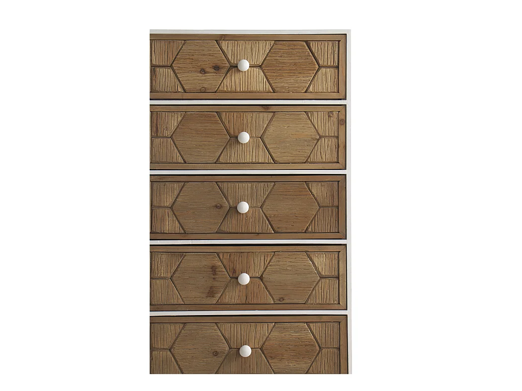 Cómoda com 5 gavetas em freixo branco com acabamento patinado