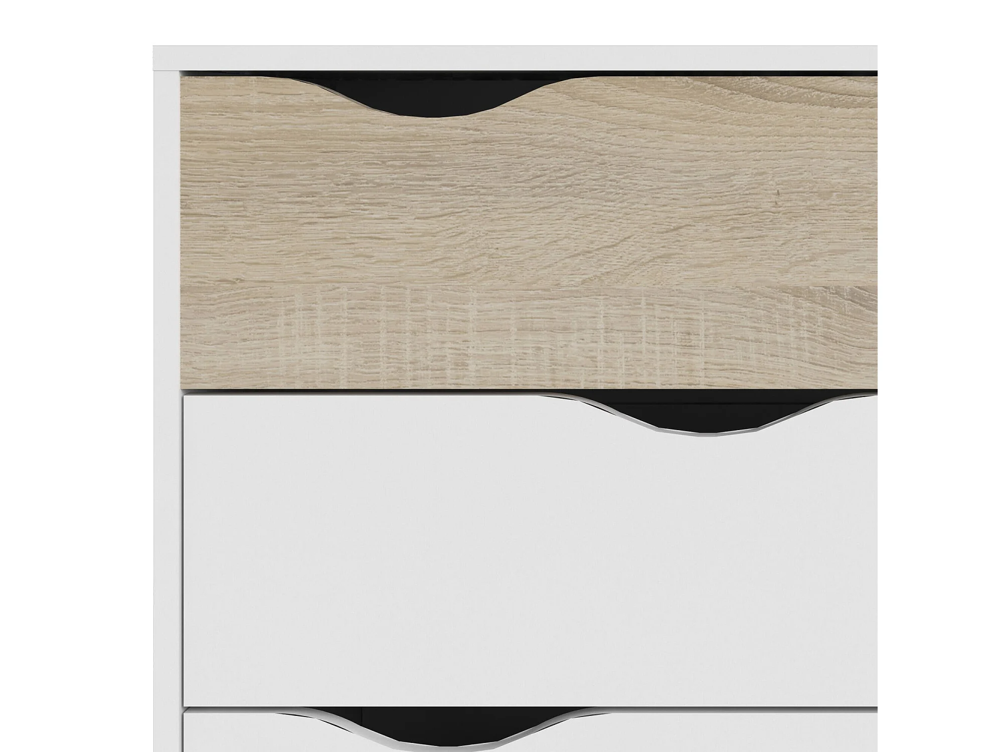 Cômoda com quatro gavetas, cor branca e carvalho, mede 98 x 81 x 39 cm