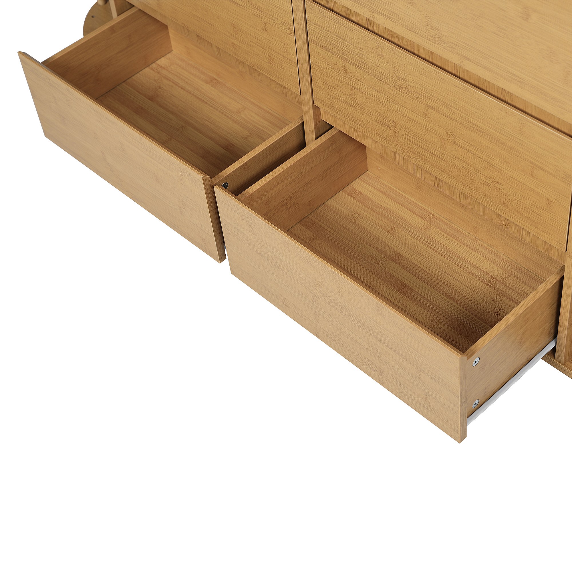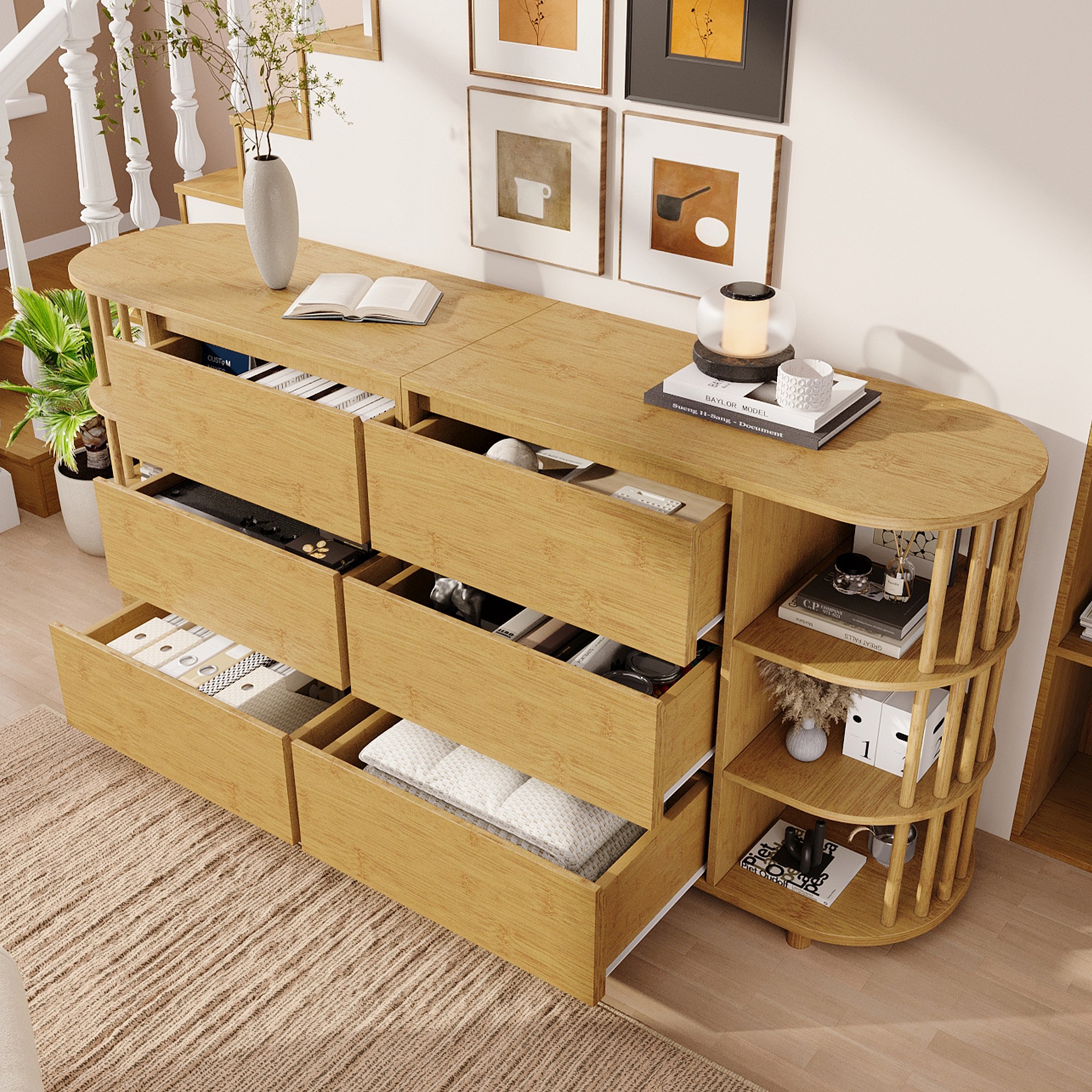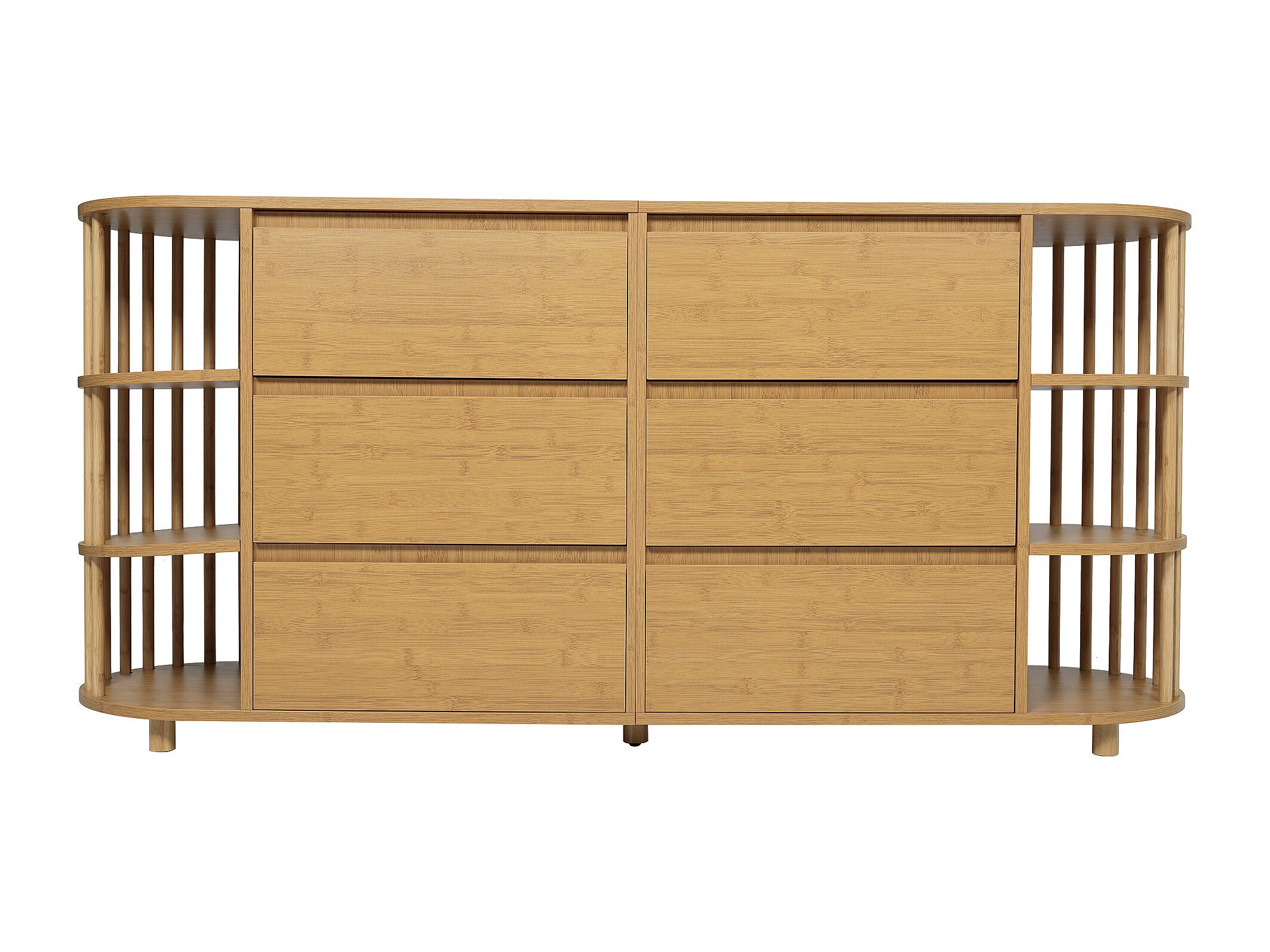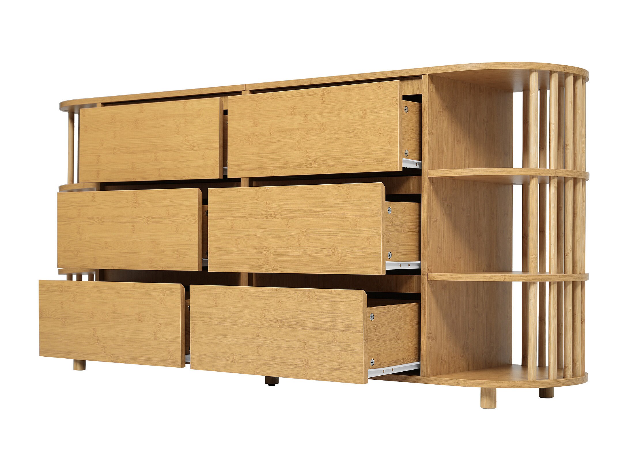 Cómoda cor natural com 6 gavetas e prateleiras abertas, altura regulável
