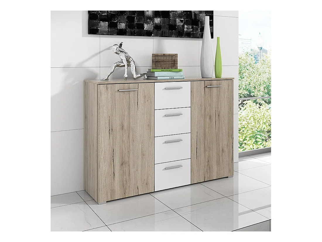 Cômoda design com 2 portas e 4 gavetas de 130cm. Coleção EOS em cor carvalho claro e branco.