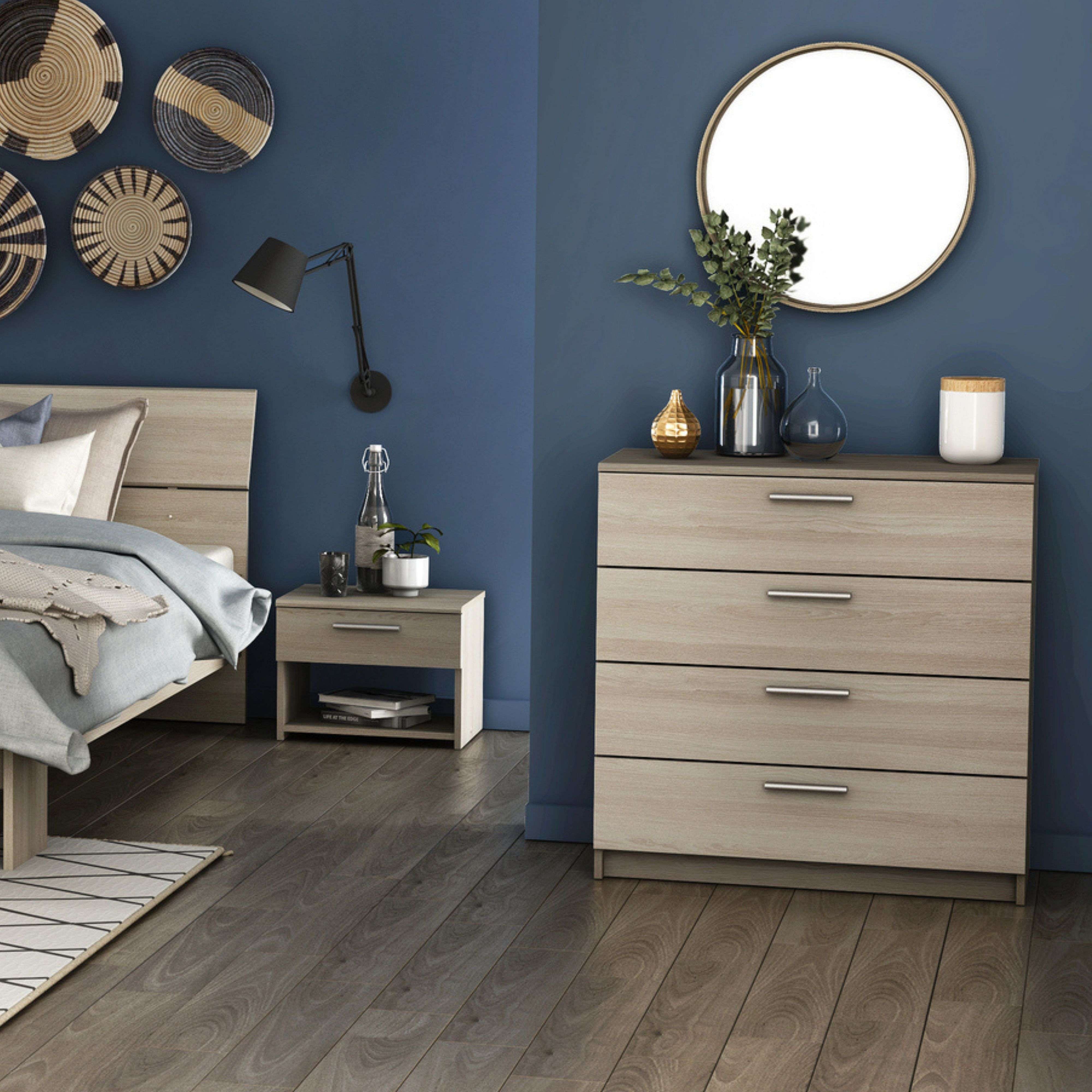 Cômoda Izzy com 4 gavetas em branco fosco e carvalho Kronberg, 85 x 80 x 42 cm.