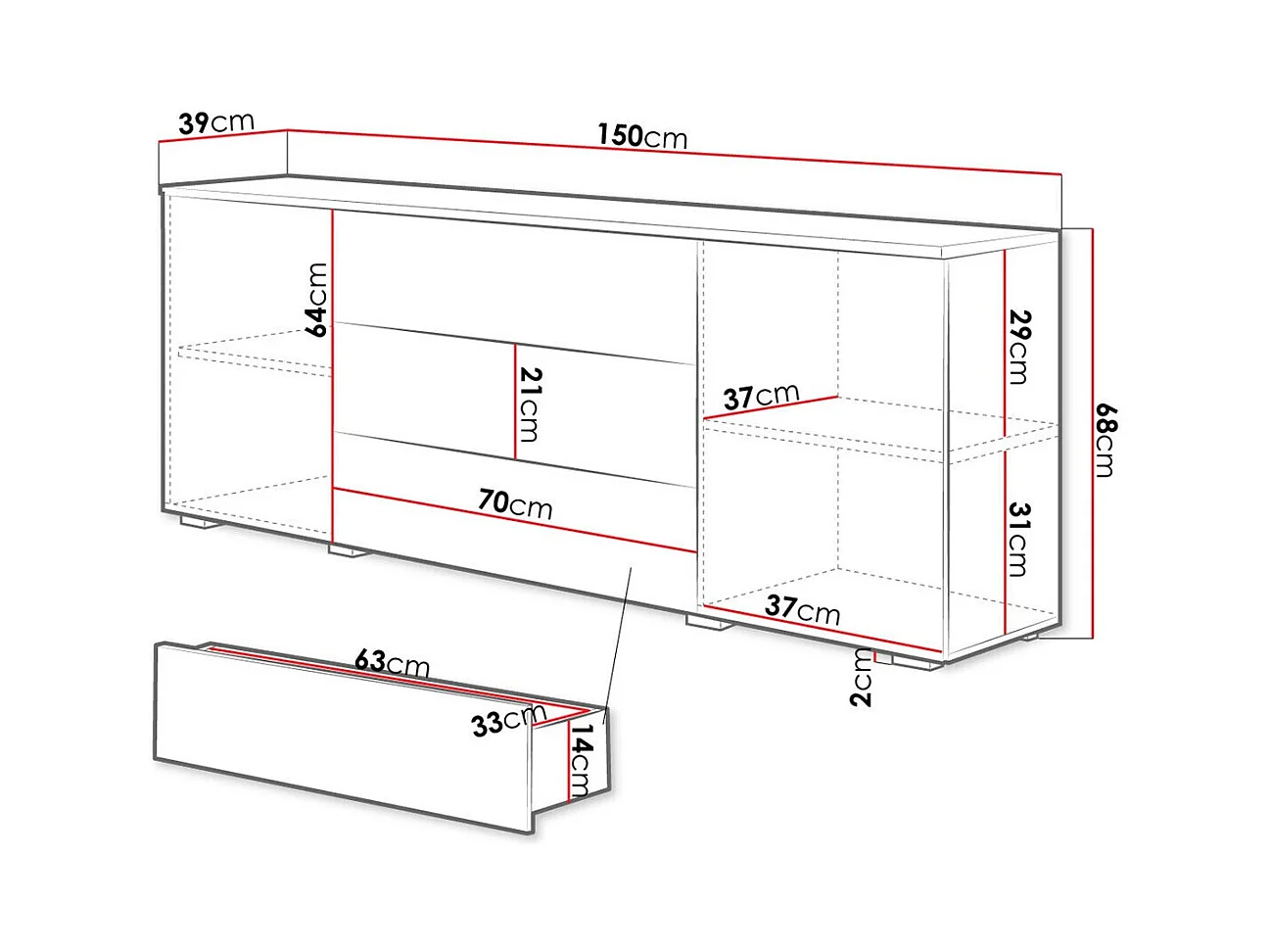 Cómoda Tucson 104, Com gavetas e portas, Número de gavetas: 2