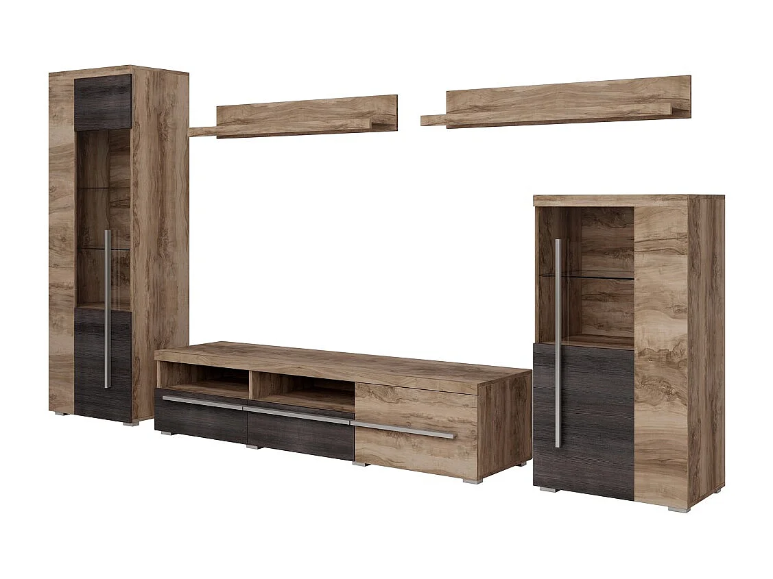 Composição mural BRAZZA – Vitrines, móvel TV 160 cm e 2 prateleiras – Acabamento em nogueira acetinado