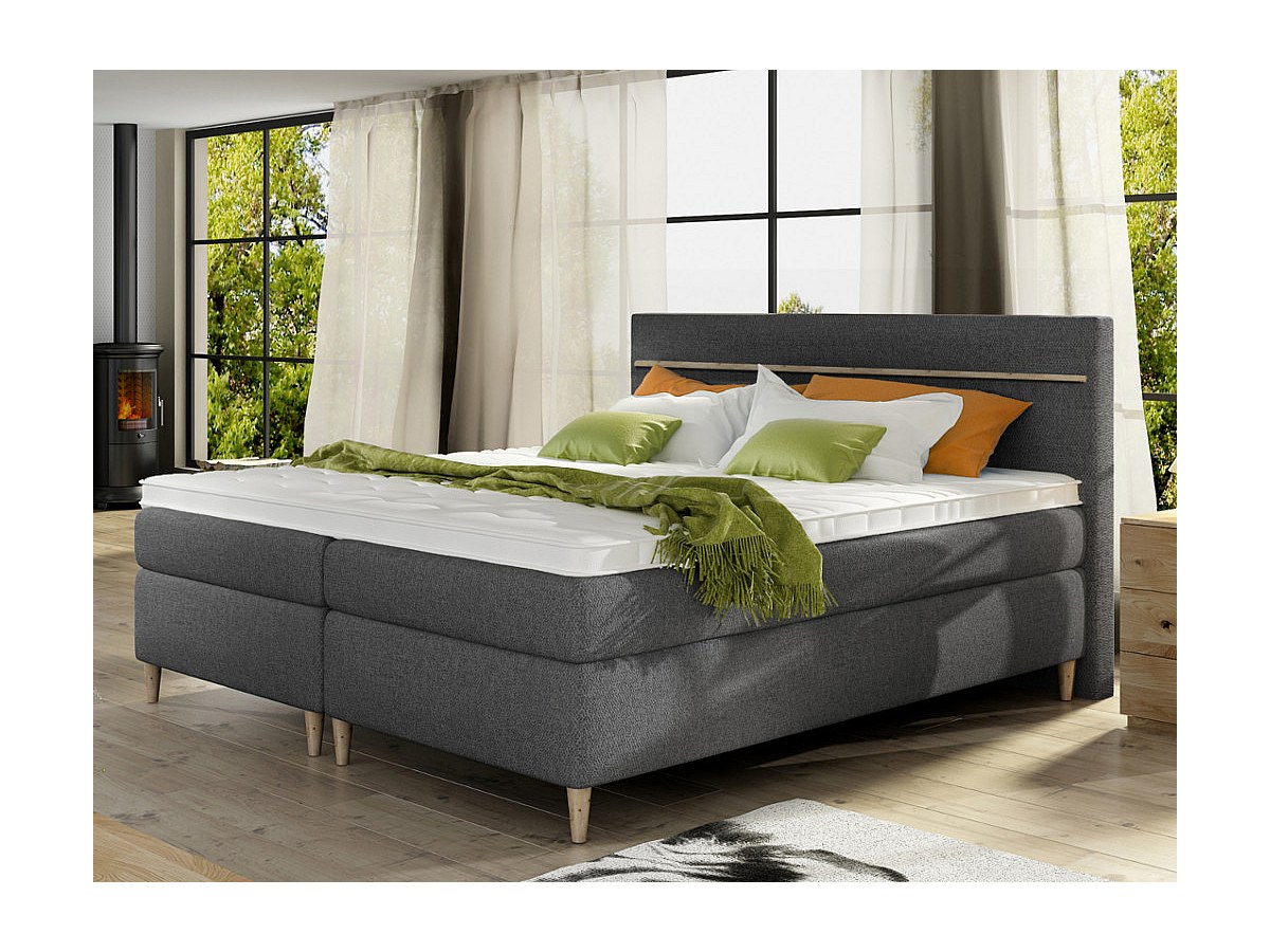 Conjunto boxspring com cabeceira de cama + sommier + colchão + sobrecolchão LUND da DREAMEA - Tecido cinzento - 160x 200 cm