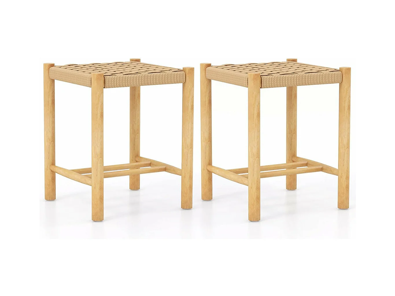 Conjunto de 2 bancos de bar com estrutura de madeira de borracha de 45 cm e assento de papel tecido banco rústico natural sem encosto 20_0006724