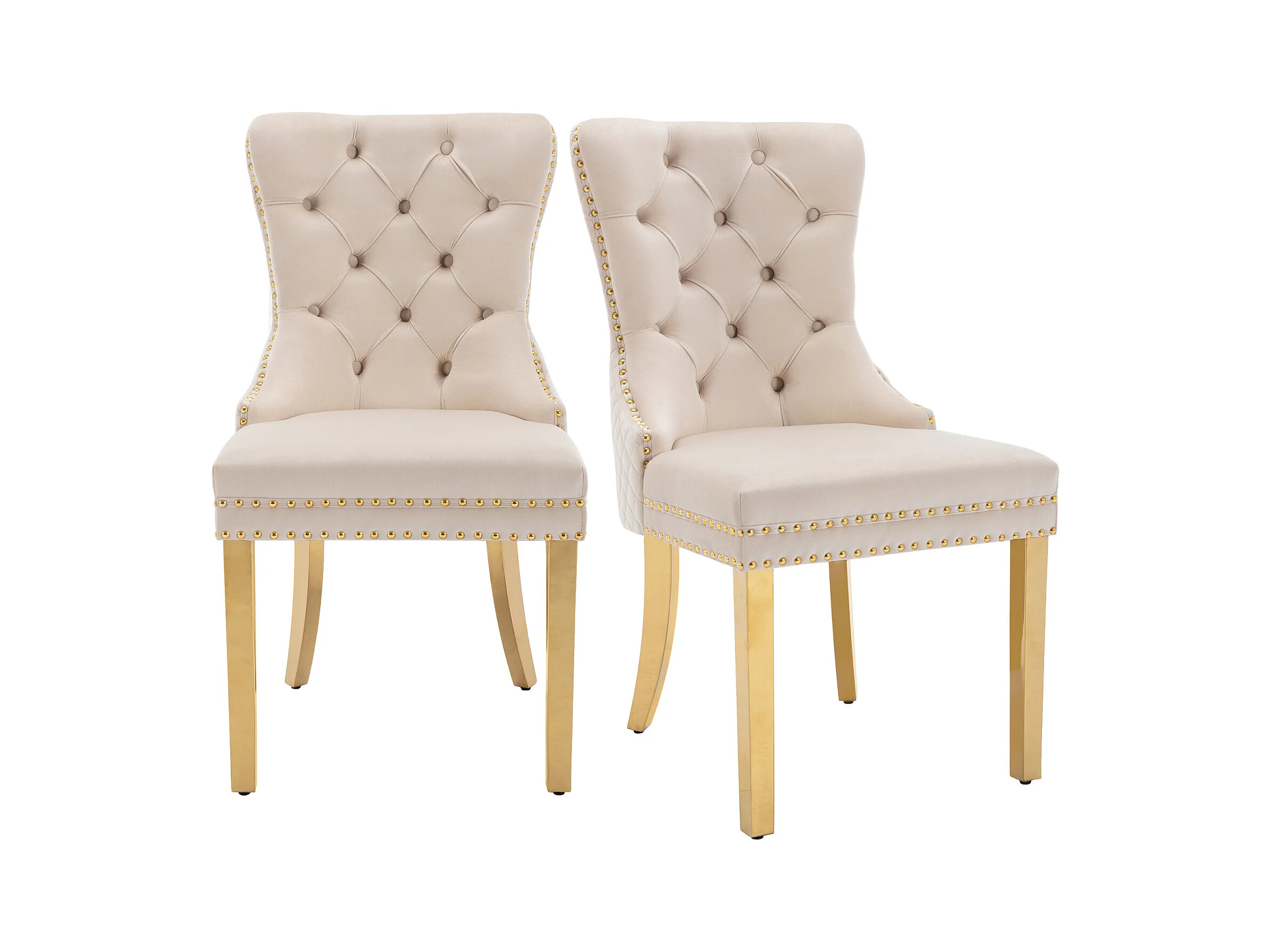 Conjunto de 2 cadeiras de jantar, assento estofado com acabamento em tachas, pernas de apoio em aço inoxidável dourado, estofamento em veludo, 45x50,5x95 cm, bege