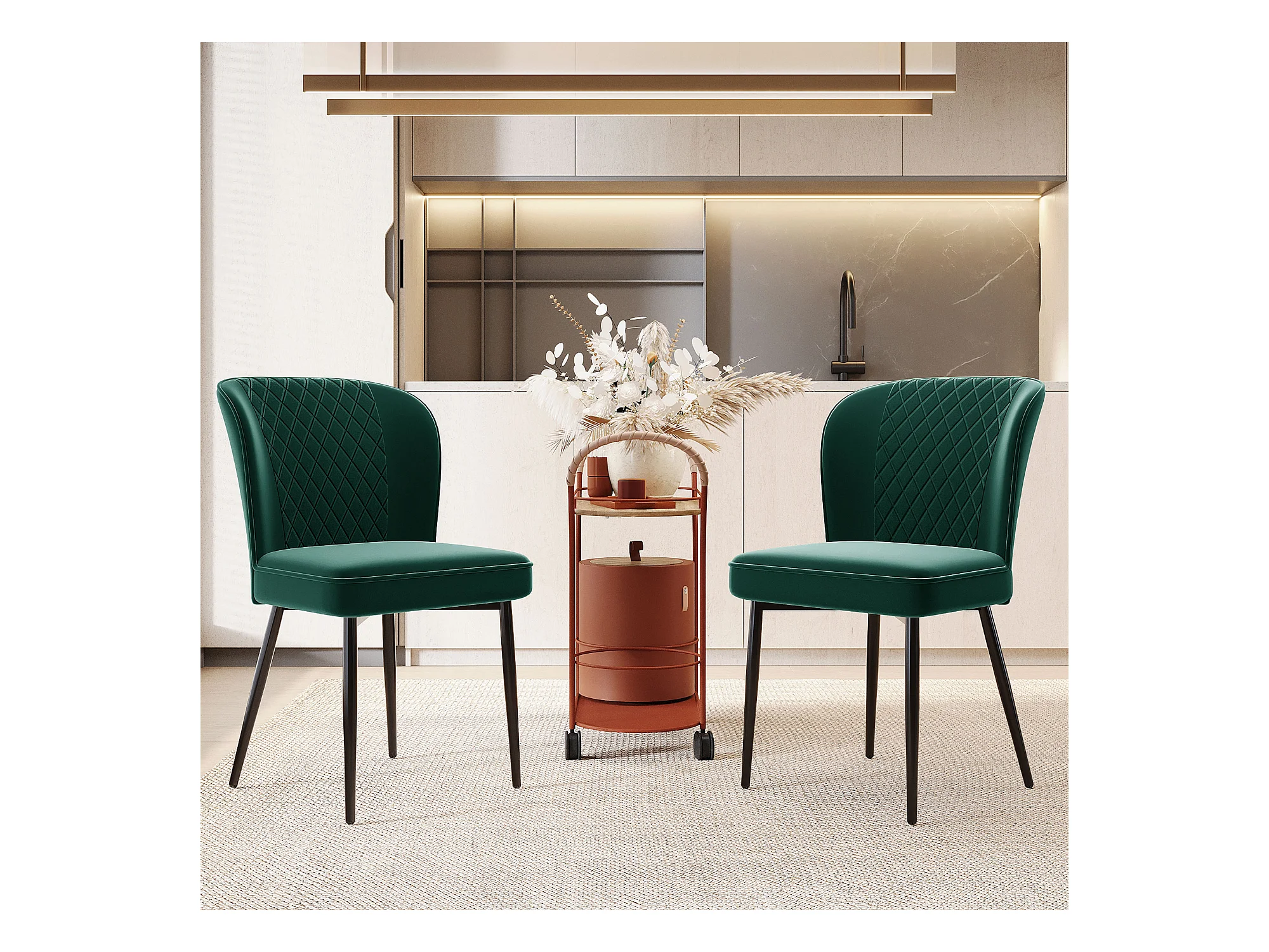 Conjunto de 2 cadeiras de jantar, verde escuro, design de cadeira estofada com encosto, veludo, estrutura de metal
