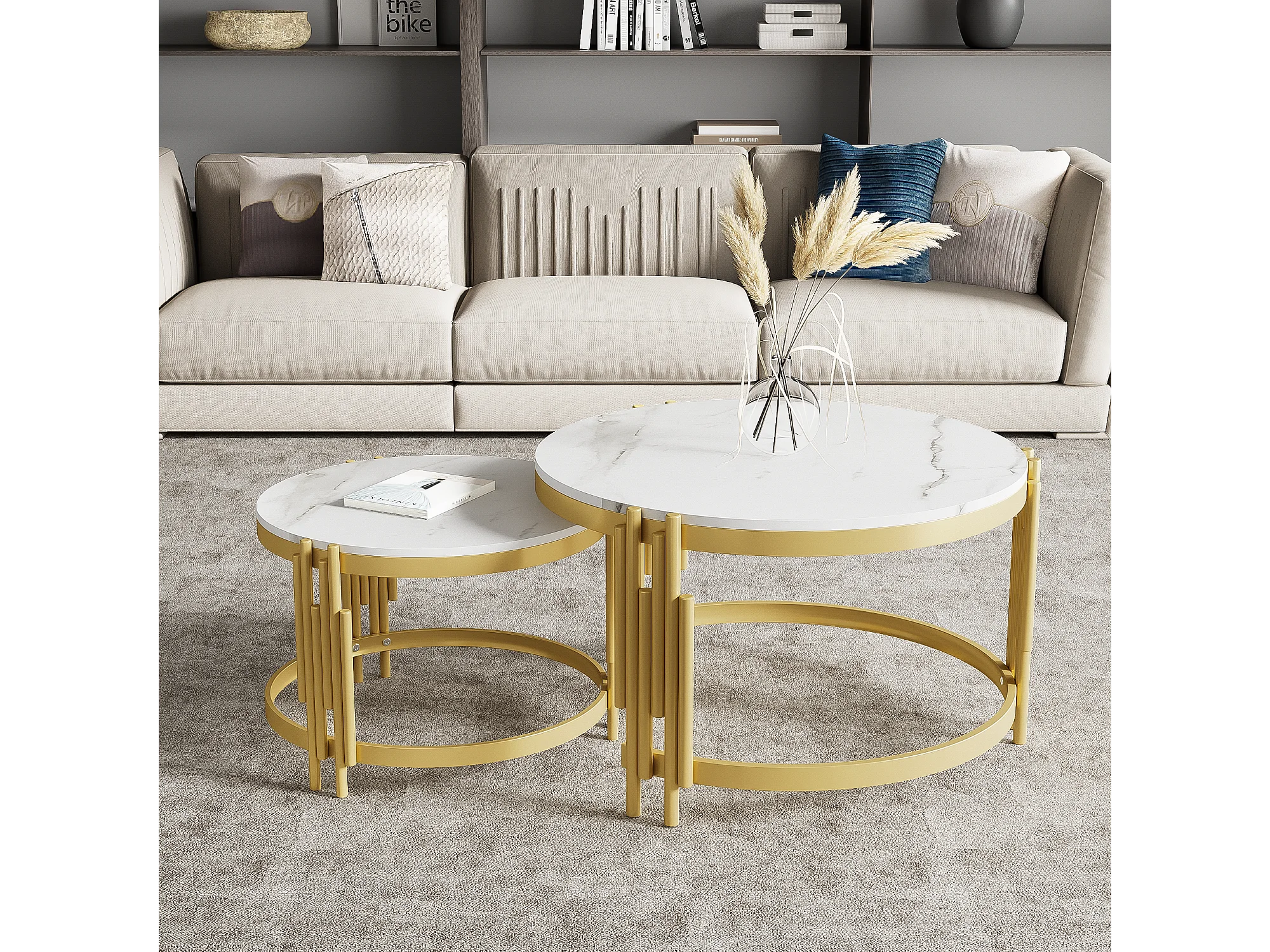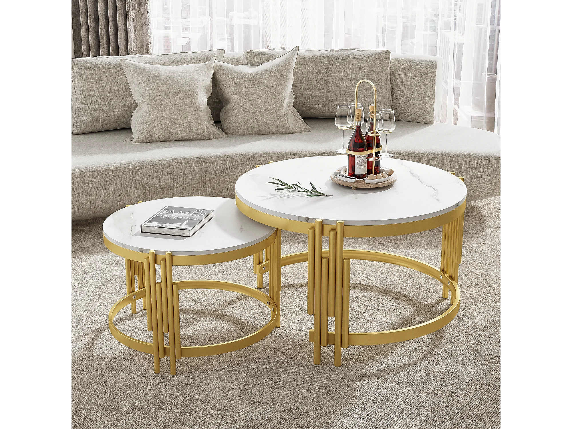 Conjunto de 2 mesas de centro encaixáveis em efeito mármore - Estrutura metálica dourada - 71,5x71,5x 44 cm + 51,5x51,5x37 cm - Branco