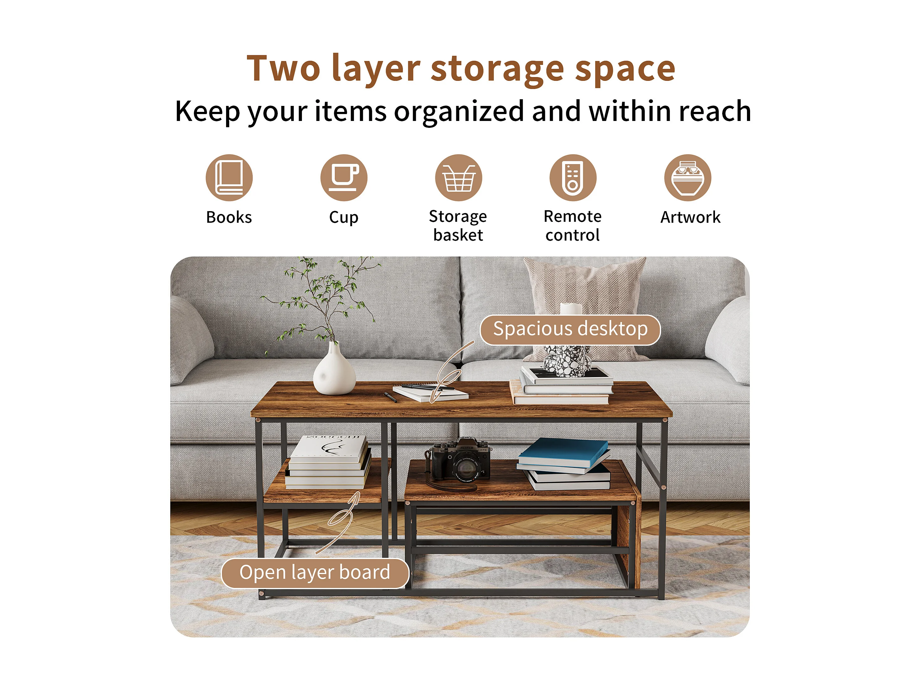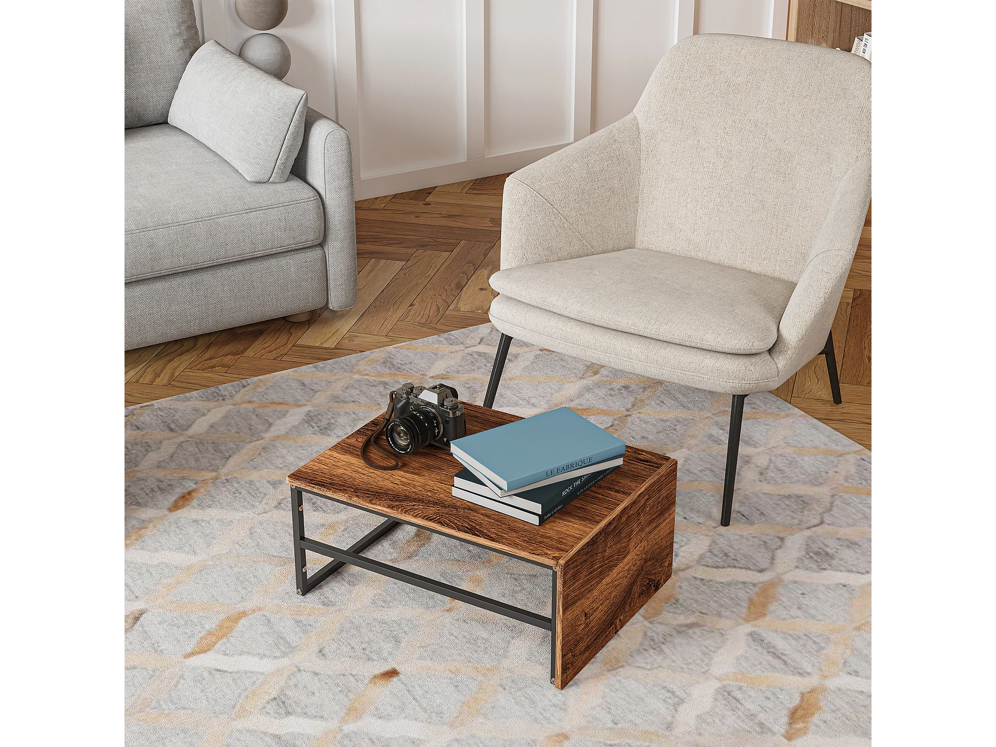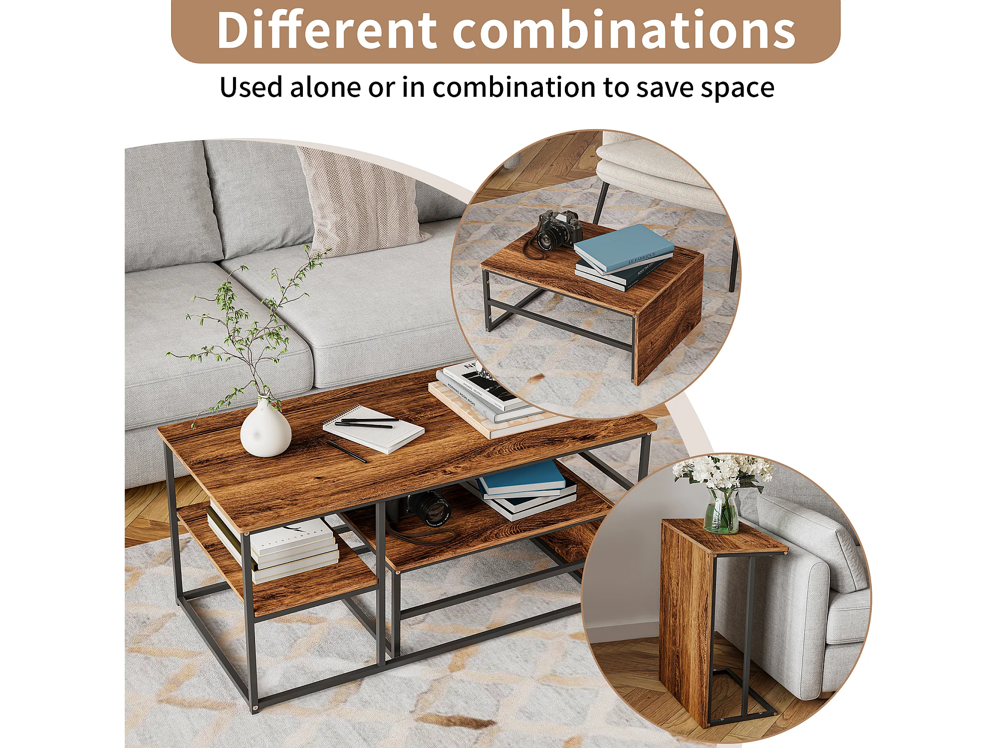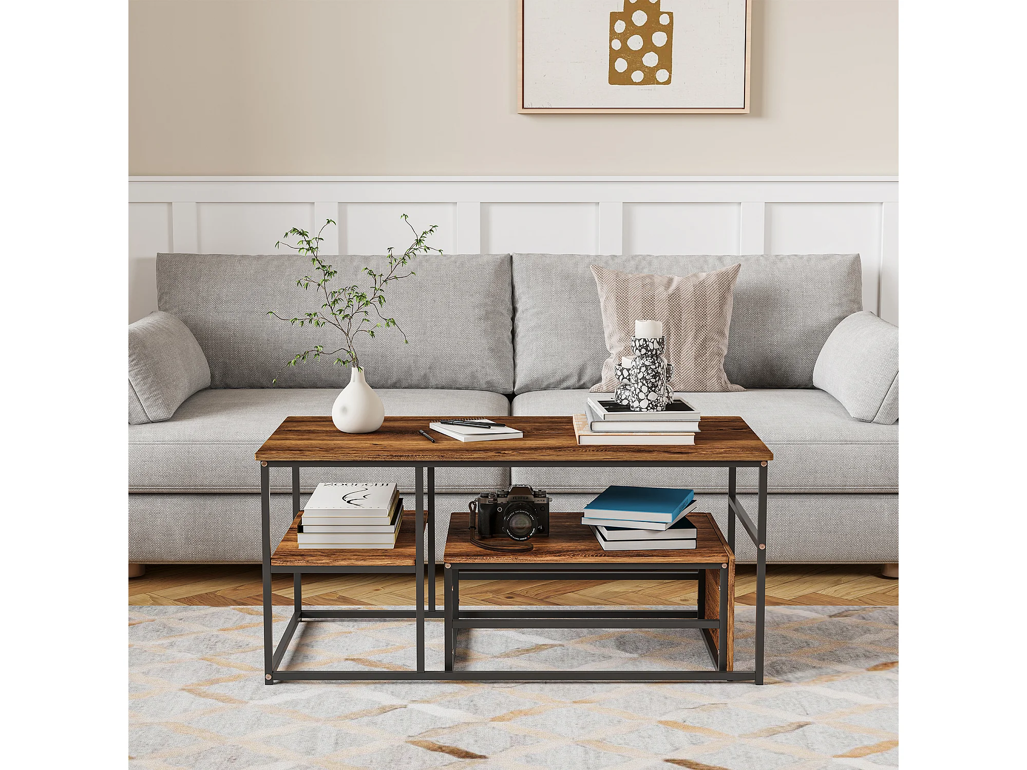 Conjunto de 2 mesas de centro encaixáveis, mesas de centro retangulares removíveis, estrutura de metal, madeira escura.