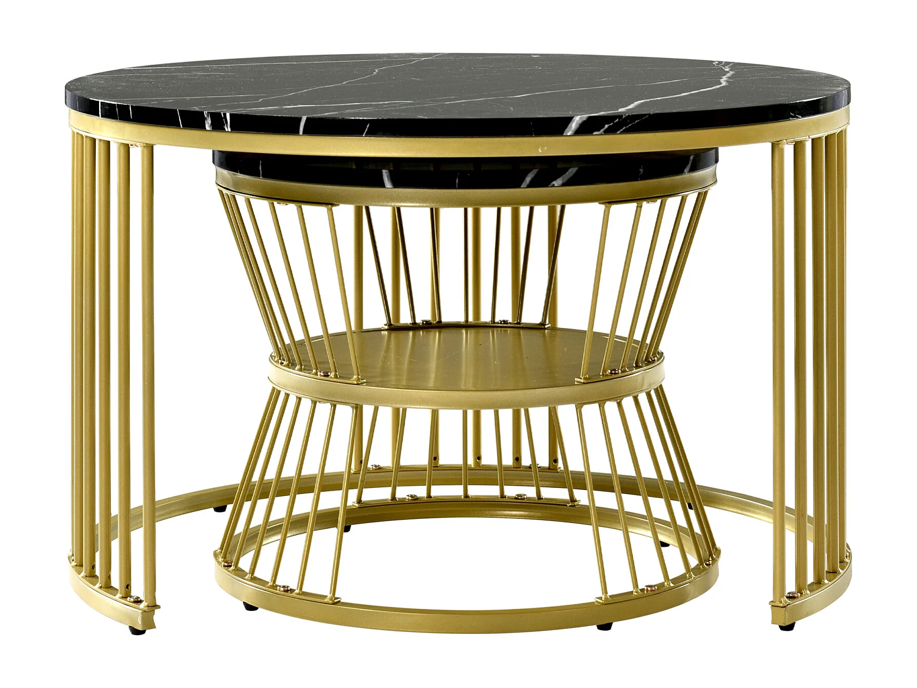 Conjunto de 2 mesas de centro redondas - com base em mármore brilhante - Para sala de estar - Dourado e Preto
