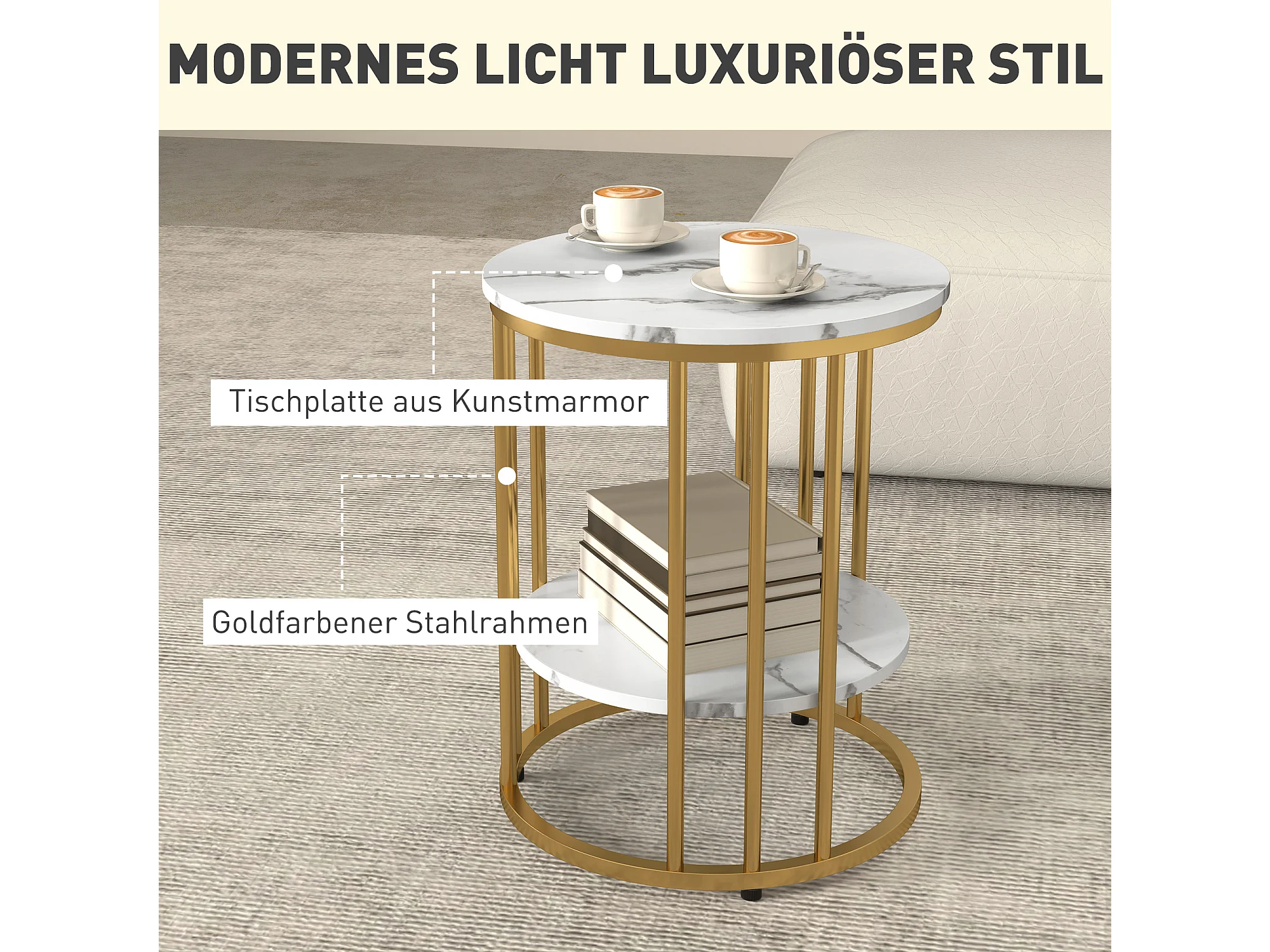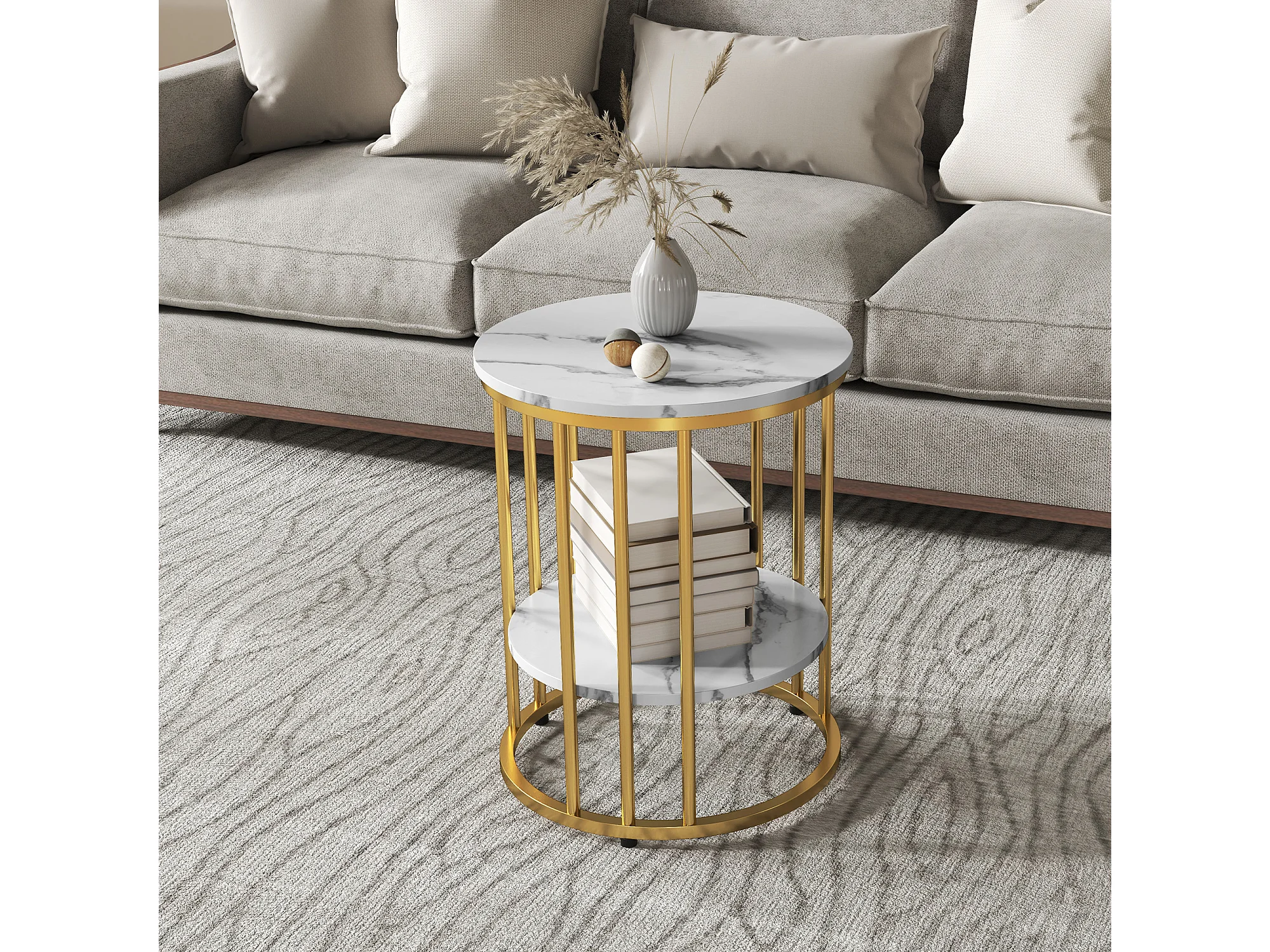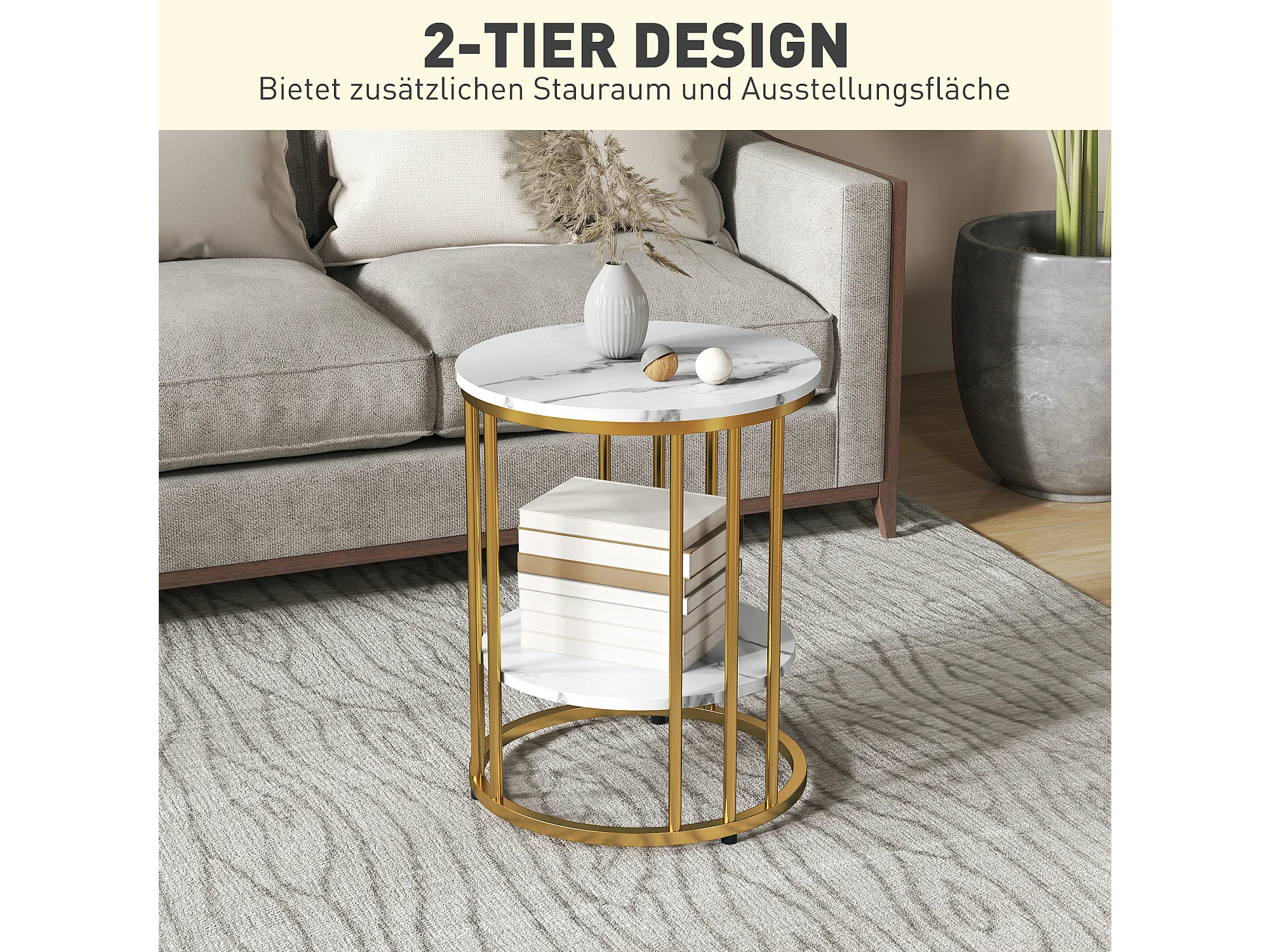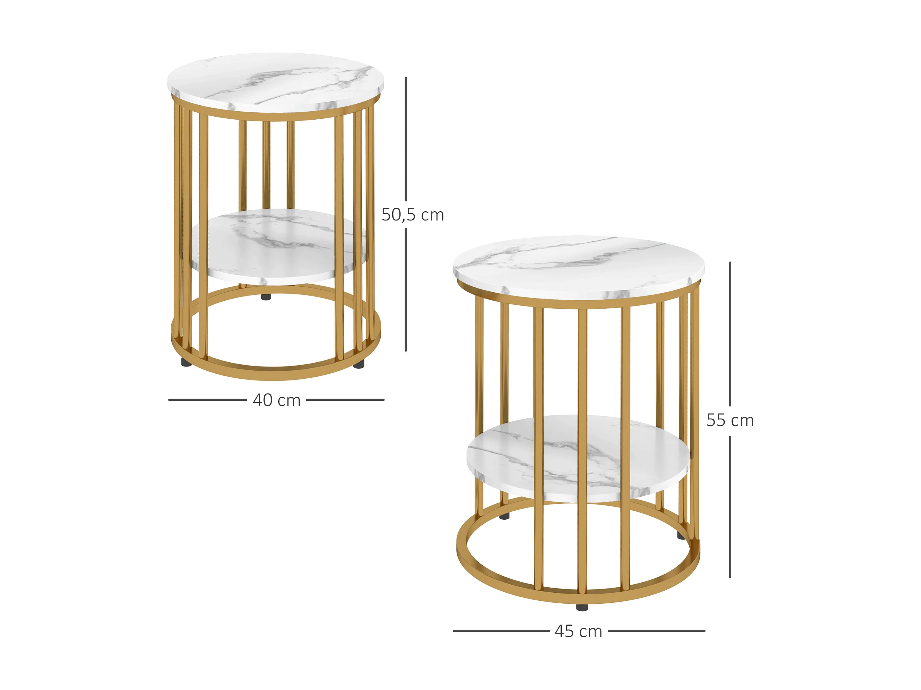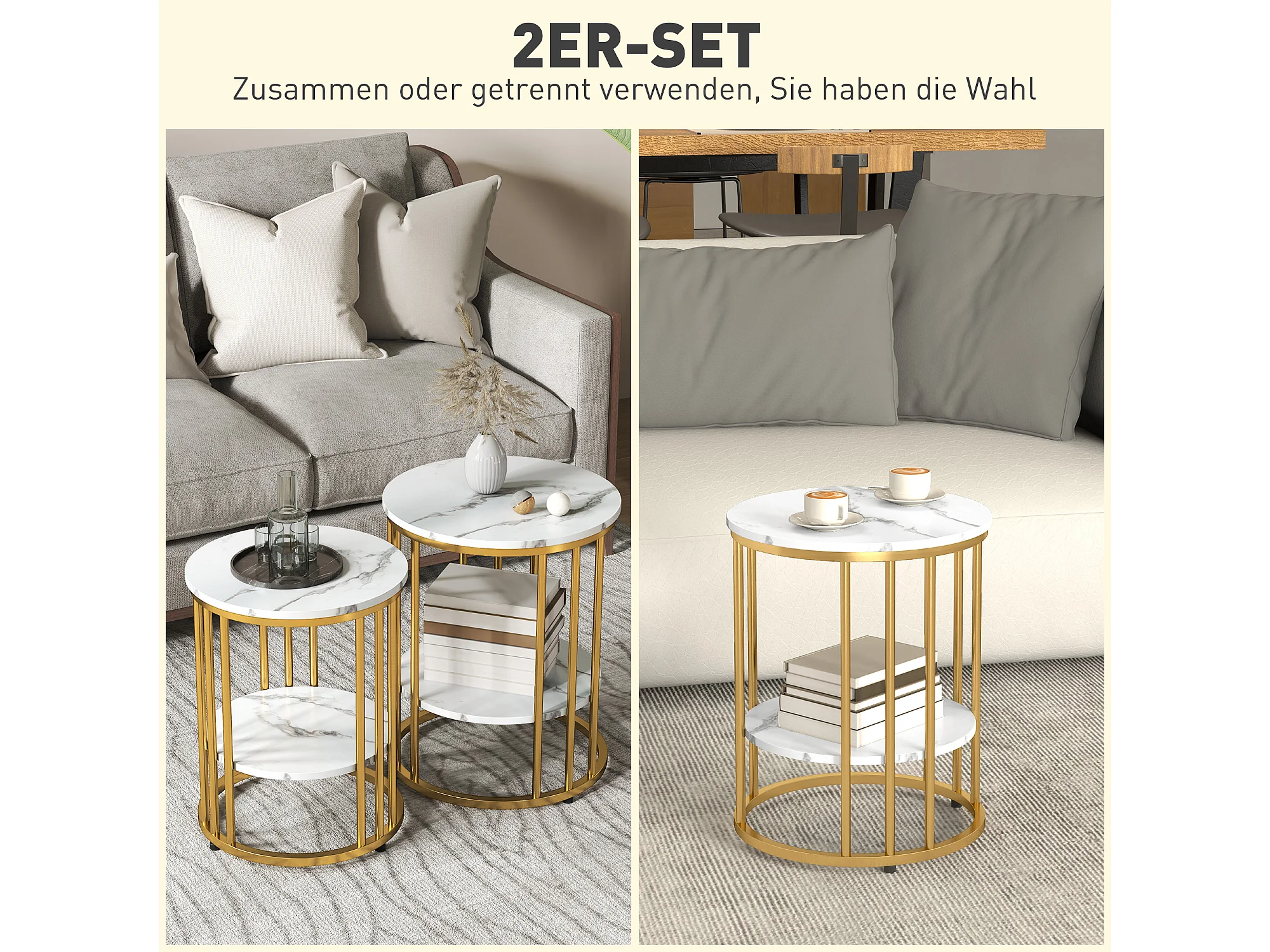 Conjunto de 2 mesas de centro redondas, com efeito mármore, para sala de estar, com prateleira aberta para armazenamento, douradas.