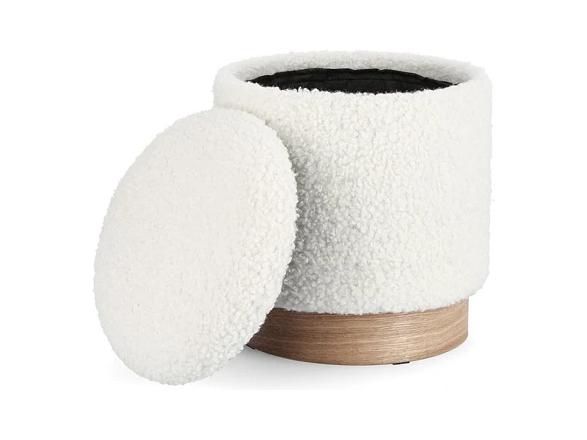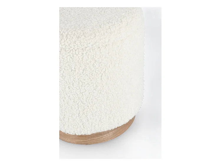Puff oval em tecido branco com efeito de lã e anel de madeira - BOSTON