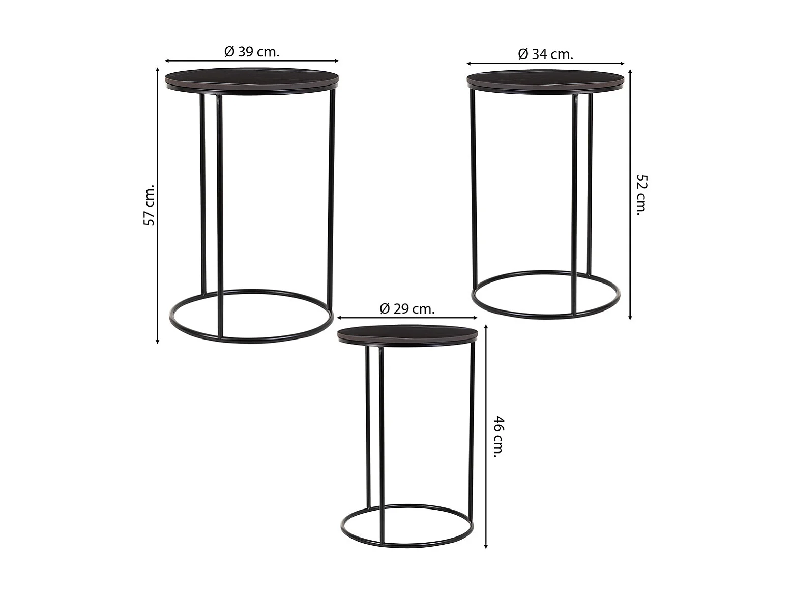 Conjunto de mesas 3 peças metal preto 29x29x46h-34x34x52h-39x39x57h cm