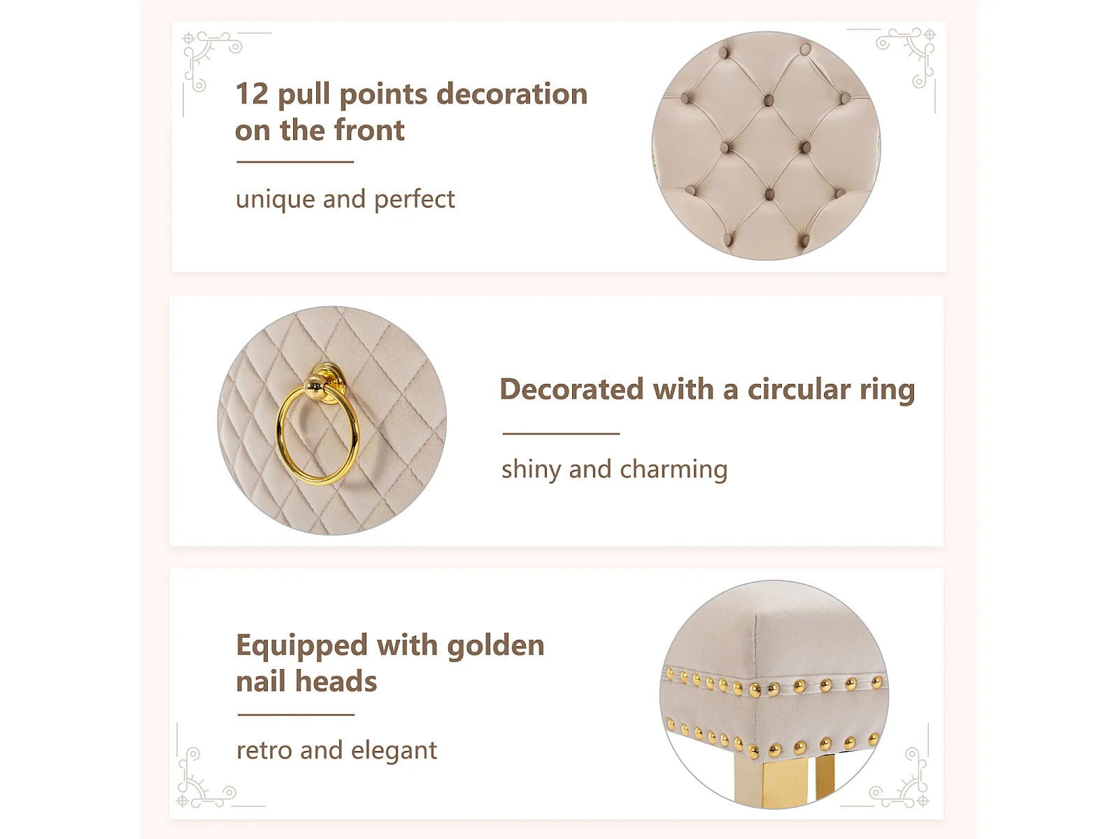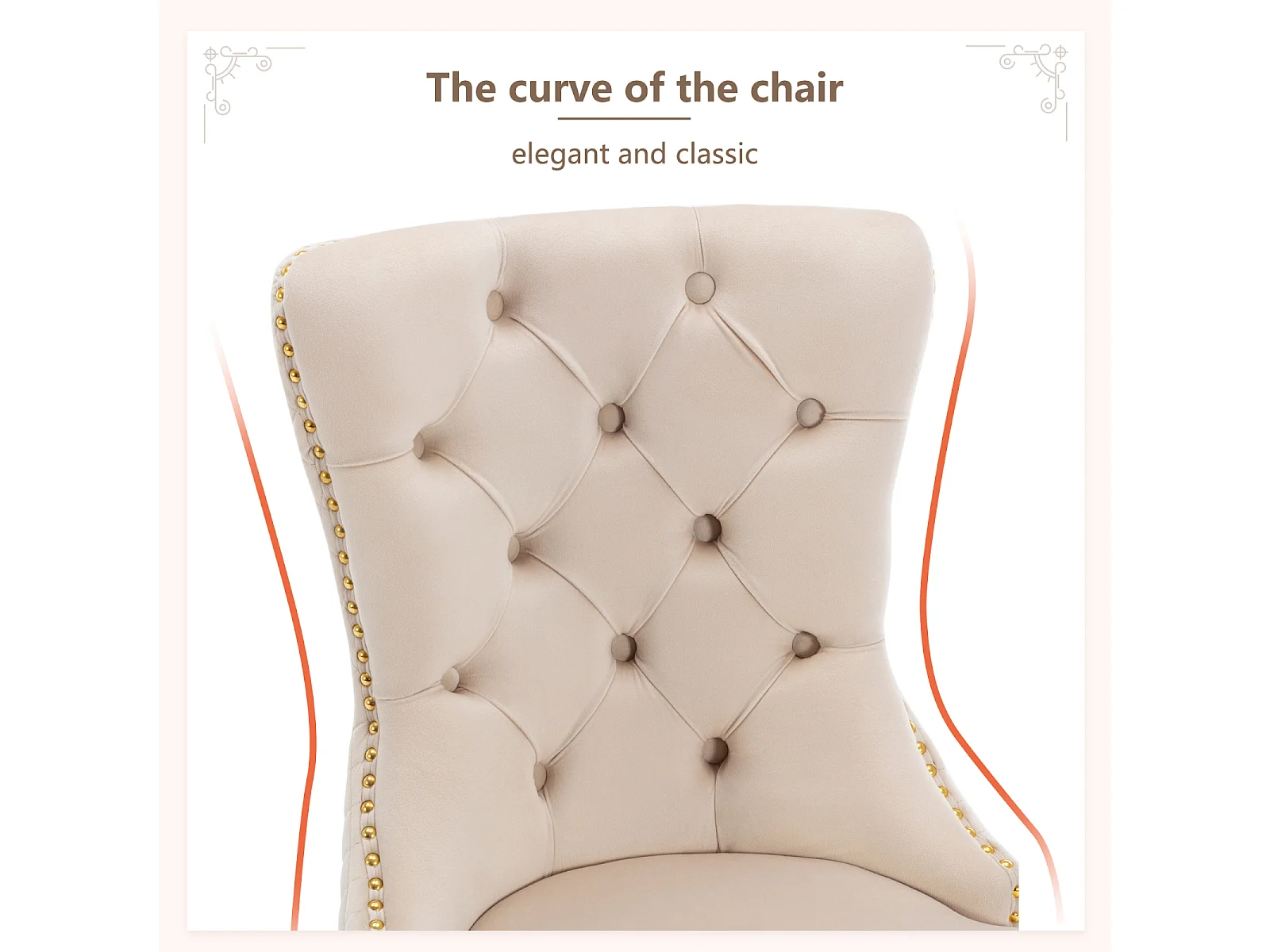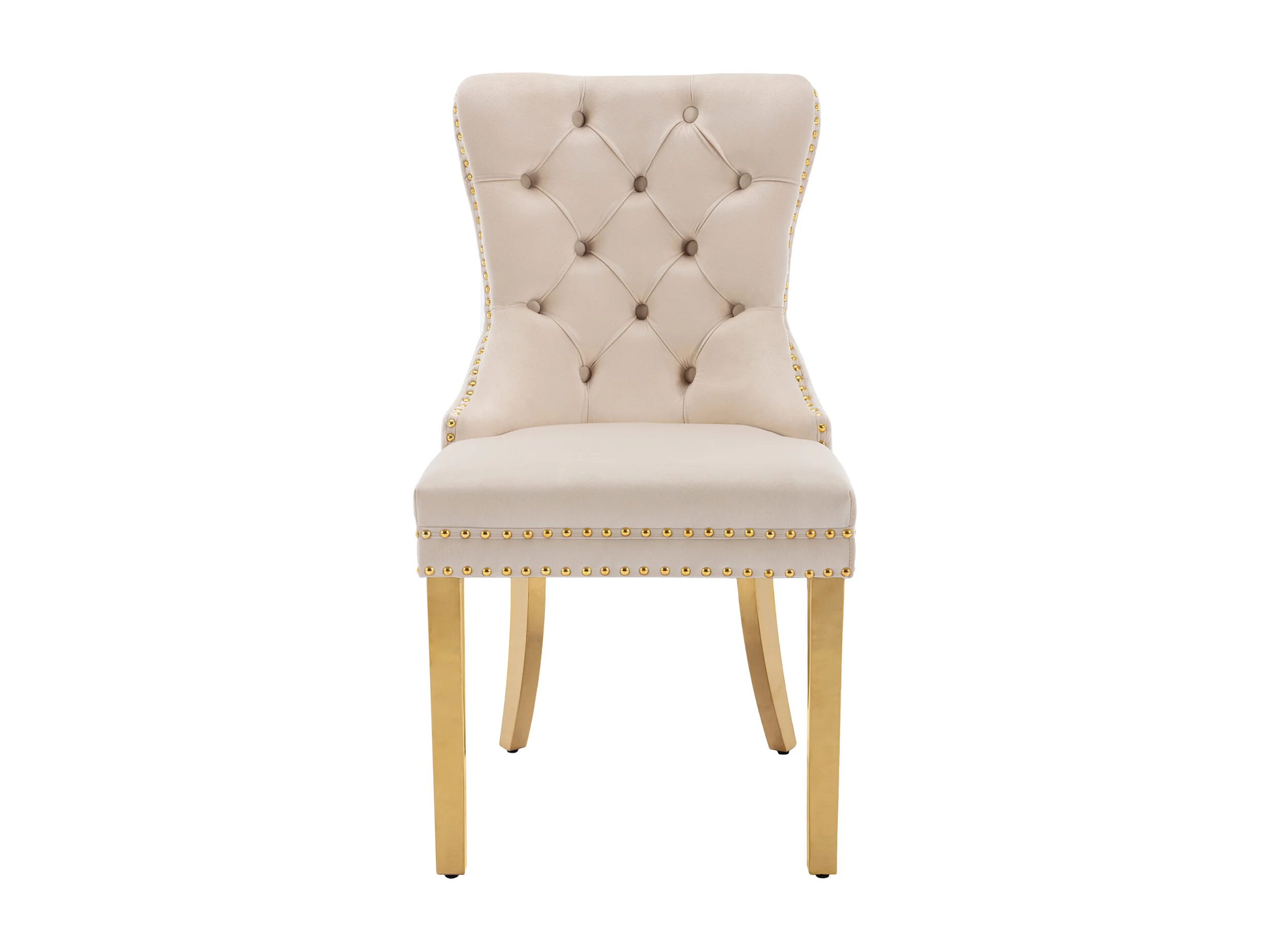 Conjunto de 4 cadeiras de jantar, assento estofado com acabamento em tachas, pernas de apoio em aço inoxidável dourado, estofamento em veludo, 45x50,5x95 cm, bege