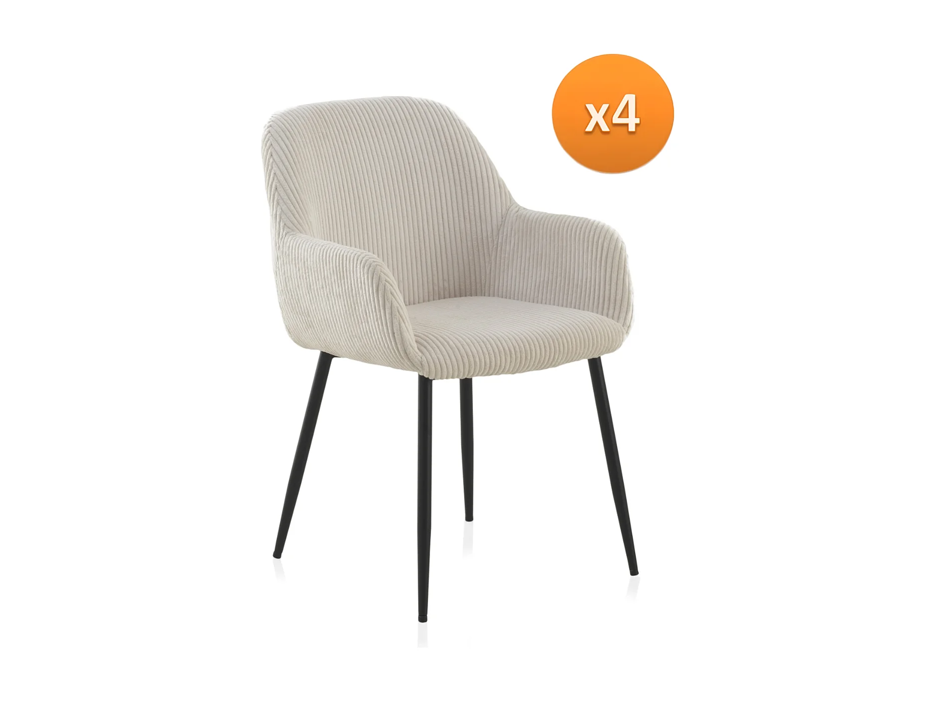 Pacote de 4 poltronas estofadas em tecido de veludo cotelê branco com pés em metal preto