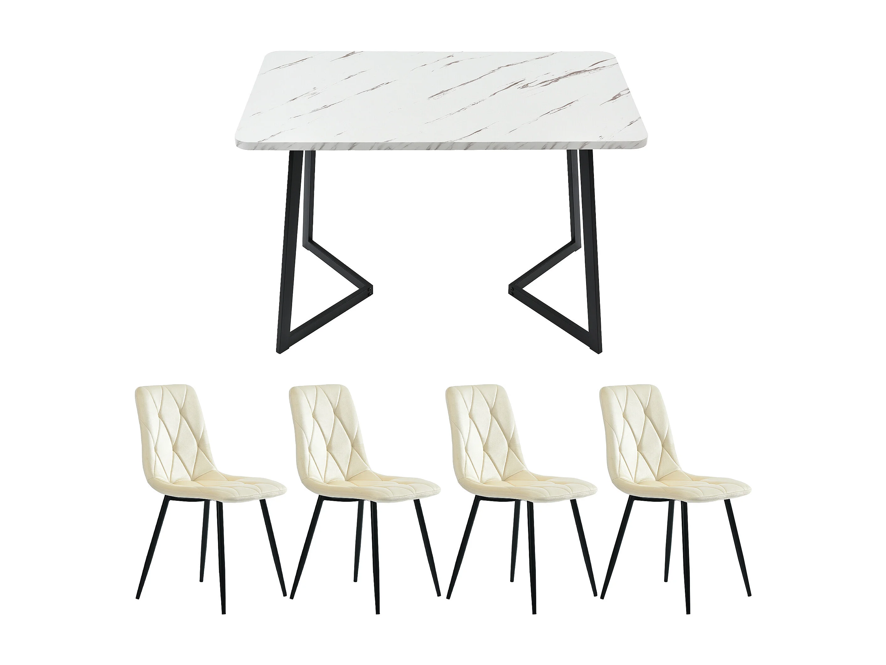 Conjunto de sala de jantar de 5 peças, mesa de MDF com efeito mármore de 117 x 68 cm, pernas de metal, cadeiras de veludo bege