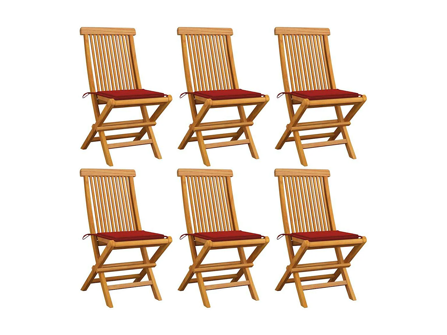 Conjunto de 6 cadeiras de jardim e almofadas vermelhas em madeira maciça de teca