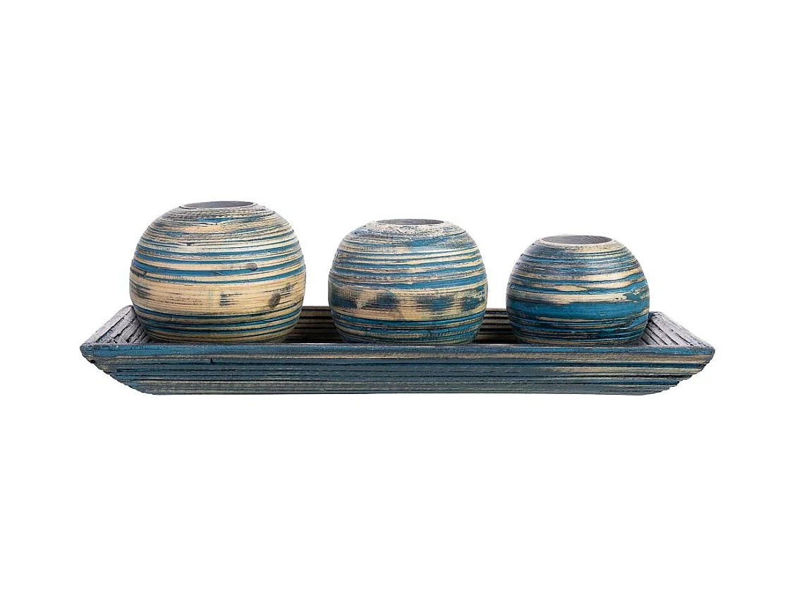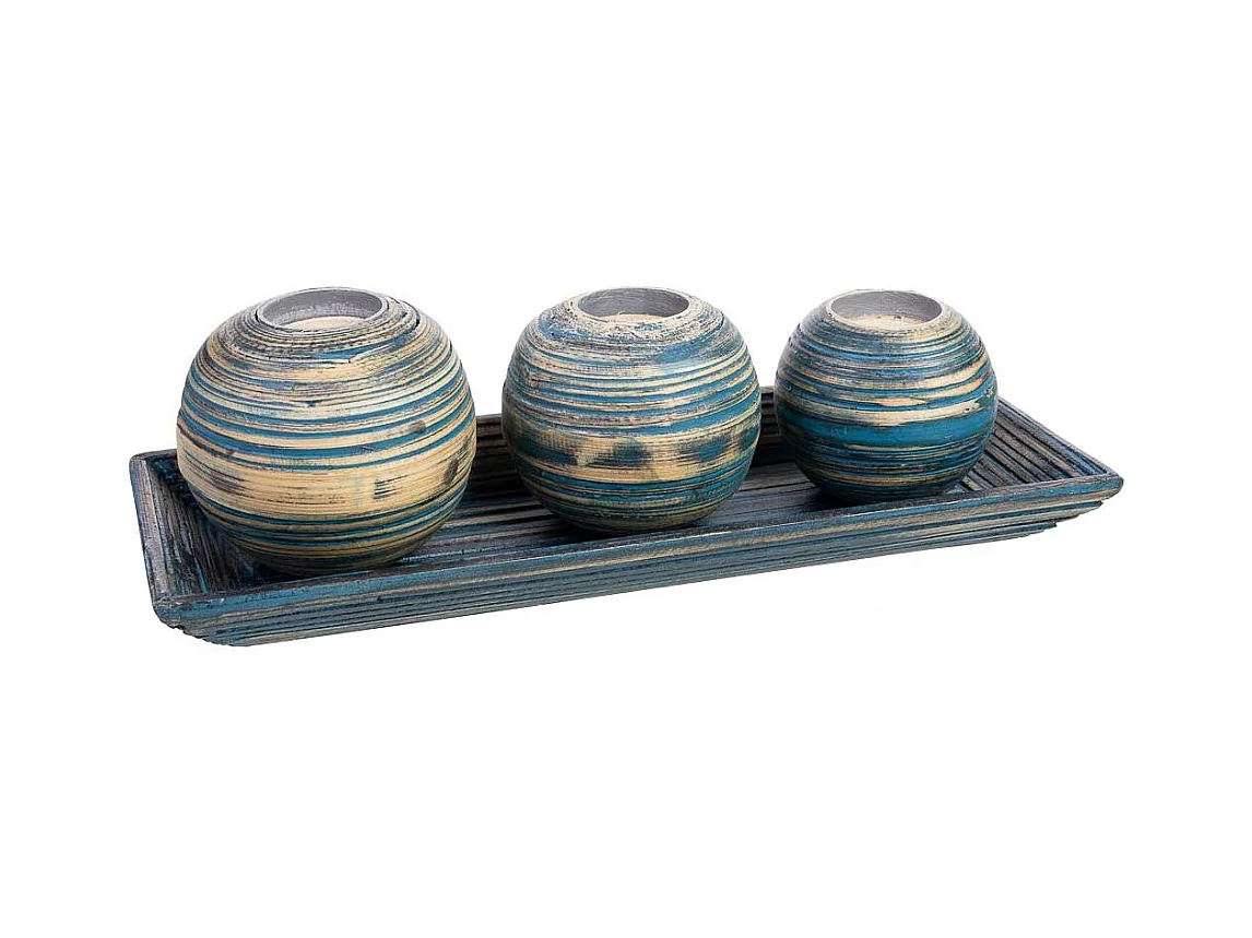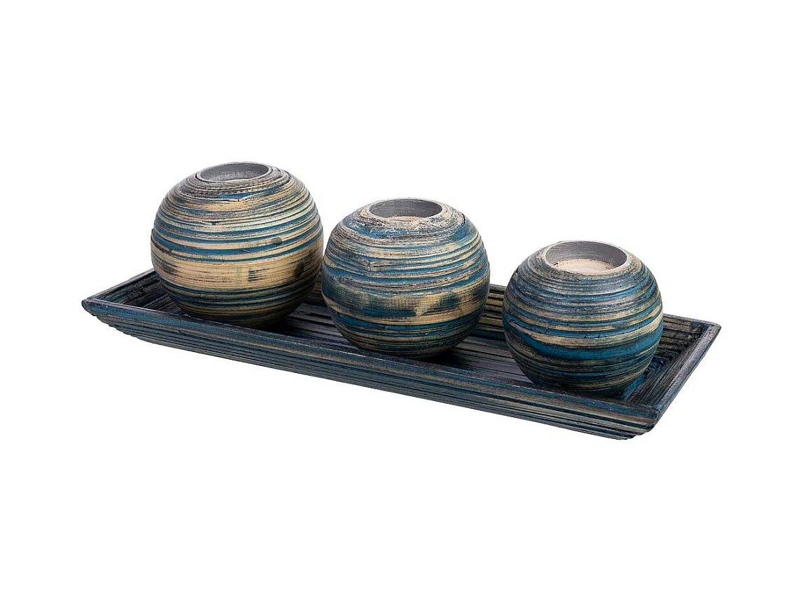 Conjunto de bandeja e 3 porta-velas em madeira de bambu azul 33x13x3h cm