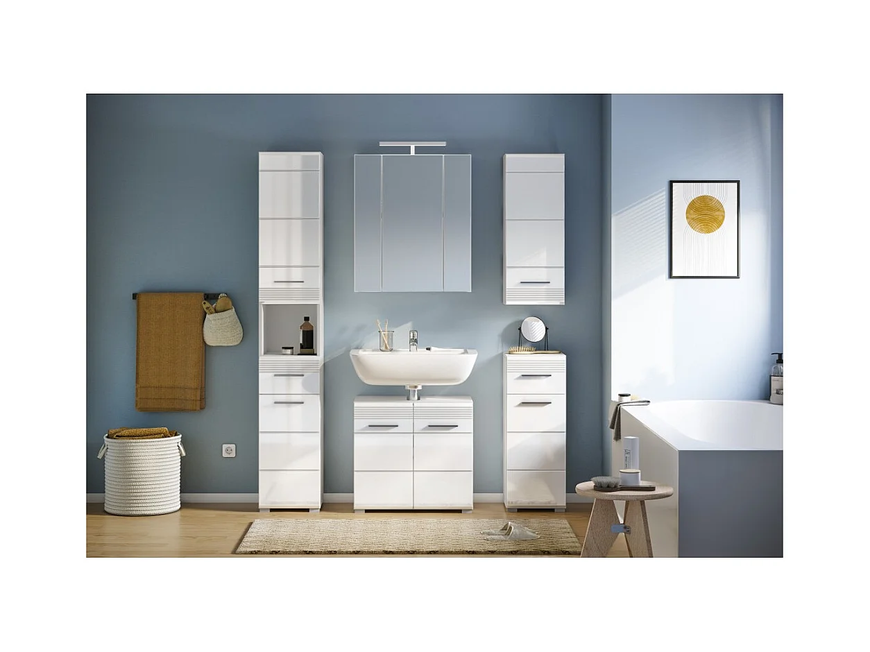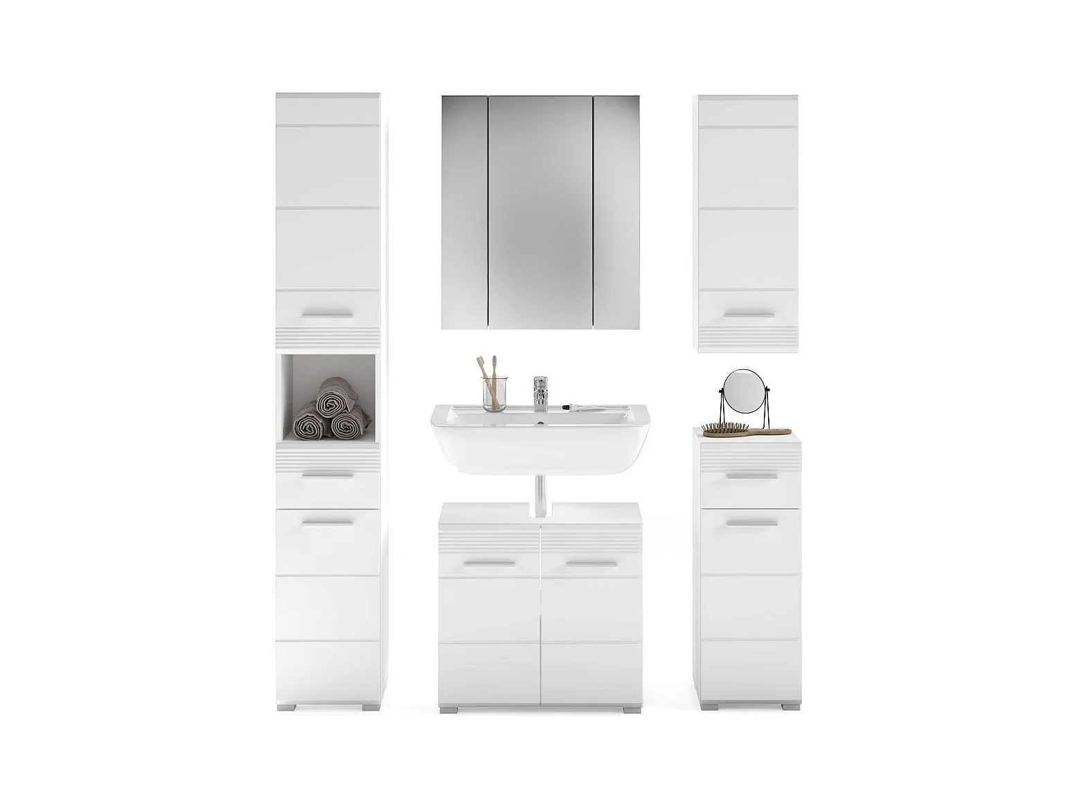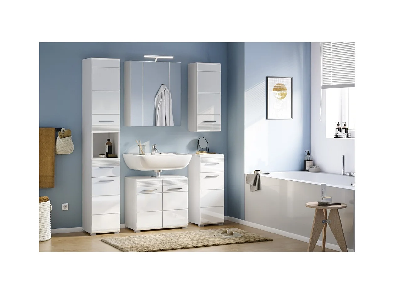 Conjunto de móveis para banheiro: Móvel sob pia + 2 meias colunas + Armário de armazenamento com espelho – Branco laqueado – KLEA