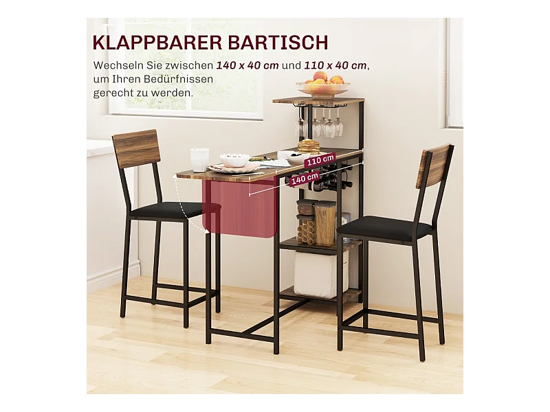 Conjunto de bar de 3 peças, mesa alta 110-140x40 cm + 2 bancos, madeira marrom, metal preto