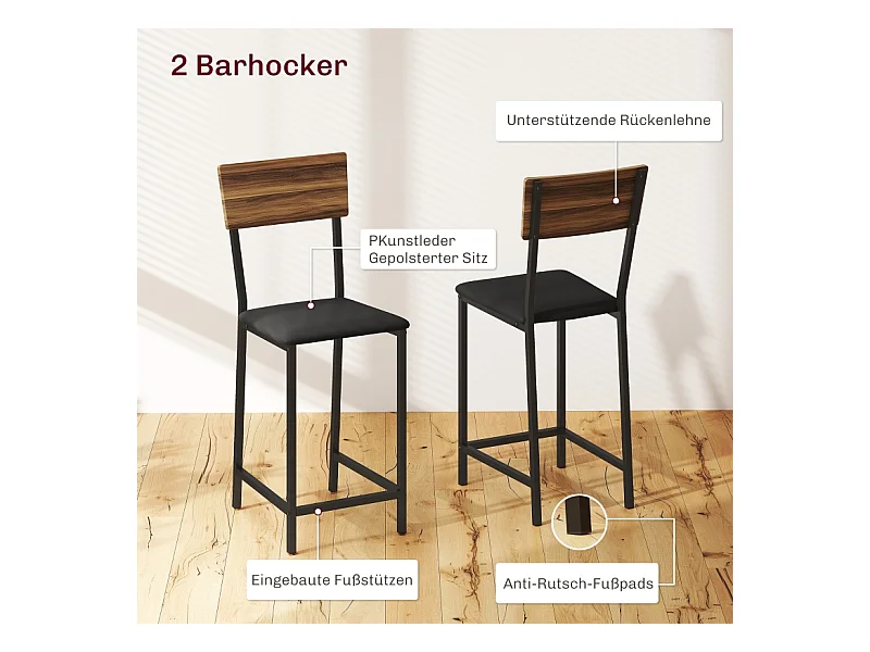 Conjunto de bar de 3 peças com mesa de metal MDF e 2 bancos para cozinha e sala de estar em marrom rústico
