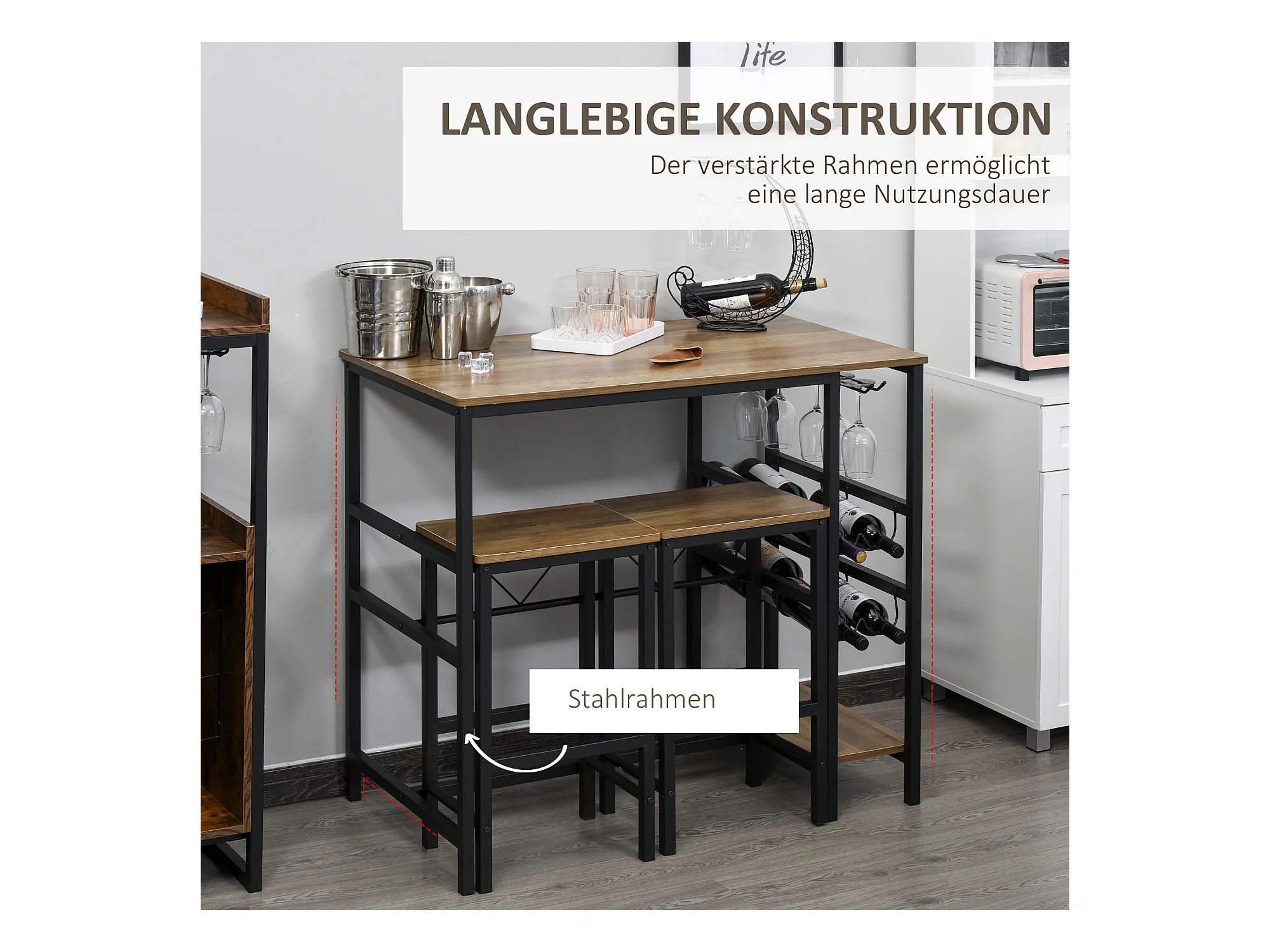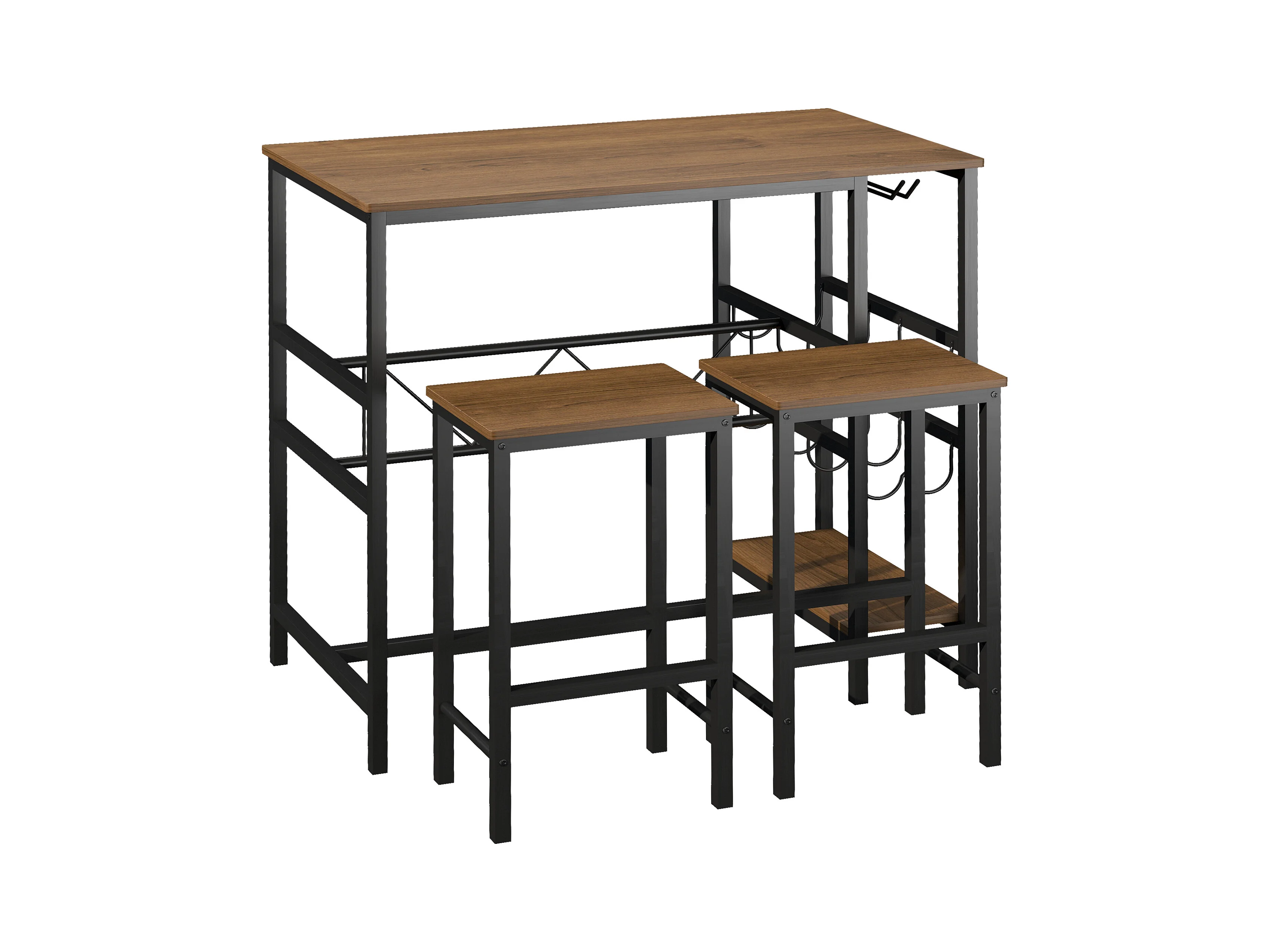 Conjunto de bar de 3 peças com mesa de metal MDF e 2 bancos para cozinha e sala de estar em marrom rústico