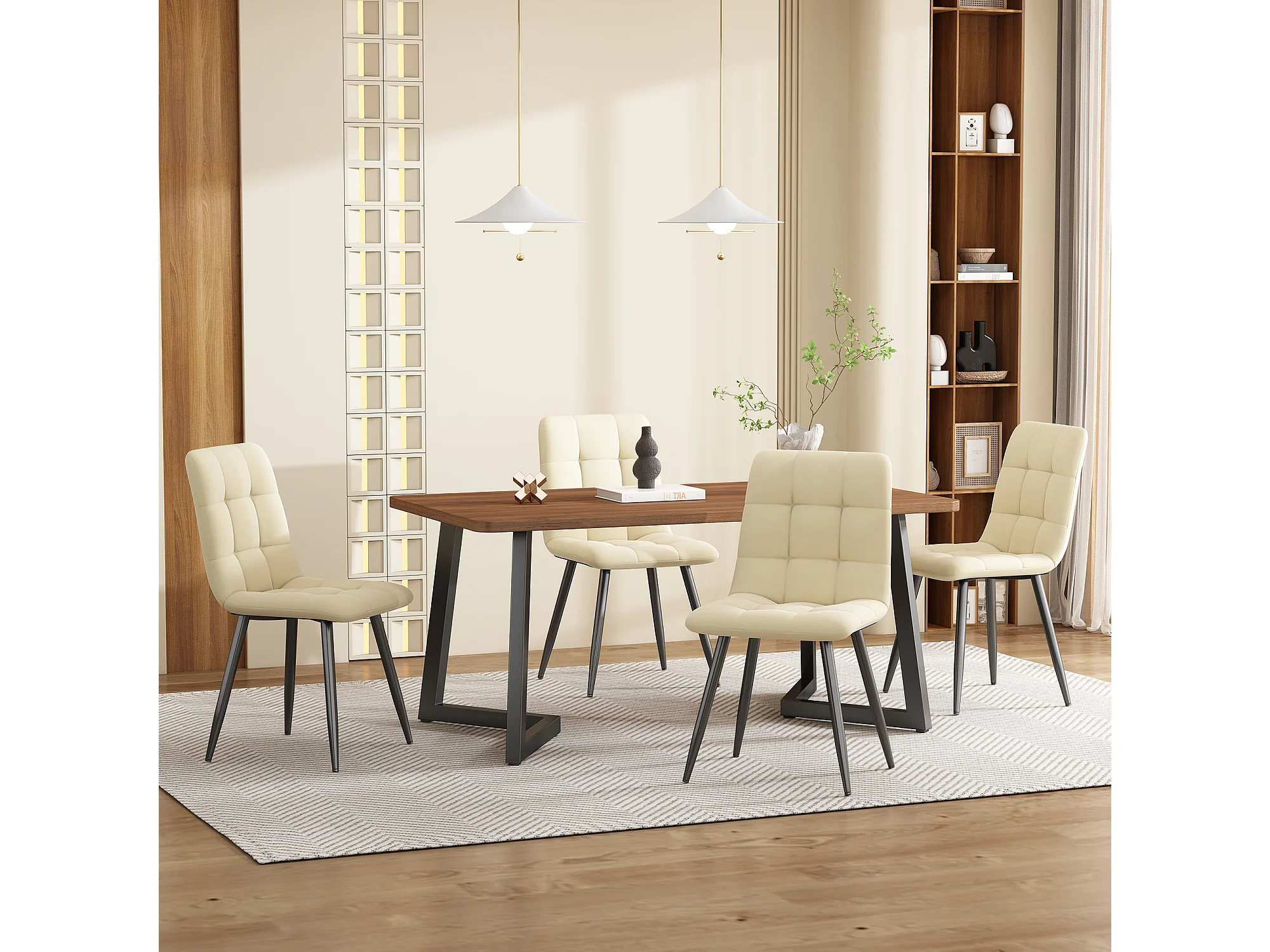 Conjunto de jantar com 5 peças, mesa de 117 x 68 cm, pernas de metal em MDF nogueira, cadeiras de veludo bege