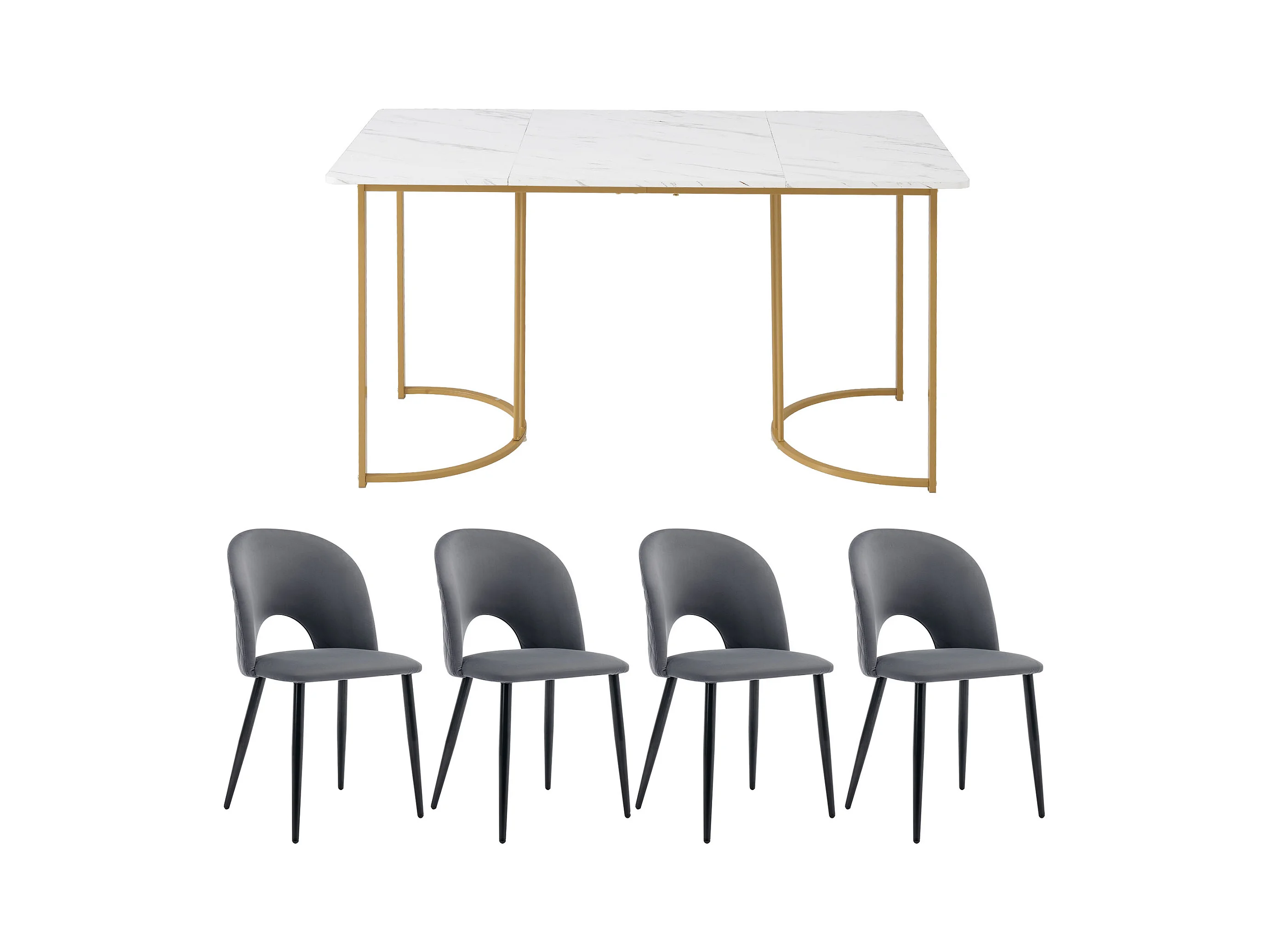 Conjunto de jantar de 5 peças, mesa de MDF 140×80 cm + 4 cadeiras de veludo cinza, pés de metal dourado