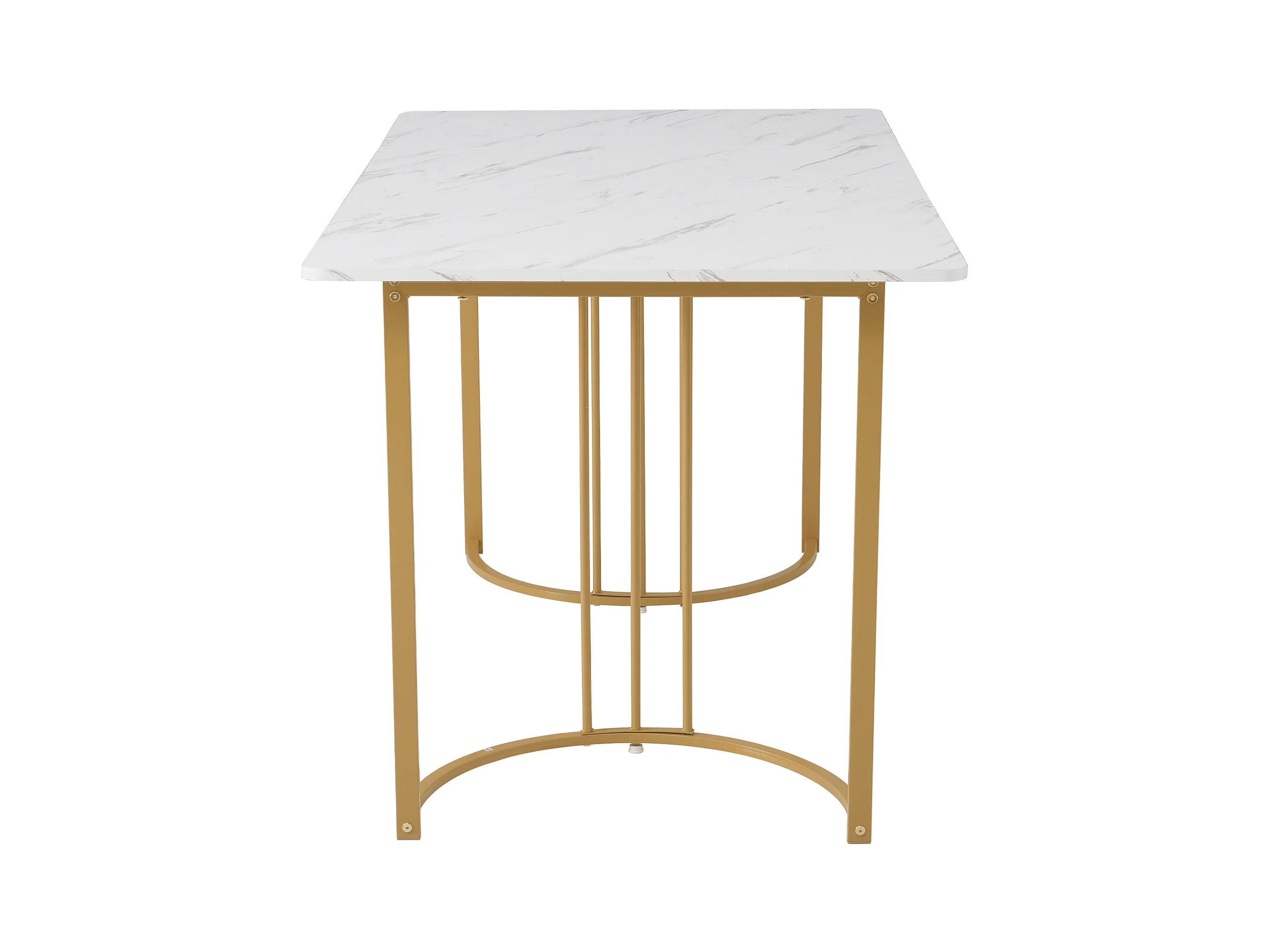 Conjunto de jantar de 5 peças, mesa de MDF 140×80 cm, pernas de metal dourado, cadeiras de veludo bege