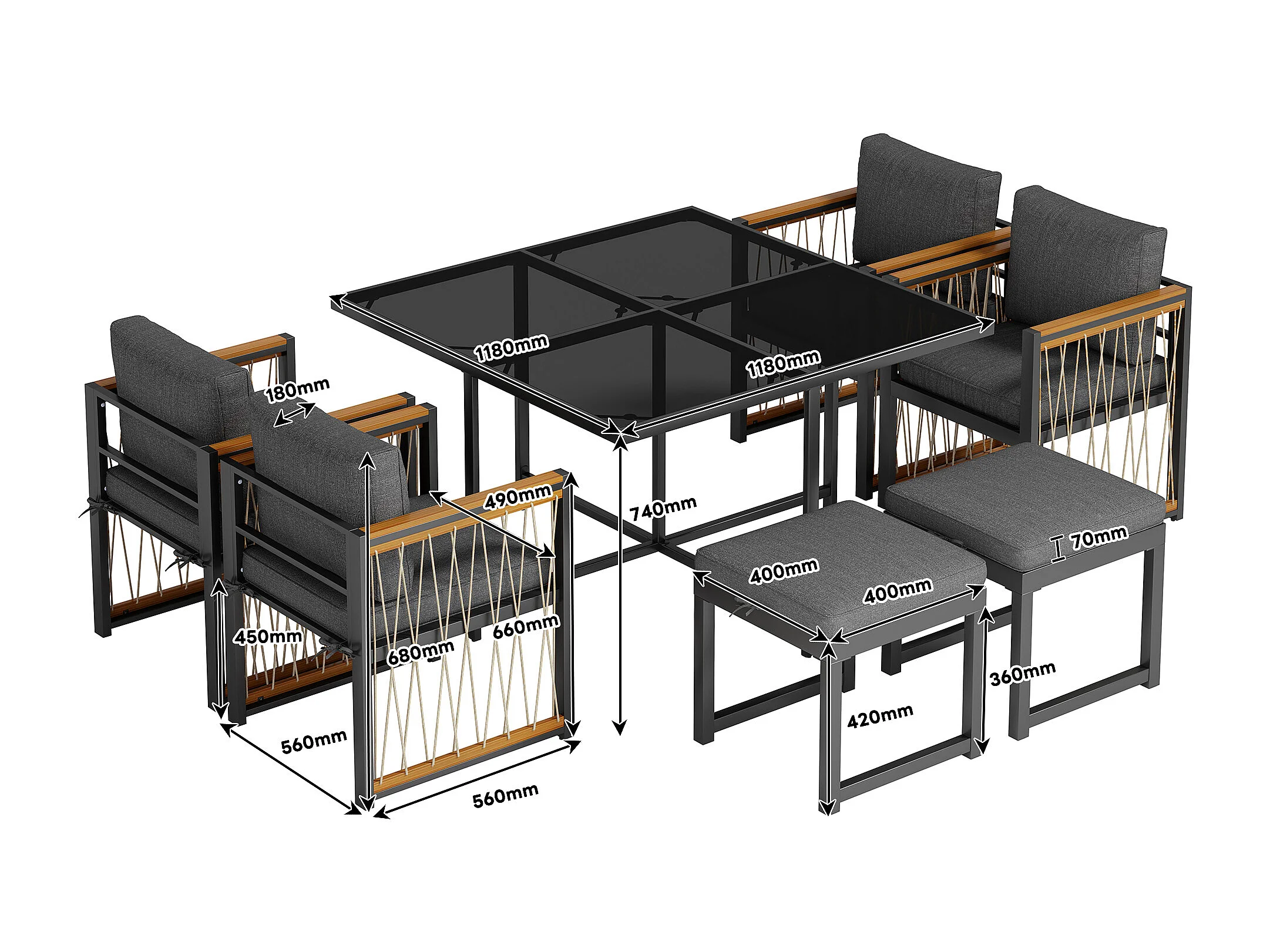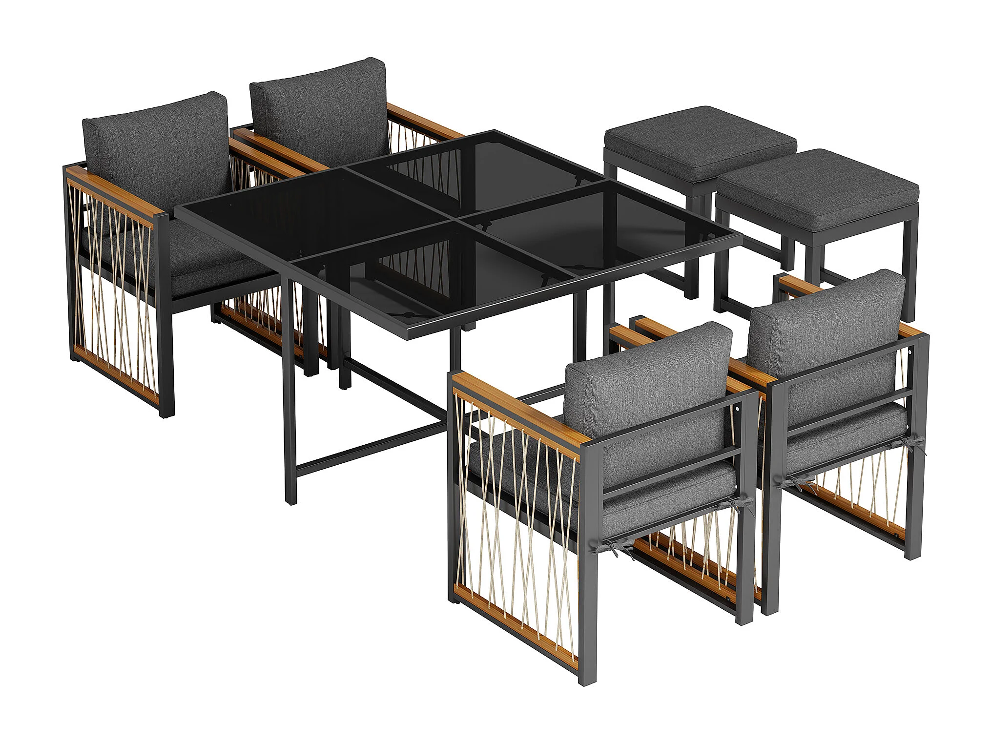 Conjunto de jantar de jardim para 6 pessoas, mesa de vidro temperado, estrutura em ferro galvanizado, 4 cadeiras, 2 bancos, 1 mesa, cinza