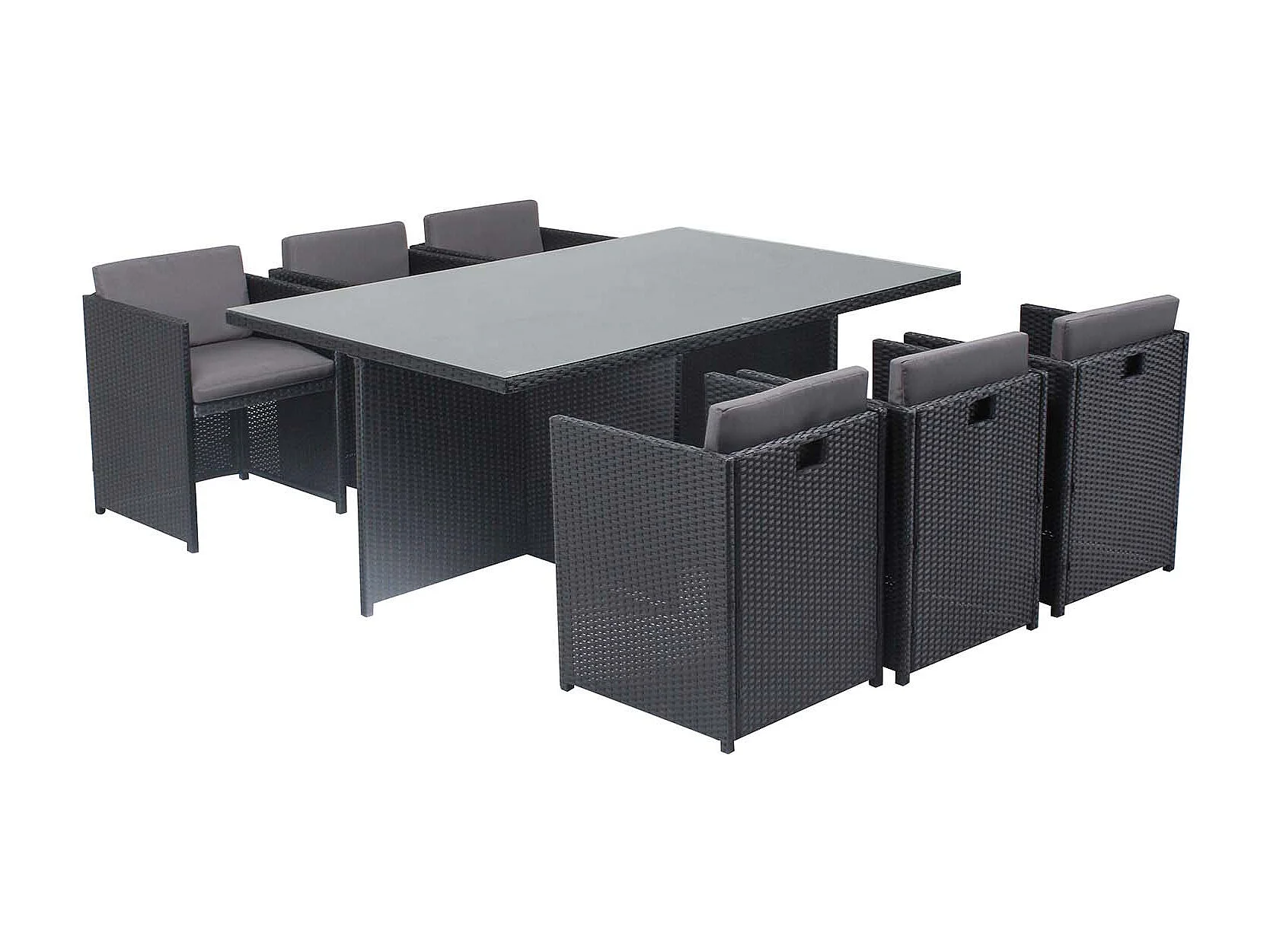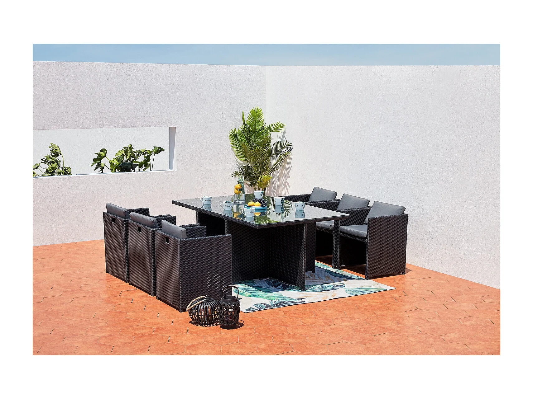 Conjunto de Jardim 6 Lugares em Vime Sintético Preto/Cinza MIAMI - Mesa de Vidro Removível, Cadeiras Confortáveis com Almofadas Resistentes à Água