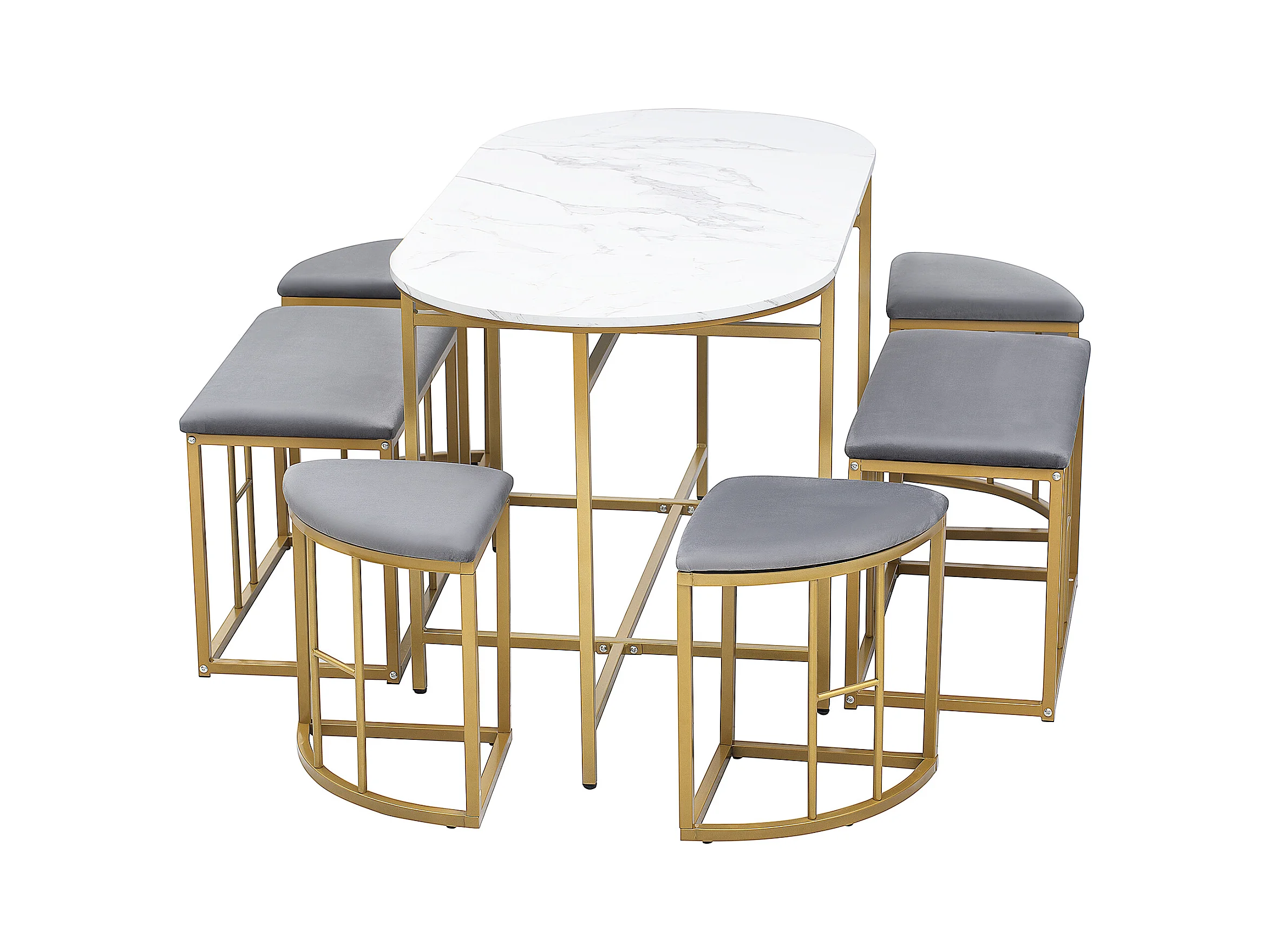 Conjunto de mesa 6 peças 140×70 cm MDF branco + 4 banquetas pequenas + 2 banquetas grandes metal dourado
